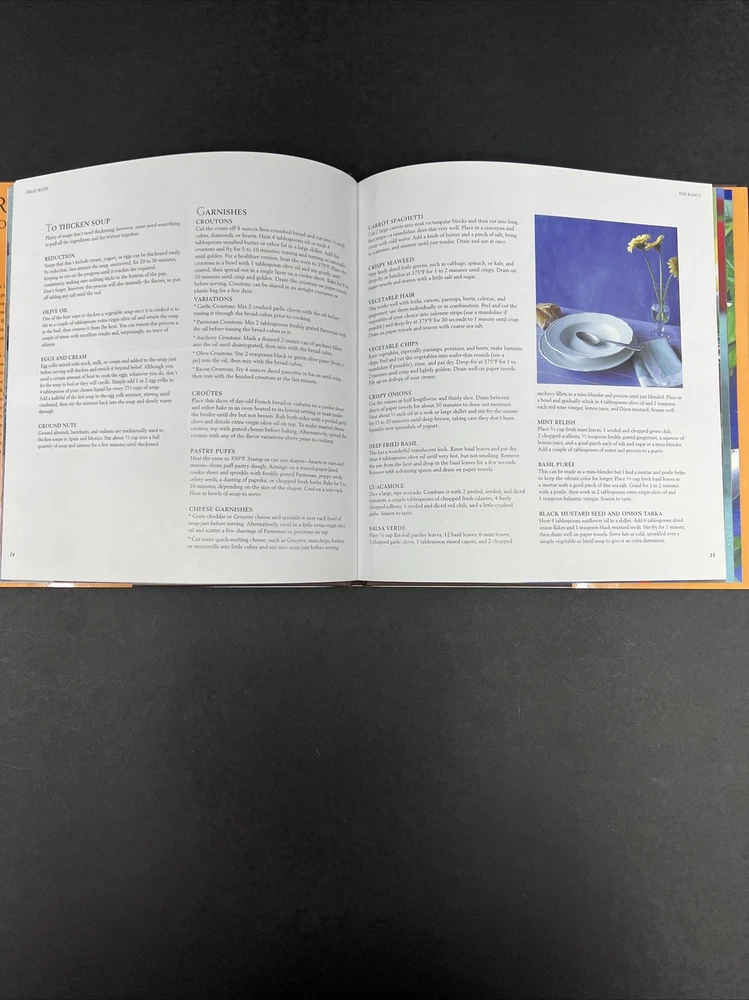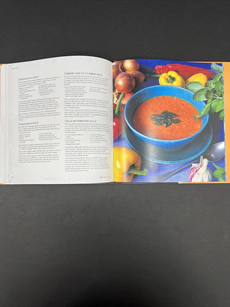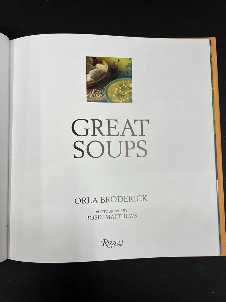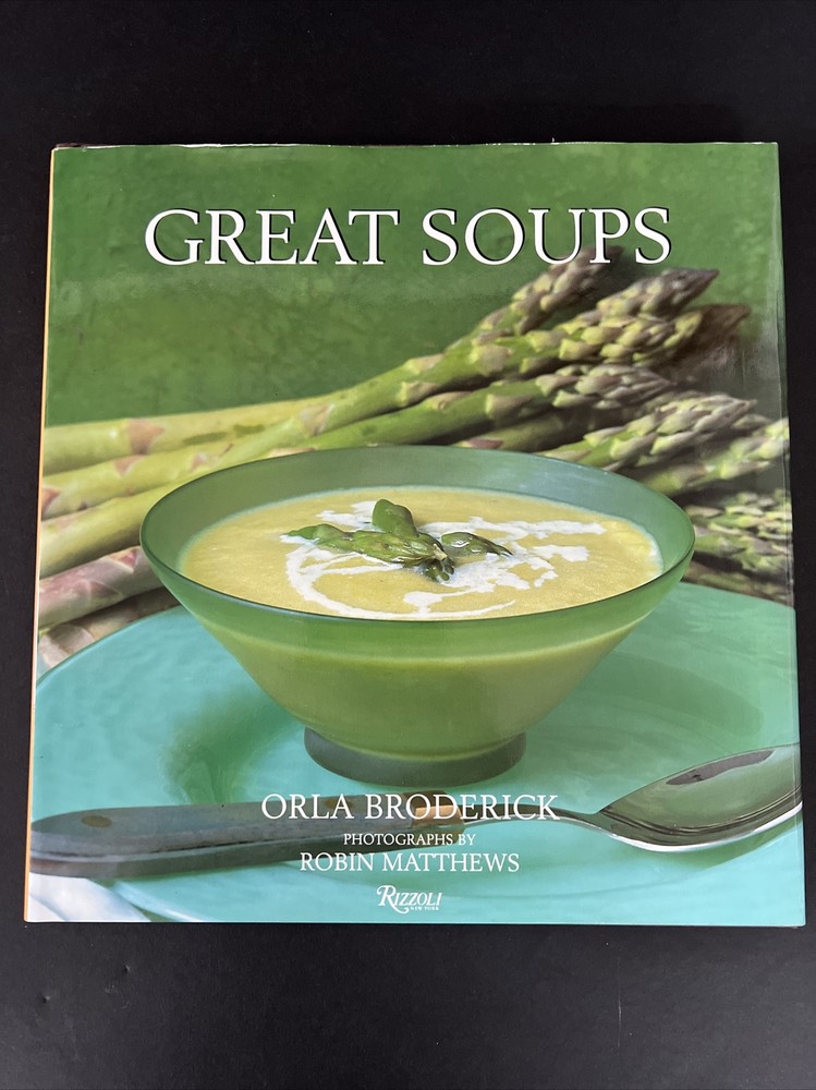 Great Soups is a vintage hardcover cookbook published by Rizzoli International Publications, Inc. in 1999. Written by Robin Matthews and Orla Broderick, the book contains 64 pages of illustrated soup recipes. It is intended for young adults and adults and is the first edition of the Soup series. The book features a dust jacket and is written in English. It is a nonfiction cookbook with a focus on cooking courses and dishes, soups and stews, cooking by ingredient, and general food topics.