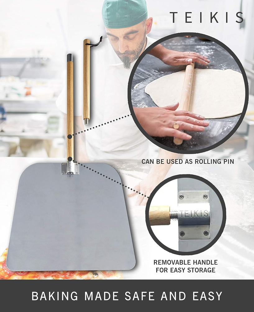 Make artisan pizzas like a pro ; Get the perfect slice every time with the finest baking tool you need to add in your kitchen, the Pizza Cutter Rocker and Pizza Peel Combo Set ; The pizza cutter rocker included in this set slices smoothly through your pizza crust without ruining your pizza toppings while the pizza peel lets you easily lift freshly baked pizza right out of the oven ; These tools will make you feel like you've moved to Napoli to perfect the art of pizza making Slice, dice, mince and chop with this multipurpose cutting tool ; Impeccably constructed to slice through thin crust and deep-dish pizzas, this slicer would give you 8 pizza slices in just 4 simple strokes ; And it doesn’t stop there, this blade rocker is also perfect for dicing, slicing, mincing and chopping vegetables, herbs, fruits, nuts and more ; Use it to divide dough, chop your choice of toppings, bake the pizza and finally cut it with this sleek cutter Achieve pro-level baking with this culinary tool ; Our premium peel features a thin 14 x 16 inch aluminum blade with a durable wooden handle allowing it to outperform all others in efficiency ; The thin sheet lets you easily slide your pizza, bread and pastries smoothly in and out of the oven and the wooden handle provides a good grip and minimal heat transfer so you can hold it comfortably while effortlessly transferring your baked goods The heavy duty pizza cutter is ergonomically crafted with a sharp metal rocker blade providing you with a clean and quick cut every time while its wooden handle gives a good base to easily cut through your pizza ; To make baking more convenient, the baking peel also comes with an adjustable wooden handle to accommodate to your needs in rotating and removing your pastries, pizzas and breads from your oven Teikis Pizza Cutter & Peel Set comes with a 2-Year Warranty ; This versatile baking tool set would surely make an excellent & perfect gift for the baking enthusiasts in your life or you can have it for yourself to make homemade pizza, bread and pastry easier and safer Product Description PIZZA METAL SLICER AND PADDLE BOARD PAN WITH WOOD HANDLE EASY TO USE The pizza cutter rocker slices smoothly through your pizza crust without ruining your pizza toppings while the pizza peel lets you easily lift freshly baked pizza right out of the oven. MULTIFUNCTIONAL Slice, dice, mince and chop with this multipurpose cutting tool. Perfect for dicing, slicing, mincing and chopping vegetables, herbs, fruits, nuts and more. HEAVY DUTY Our premium peel features a thin 14x16-inch aluminum blade with a durable wooden handle allowing it to outperform all others in efficiency. ERGONOMIC Comes with an adjustable wooden handle to accommodate to your needs in rotating and removing your pastries, pizzas and breads from your oven. MAKE ARTISAN PIZZAS LIKE A PRO NO MESS Our pizza cutter is crafted with a sharp metal rocker blade providing you with a clean and quick cut every time while its wooden handle gives a good base to easily cut through your pizza. BAKING MADE SAFE The thin sheet lets you easily slide your pizza, bread and pastries smoothly in and out of the oven and the wooden handle provides a good grip and minimal heat transfer so you can hold it comfortably while effortlessly transferring your baked goods. VERSATILE Get the perfect slice every time with the finest baking tool you need to add in your kitchen. Great for making homemade pizza, bread and pastry.