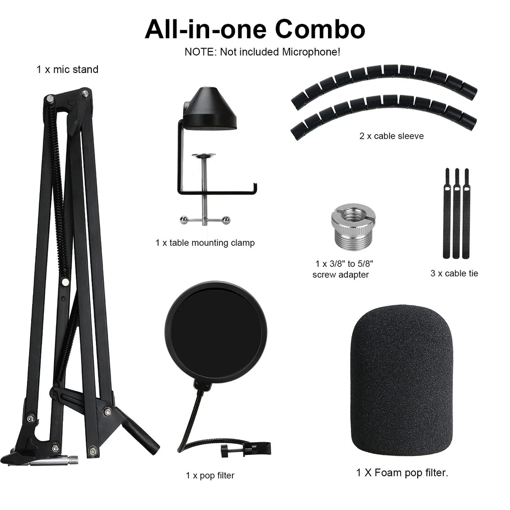 If you are looking for a professional, broadcast quality microphone boom like you might see in a radio station control room 's heavy duty suspension boom scissor arm stand is your best choice. Mic stand for Rode Podmic is built with firm metal, double-braced arms and strong spring and can be used for different conditions. Professional Mic Cover Protect your favorite mic: Protect your microphone from smell of drool, surplus spit, accumulation of saliva. Easy & quick mount / unmount: Screw rotating clamp with scratch-proof gripper and rubber mat offers you a friendly and easy mounting and demounting. This foam wind screen is maded of high-density foam which can protect your mic from dust damage. Picks your original sound only. Say goodbye to complicated post-production. Professinal Pop Filter: Banish the dreaded hissing and lisping sounds that come when pronouncing the letter "S" and blocks those ugly "plosives" that follows "B" and "P". It is a great item for singers, streamers and actors Cable Management Sleeve Cable Sleeve can organized your mic power cord, ensure the cord doesn't get tangled. Looks more beautiful and neat. Simply gather your cables with boom arm's pipe. Force open the end of the cable sleeve and lay your wires and pipe inside. The two cable steeve should be installed in the two positions of the mic stand. Hiding cables with these wraps has never been so easy, your cable mess is now organized. Package included: 1 x Microphone stand 1 x Pop filter for microphone rodepod mic 1 x Foam windscreen for microphone rodepod mic 1 x Mic stand adapter 1 x Upgraded Table Mounting Clamp 2 x Cable organizer 3 x Velcro cable [All-in-one Combo]: Package includes all the items for studio recording and live sound: 1 x heavy duty microphone stand, 1 x pop filter, 1 x windscreen, 2 x cable organizer, 3 x velcro cable ties for Rode Podmic microphone. [Mic Stand]: Bold-spring protects microphone from shaking, suddenly dropping and making noise. Suspension boom scissor arm can keep the microphone in any position you want. [Mic Cover]: Professional foam windscreen with double layered screen pop filters filter out all unwanted background noises. [Compatibility]: The reach on this mic boom is 27"/70cm from base to mount, max desktop thickness: 2.7"/7cm, max load:1.6kg. Convenient to use in any scene. [Excellent Details]: Microphone table clip with soft cushion protect your furniture, 3/8"-16 female to 5/8"-27 male screw thread adapter never worry about installation problems.