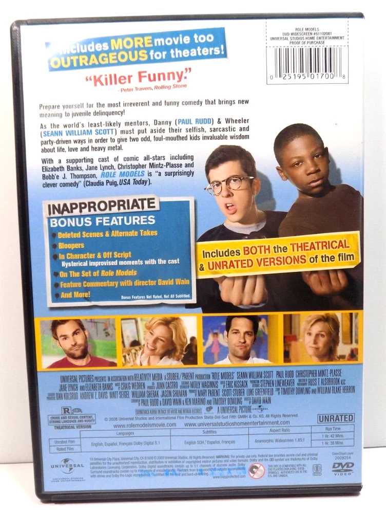 Role Models (Unrated) - DVD Widescreen Edition Universal 2008 Rated R Run time - 1 hour and 42 minutes Good condition DVD - Good Case - Good Inlay - None From smoke free environment Pictures are of actual item listed Ships same day or next day after purchase