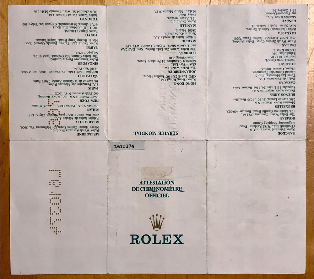 ROLEX Genuine Certificate Part: 564.00.300.7.89 Serial: L610374 Year: 1989 Private Collection ORIGINAL ---------------------------------------------- These products are being sold for Collection purposes ONLY. I am Member of WTA since 1998 I am not affiliated with Rolex . I am not an official Rolex Dealer Questions : Please ask us all the questions you have before bidding. ------------------------------------------------- We sell products that might have been used or otherwise known as "take-offs". Some parts are like new or very gently used, and others show signs of wear and may need to be cleaned or polished. Please see pictures for more details. We try to take pictures of any defects the item may have. If you have any additional questions, feel free to ask us and we will get back to you as soon as possible. Customer Service If for any reason you have an issue with our product, please choose “Contact Seller” via eBay before leaving negative feedback or opening a case. We promise to resolve any issues as soon as possible. Positive feedback and 5-star seller ratings are extremely important to us as we are looking to provide outstanding products and services to our customers. Returns We reserve the right to charge a 10% restocking fee on all returns. Shipping and handling charges are not refundable. The buyer is responsible for the return shipping fee. Shipping We typically ship orders Monday through Friday (except for Holidays) within 3 business days of receipt of cleared payment. Please make sure your shipping address is correct before sending payment. All orders are shipped with a tracking number. You will receive and email with it as soon as your order ships. Please allow a few extra days for delivery if there is a weather problem. IMPORTANT NOTE FOR INTERNATIONAL BUYERS All our goods are shipped from Spain, but we are a UK based eBay shop, sales to the European community might be subject to VAT. Please see the link below: VAT on eBay purchases for EU buyers | eBay.com BUYERS OUTSIDE THE EUROPEAN UNION: The tariffs, duties and import taxes are not included in item price or shipping charges. These charges are the responsibility of the buyer. Refer to the customs authorities of your country to inquire about these costs before bidding on an item or buying it. These fees are usually charged by the carrier or when the buyer takes the item and should not be confused with additional shipping costs.