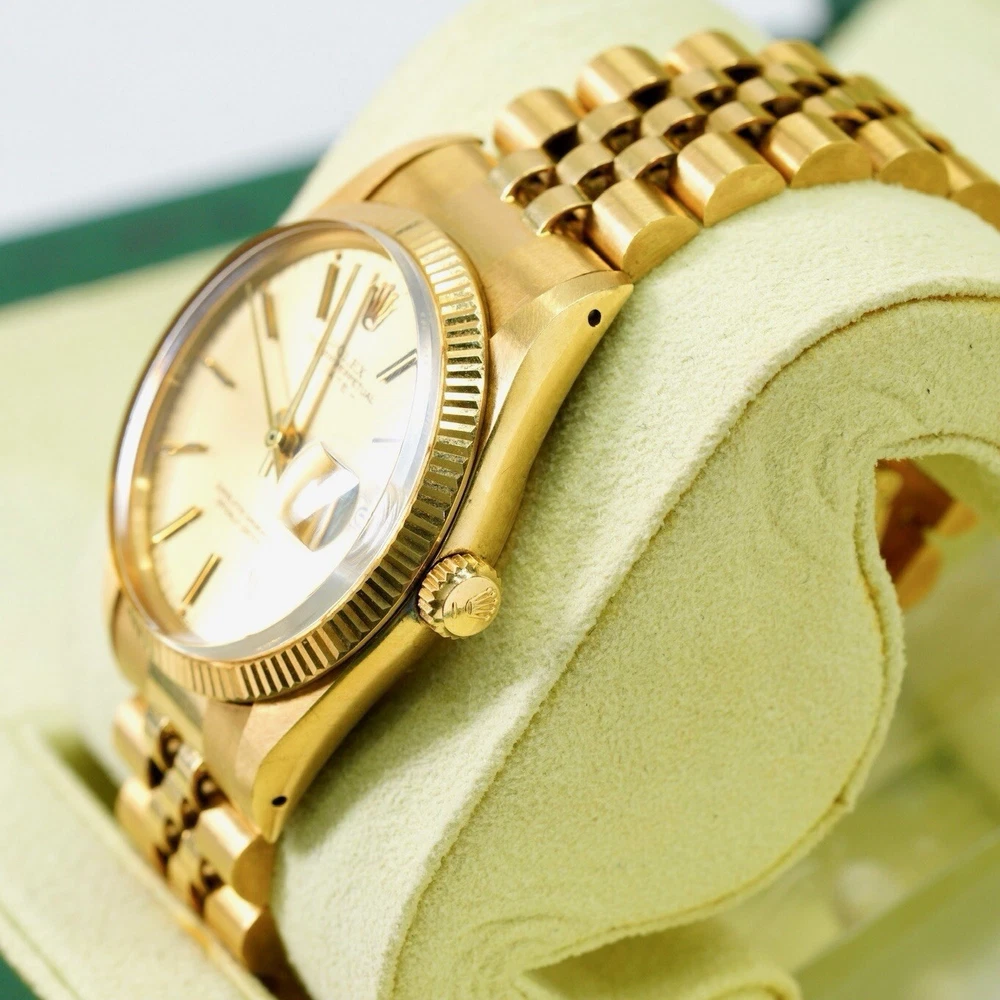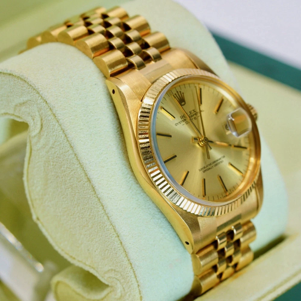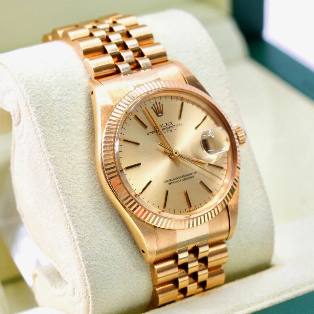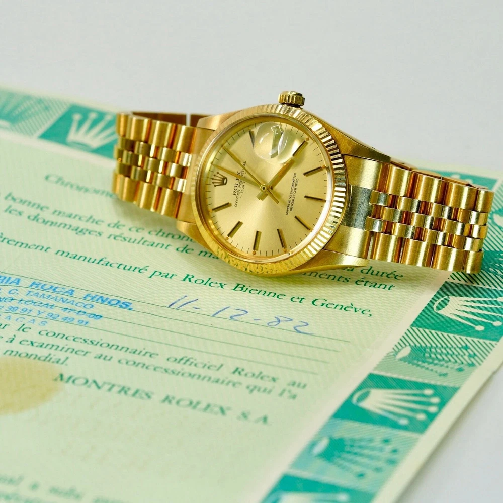 The Rolex Date 15038 from 1982 is a timeless piece that exudes classic elegance and sophistication, embodying Rolex’s legacy of quality and precision. Crafted in 18K yellow gold, this vintage watch features a 34mm case with a fluted bezel, a date function, and an iconic Rolex dial that has remained a favorite among collectors and enthusiasts for decades. In pristine pre-owned condition, this piece has been meticulously maintained with no hairlines on the crystal and no scratches on the case, reflecting the exceptional care it has received over the years. Rolex Date 15038 Year: 1982 Mint pre-owned condition Clean crystal, no hairlines No scratches on case Comes with box & Pappers