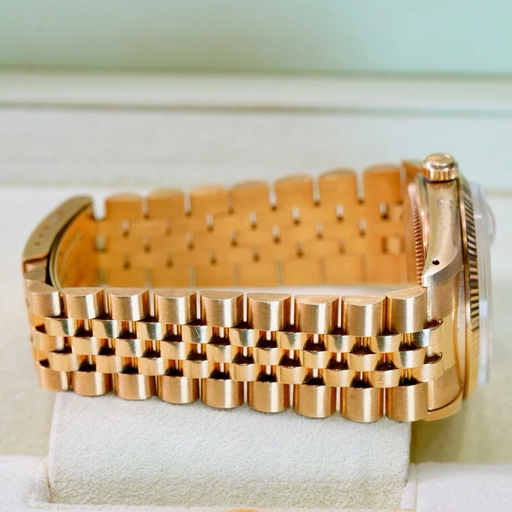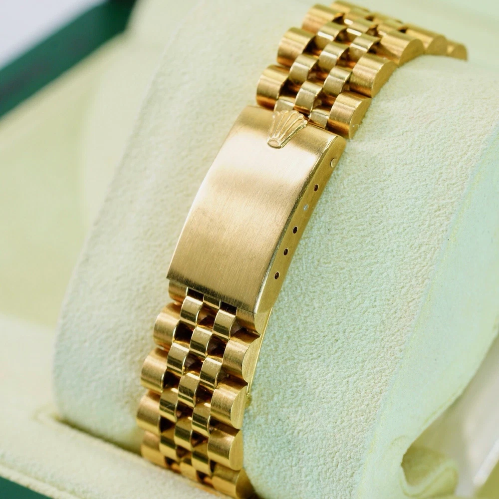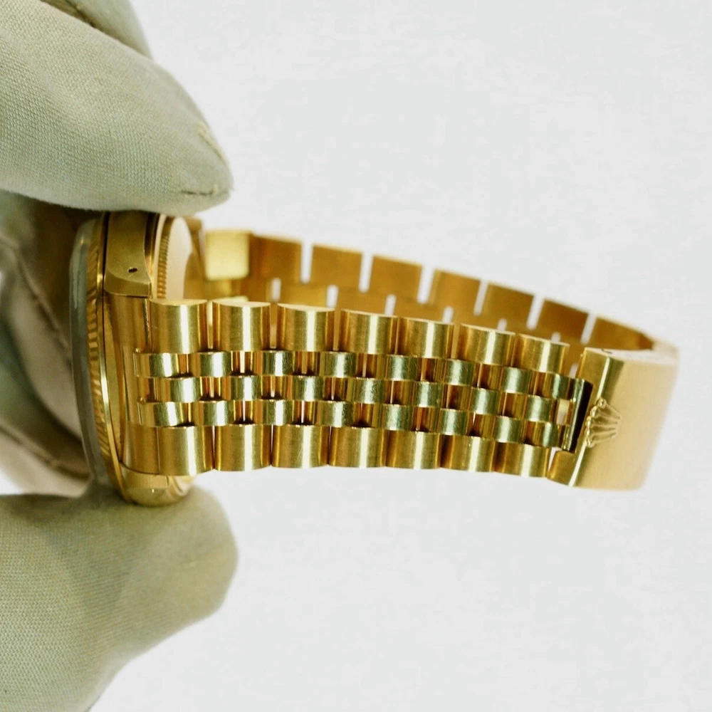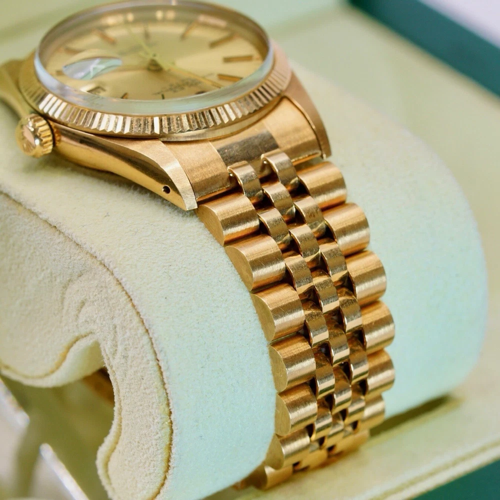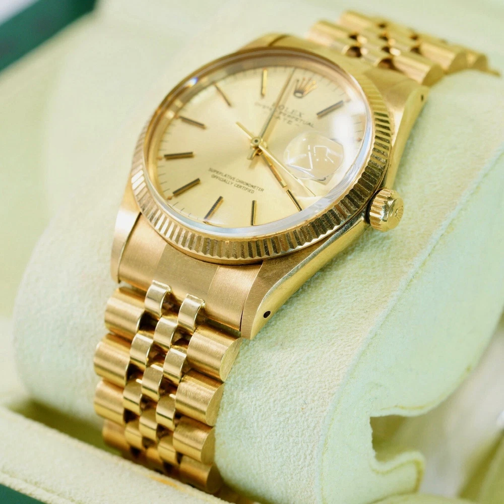 The Rolex Date 15038 from 1982 is a timeless piece that exudes classic elegance and sophistication, embodying Rolex’s legacy of quality and precision. Crafted in 18K yellow gold, this vintage watch features a 34mm case with a fluted bezel, a date function, and an iconic Rolex dial that has remained a favorite among collectors and enthusiasts for decades. In pristine pre-owned condition, this piece has been meticulously maintained with no hairlines on the crystal and no scratches on the case, reflecting the exceptional care it has received over the years. Rolex Date 15038 Year: 1982 Mint pre-owned condition Clean crystal, no hairlines No scratches on case Comes with box & Pappers