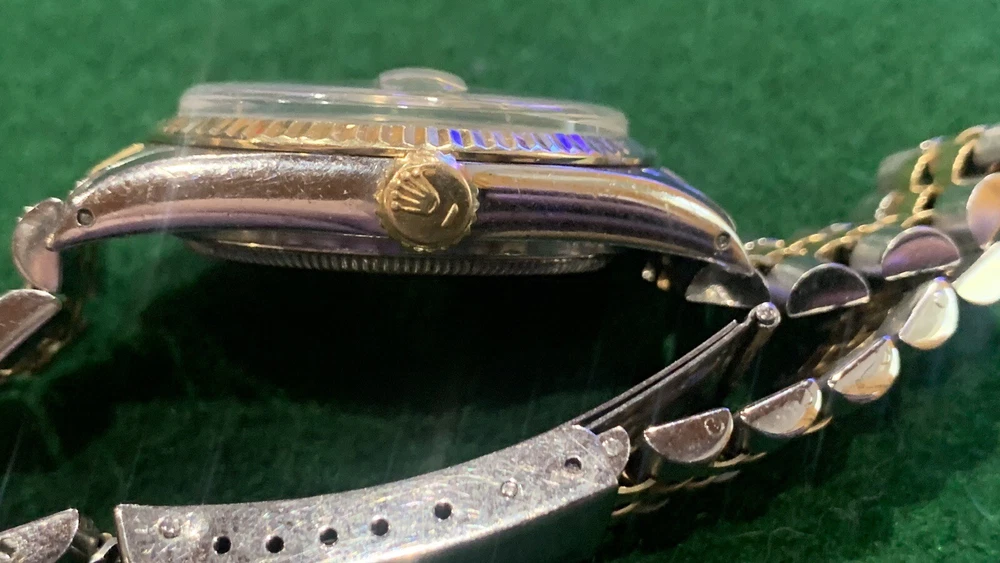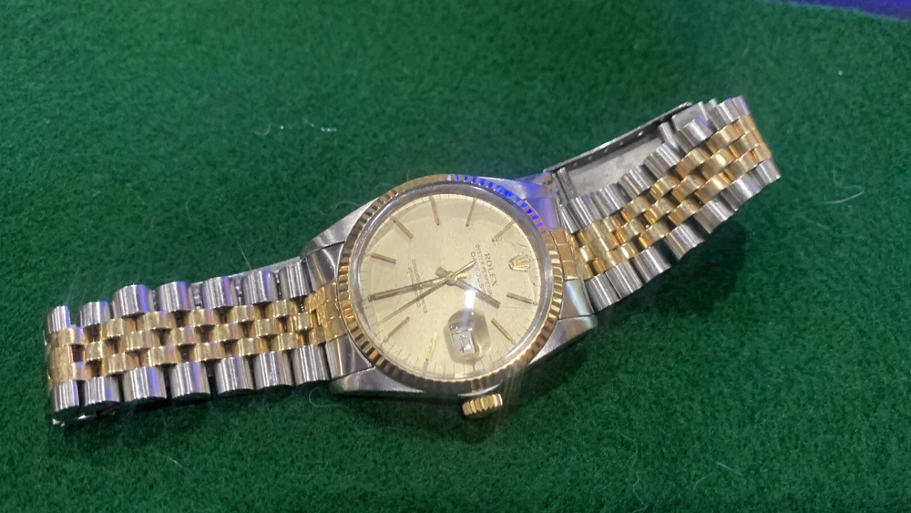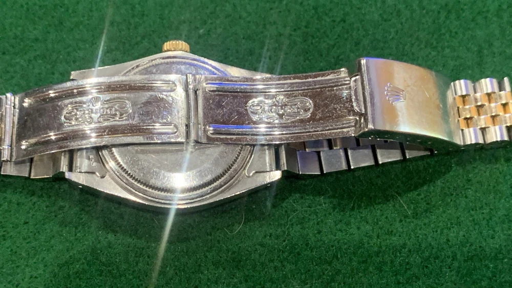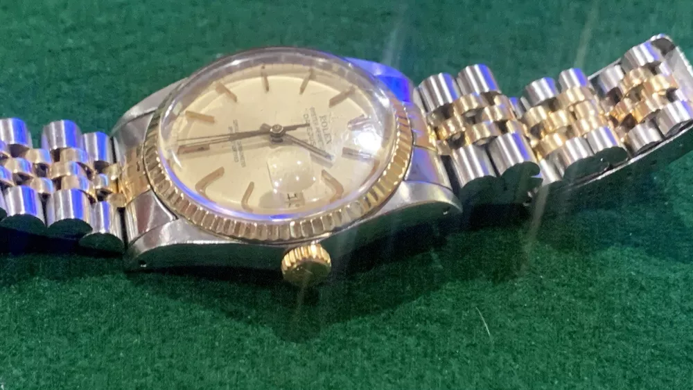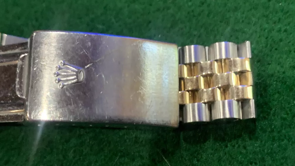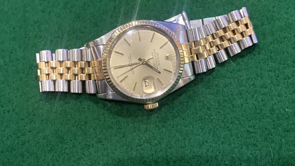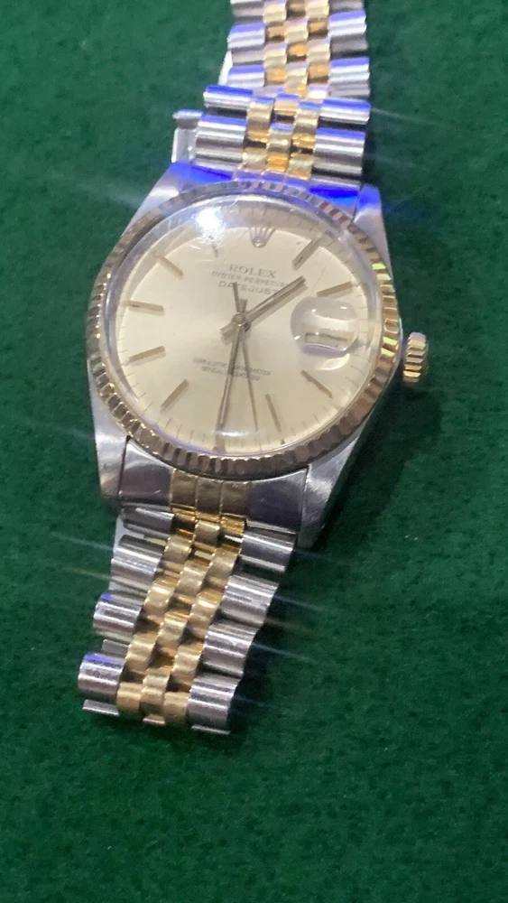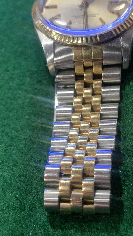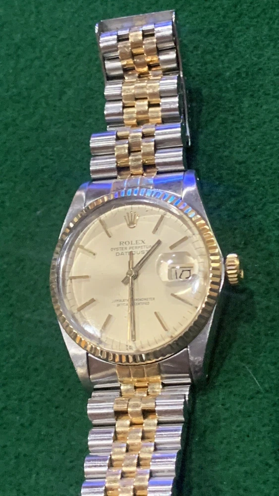 Available now is this excellent Rolex DateJust 16013 from 1979 Below are the features. • Model: Rlx Datejust 16013 . Serial #7,400,000 series . Year: 1983 • Movement: Rlx Calibre 3035 (automatic movement with quickset date) • Case: 36mm stainless steel with 18k yellow gold fluted bezel • Bezel: 18k yellow gold, fluted design • Dial: Silver dial with applied hour markers and luminous hands • Hands: Gold-tone hands with luminescent coating • Crystal: Acrylic crystal with Cyclops lens over the date • Water Resistance: 100 meters (330 feet) • Bracelet: Two-tone (Rolesor) stainless steel and 18k yellow gold Jubilee bracelet with a folding clasp • Functions: Time, date display at 3 o’clock (quickset), power reserve of approximately 48 hours • Special Features: Classic two-tone design with champagne dial, iconic fluted bezel, versatile and elegant for both formal and casual occasions This comes with No Box and papers. It looks sharp, and runs excellent. Has recently been serviced. Crystal has some small scratches, that can be buffed but is not overly noticeable. See photos measurements on bracelet I’m 7-1/2” inches and there is still room to fit larger to 8”.