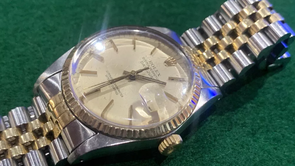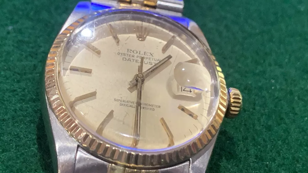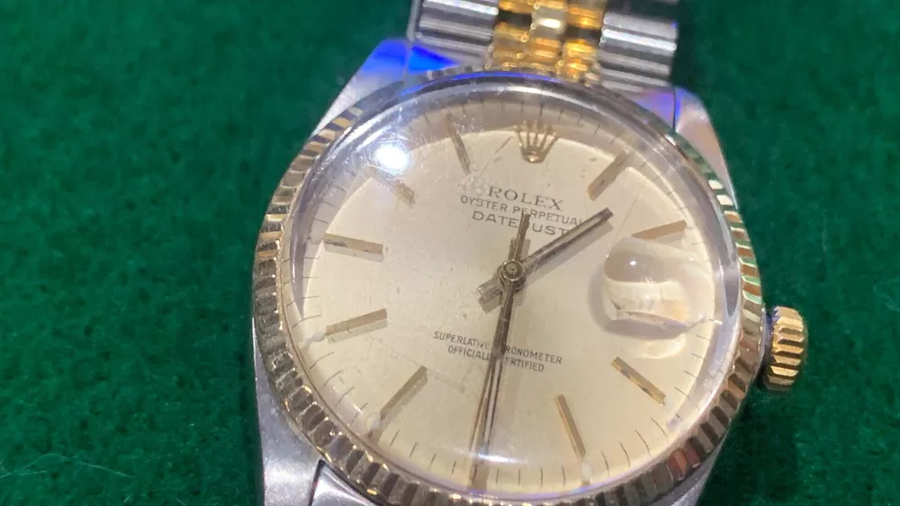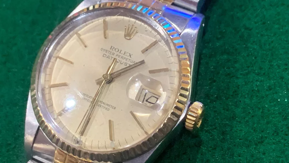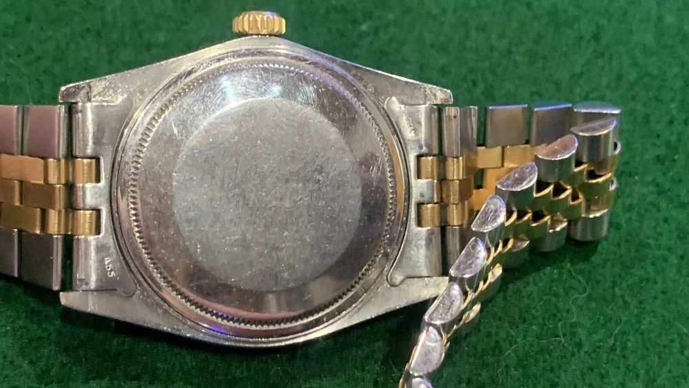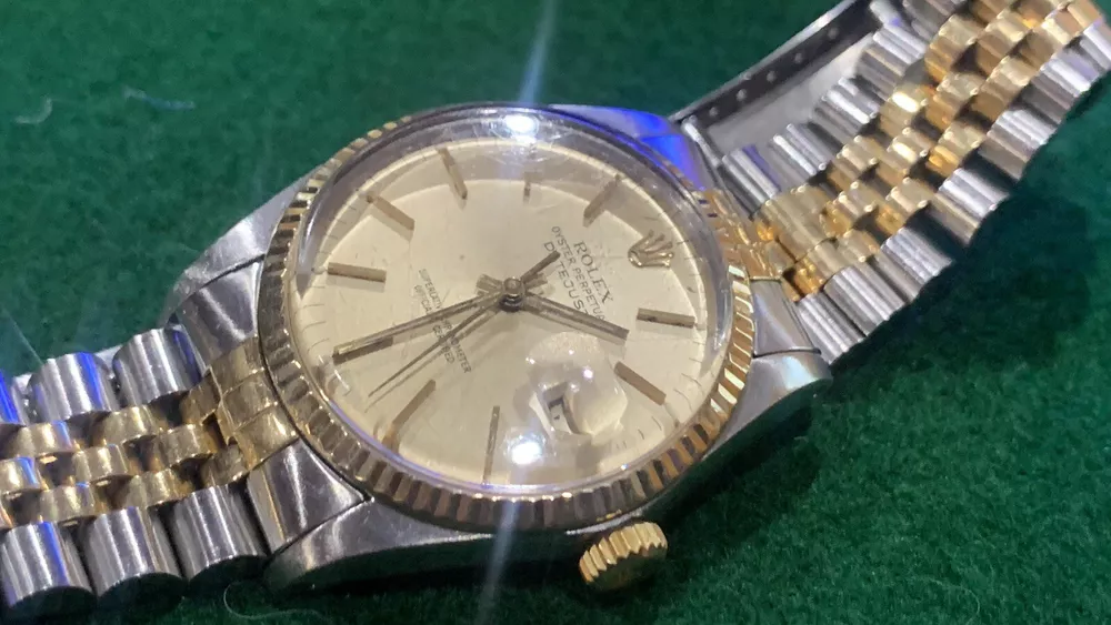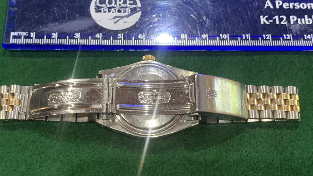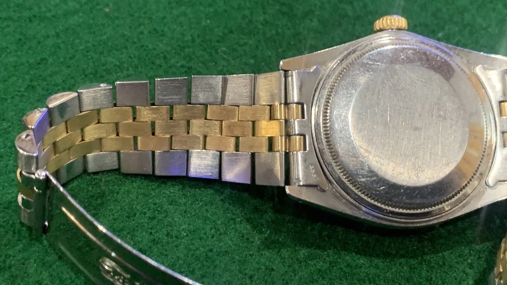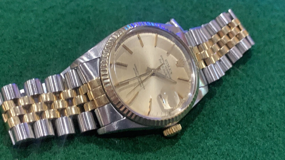 Available now is this excellent Rolex DateJust 16013 from 1979 Below are the features. • Model: Rlx Datejust 16013 . Serial #7,400,000 series . Year: 1983 • Movement: Rlx Calibre 3035 (automatic movement with quickset date) • Case: 36mm stainless steel with 18k yellow gold fluted bezel • Bezel: 18k yellow gold, fluted design • Dial: Silver dial with applied hour markers and luminous hands • Hands: Gold-tone hands with luminescent coating • Crystal: Acrylic crystal with Cyclops lens over the date • Water Resistance: 100 meters (330 feet) • Bracelet: Two-tone (Rolesor) stainless steel and 18k yellow gold Jubilee bracelet with a folding clasp • Functions: Time, date display at 3 o’clock (quickset), power reserve of approximately 48 hours • Special Features: Classic two-tone design with champagne dial, iconic fluted bezel, versatile and elegant for both formal and casual occasions This comes with No Box and papers. It looks sharp, and runs excellent. Has recently been serviced. Crystal has some small scratches, that can be buffed but is not overly noticeable. See photos measurements on bracelet I’m 7-1/2” inches and there is still room to fit larger to 8”.