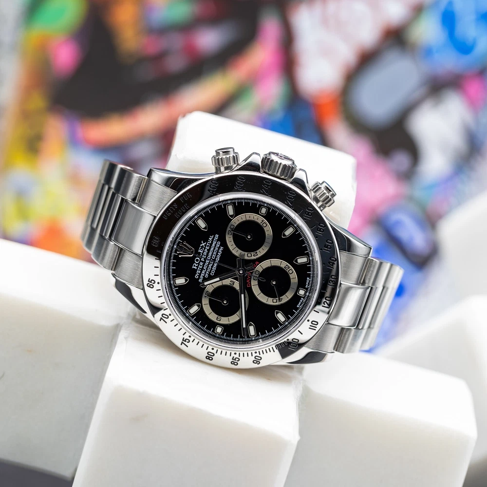 Up for sale or trade is a full set black dial K serial Daytona from 2003, with the correct box, papers and accessories. It has just come back from a full service and is ready for a new home. This thing is a time capsule! For those that remember what the Daytona was before the ceramic bezel. This one is special indeed. Get it while you can! Watch is in incredible condition and running great. Comes fully linked with all the accessories. Watch just returned from a full Rolex service and comes with the Rolex service card and two year Rolex service warranty. Nothing is needed on this watch, it’s ready to go! We love everything about timepieces and thoroughly appreciate helping others discover the enjoyment of this pastime. Whether it’s helping you find your grail, or the next watch to fill that empty slot in your watch box, we consider it a privilege to be part of your journey. Our aim is to be as fully transparent as possible in all our listings. Please let us know if you have questions about this watch or any of the others we have for sale. We’re always willing to entertain trade values up or down. We look forward to helping you secure your next timepiece! INCLUDED Rolex Green Leather Box Rolex International Warranty Paperwork (Dated 2003, K Serial) Rolex Cosmograph Daytona Instruction Manual Rolex Care Booklet Rolex Green Card Sleeve Rolex Superlative Chronometer Red Hang Tag Rolex Cleaning Cloth Rolex Plastic Bezel Protector OFFERS Our pieces are always priced very competitively to the market. However, you are always welcome to make a reasonable offer. SHIPPING All watches are in stock and will usually be shipped to an eBay authenticator within 2 business days of payment verification. We offer free, fully insured FedEx shipping with tracking on all purchases with a US delivery destination. We also ship internationally via fully insured FedEx International Priority. However, buyers will be responsible for any potential import duties and customs fees applied by their country. All watches are carefully and professionally packaged to guarantee the safe arrival of your new timepiece. TAX eBay subjects all purchases made in America to its state’s applicable sales tax. That amount will be determined once you make your order. International customers are responsible for taxes applied by their country. AUTHENTICITY With over a decade of experience in the industry, we at Watches of Charlotte pride ourselves on being a trusted name in the industry. We work with watchmakers to authenticate our watches so we can guarantee that all of our pieces are 100% authentic and original. All photos used in our listings are taken in-house and are of the actual timepieces being purchased. We fully stand behind the authenticity of every product we sell. For extra peace of mind, eBay also offers an Authenticity Guarantee. This means that every detail of your watch is inspected by independent experts before you receive it, so you can have complete confidence. Our commitment to providing exceptional service has garnered us a loyal, worldwide clientele and a 5-star ranking on eBay, Facebook and elsewhere - check our reviews! ABOUT US We love everything about watches and thoroughly appreciate helping others discover the enjoyment of this pastime. Whether it’s helping you find your grail or the next watch to fill that empty slot in your watch box, we consider it a privilege to be part of your journey. Our aim is to be as fully transparent as possible in all our listings. Please let us know if you have questions about this watch or any of the others we have for sale. We’re always willing to entertain trade values up or down. We look forward to helping you secure your next timepiece!