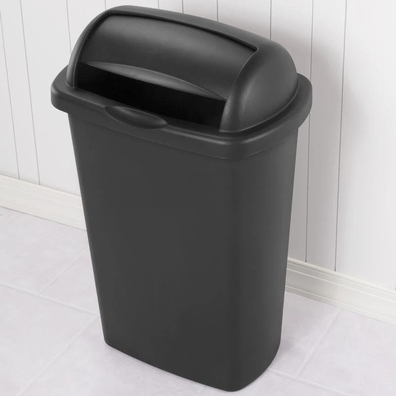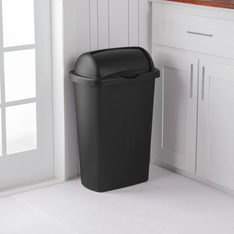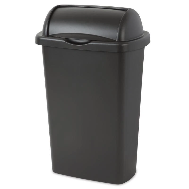 The Sterilite 13 Gallon Roll-Top Wastebasket features a lid that rolls up, stays open and returns closed, all with minimal effort. The large opening allows for disposal of oversized items while leaving the lid rolled up. The design coordinates with any kitchen décor and this wastebasket features an easy-to-clean textured surface. It accommodates a standard 13-gallon trash liner or it can be used to collect recyclable material. This Wastebasket is ideal for all areas of the home including kitchen, garage, basement or even the office. It's durable design will hold up to regular day-to-day use and confidently conceal contents. The overall assembled dimensions of this item are 18 3/8" L x 12 3/8" W x 28 3/8" H. Sterilite Adult Plastic 13 Gal. Roll Top Wastebasket Black: Outside Dimensions: 18 3/8" x 12 3/8" x 28 3/8" Large 13 Gallon capacity makes this the ideal size for kitchen use Single unit option Classic color to complement all décor - Black The Sterilite 13 Gal RollTop lid opens with a touch and stays open for easy disposal Lid rolls up, stays open and returns closed with minimal effort Coordinates with any kitchen décor Easy-to-clean textured surface Accommodates a standard 13-gallon trash liner Ideal for use in the Kitchen, Bathroom, Bedroom, Dorm Room, Mudroom or Basement BPA-free and phthalate-free Made of easy to clean plastic No batteries required