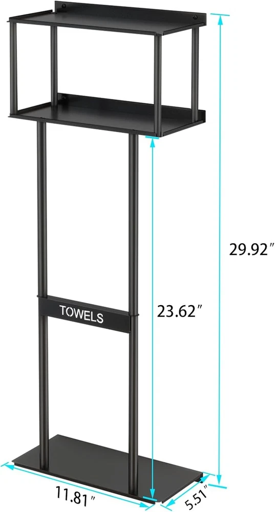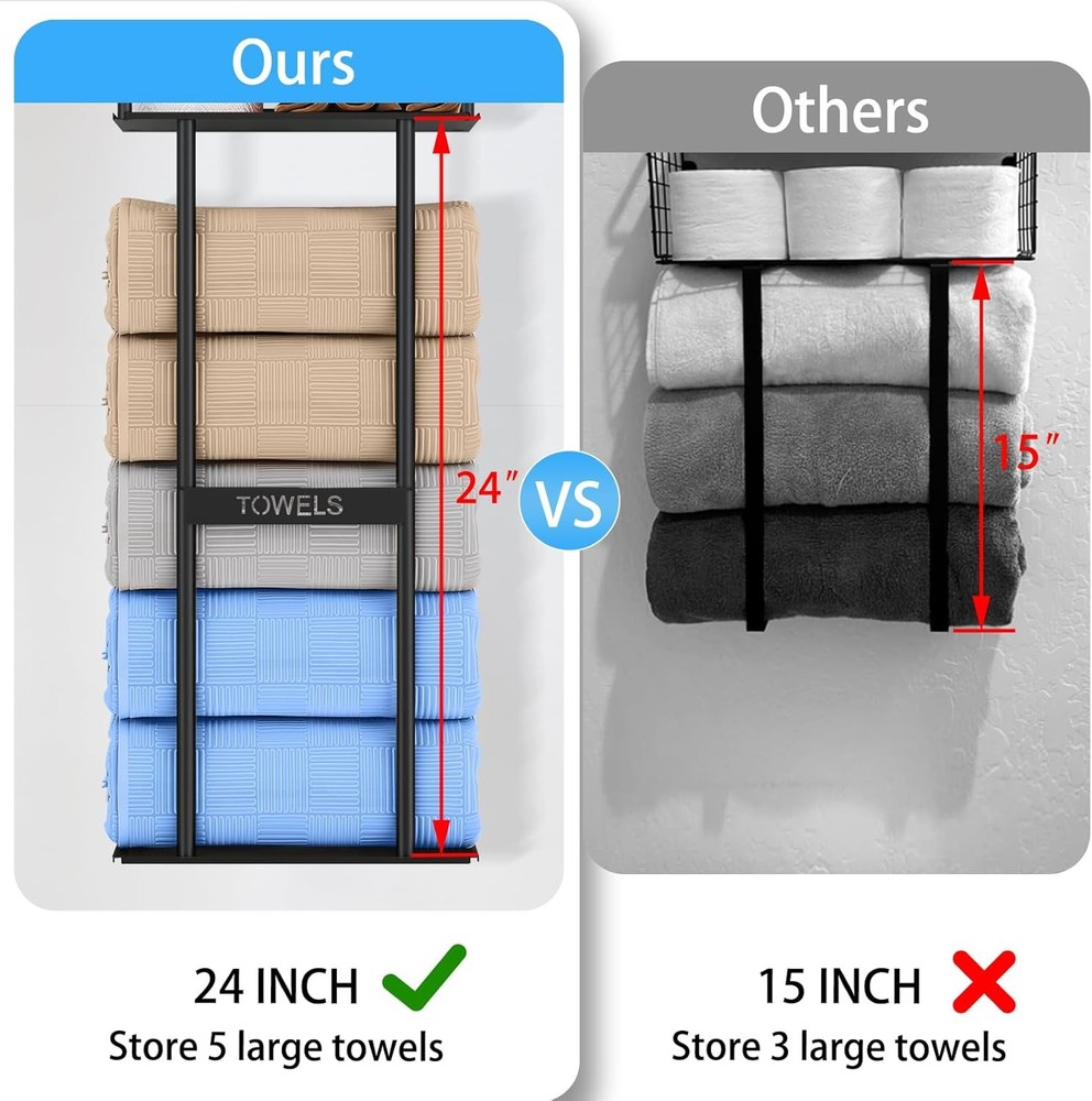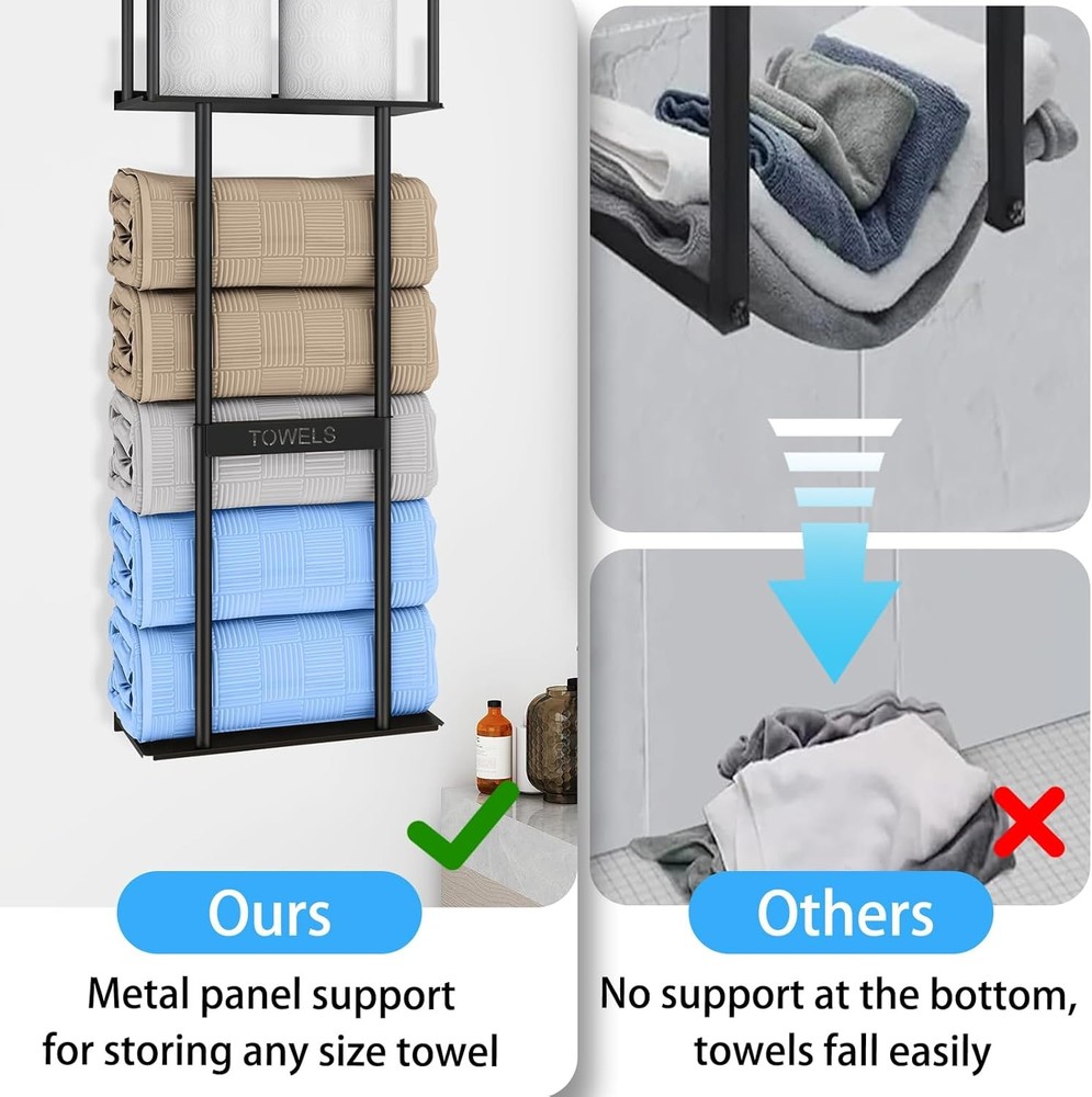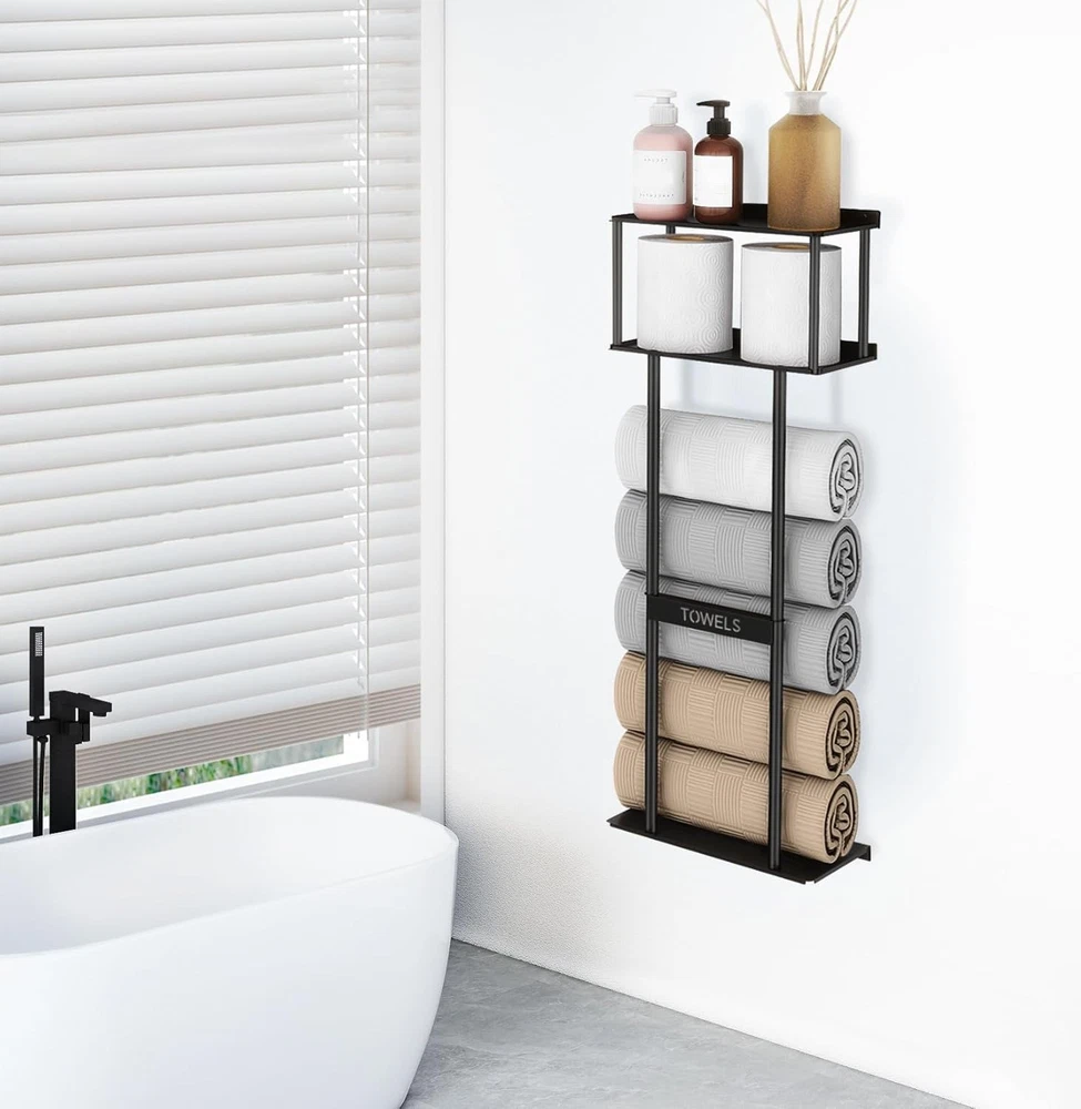 LARGE CAPACITY - The combination design of the wall bathroom towel rack with shelves and toilet paper basket can easily store all kinds of aromatherapy, green plants, candle cups, rolling papers and towels, which makes it convenient for you to access all kinds of items in time, and you don't have to worry about bathroom clutter anymore. UPGRADED PLATE DESIGN - The towel rack is made of a combination of metal plates, not a non-skeletonized or line material. Our bathroom towel storage are well-made, precision-coated surface, sturdy , simple and generous, bring a spa-like feeling to the bathroom or closet; suitable for placing above the toilet, cabinet, RV or small space; a thoughtful housewarming gift that combines functionality and artistry. MULTIFUNCTIONAL STORAGE - Our wall towel rack is different from traditional towel racks, it can independently store 5 large size bath towels, the top shelf can also be used for items such as aromatherapy and greenery, and the storage basket can also store 2 rolls of paper. Easy to access without interfering with each other. HIGH QUALITY MATERIAL - The towel storage rack is made of high quality metal, the surface is frosted black treatment. Waterproof and rustproof, suitable for bathrooms, showers and other wet environments. Ideal solution for you to save space in your home. EASY INSTALLATION - Screwed hardware and installation manual included for quick and easy installation; installs in less than 10 minutes near the shower, above the toilet or in a closet. Dimensions: 30"H x 11.81"L x 5.51"W.