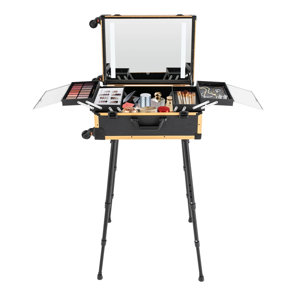 Rolling Makeup Case Trolley Train Box Organizer with LED Lighted Mirror High-quality Material: The product is made of high-quality aluminum alloy, medium fiberboard, ABS, and PVC with oxidation and electroplating processes, which are strong, pressure-resistant, waterproof, impact-resistant, corrosion-resistant, rust-resistant , and has a long service life. Humanized Design: The large mirror with LED light can be easily adjusted between warm, neutral and white light with the touch of the switch and the brightness of the light can be infinitely adjusted with a long press of the switch, which can help you see more details of your makeup and restore the true state of your makeup. Categorized Storage: This product has four storage trays for makeup brushes, nail polish, foundation, eye shadow, hair clips, and other tools (not included). The neat and orderly distribution and sorting trays keep the tools in order, which is an essential and good helper for you. Convenient to Use: This product is equipped with a 12V charging jack, an external power jack, and a power jack. After connecting the power cord, it can be connected to an external curling iron, cell phone, and hair dryer (not included) to meet your needs when working. Protect Your Privacy : Two locking buckles with keys securely protect your valuables inside the box and maximize your privacy. Flexible Movement: 4 universal wheels, a telescopic trolley rod, and a top handle make it easy to move the case up and down stairs, in and out of cars and elevators. The detachable universal wheels enable you to replace them conveniently when damaged, which is easy and cost-efficient. Ideal Gift: With a stylish appearance and practical functions, this product is an ideal birthday and holiday gift for family, friends, fashionistas, and beauty lovers. Effortless Cleaning: Thanks to the smooth surface and simple structure, you can easily wipe off the dirt on it with a soft cloth. Good Customer Service: We stand behind all our guests and look forward to assisting you with your purchase. It is our pleasure to answer your confusion and questions. The end of the story between us is not "we sell and you buy". Details Adjustable Support Legs: The support legs have four adjustable heights (29.33in, 30.71in, 32.09in, and 33.46in) for people of different heights. Removable Tray: Two hooks and loops on the inside of the case make it easy to secure the tray and remove it for individual use. Wide Opening : With a wide opening, it is easy for you to store and retrieve certain items without messing up other items in the box. Application This product is suitable for travel, wedding, event, and home makeup use, and can organize makeup brushes, nail polish, foundation, eye shadow, hair clips, and other tools. It is ideal for makeup artists, hair stylists, nail technicians, and cosmetologists. Package Included 1* Makeup Case 4* Legs 1* Storage Bag 2* Keys 1* USB Cable 1* Power Cord All Accessories for Installation Payment Delivery details Terms of sales About us Contact us Payment We accept ebay payment 。 Fees such as import duties, taxes are not included in the item price or shipping costs. These charges are the buyer's responsibility. Delivery details Shipping: 2-9 working days to: USA Terms of sales We maintain high standards of excellence and strive for hundred percent customer satisfaction. Feedback is very important to us. We hope that you contact us immediately before you give neutral or negative feedback, so that we can address your concerns. It is impossible to address issues if we do not know about them! About us Your satis faction is our ultimate goal. We work hard to earn your trust and future business. Our certified technicians have tested each item before shipping. The unit comes with 1 year limited warranty on all manufacturing defects. a) If you receive a defective item, you may return it or ask for a discount. Please contact us within 14 days after you receive the package. b) What you returned must be intact and in its original packaging as re? u. Customer is responsible for shipping costs of the returned item. c) We will cover the cost of shipping back t with the shipping rate indicated in the registration page. We will send you a new unit or refund the full payment you paid. Thank you. Contact us Business Hour Business Hour: Monday To Friday: 8:30 AM to 5:00 PM (Beijing China time) Due to time zones, our reply to your questions may not be immediately. But within above working time, we will reply your email within 24 hours. If it's non-workdays, please kindly be patient and wait till Monday. Please contact us with ebay message. Please feel free to contact us if you have any questions. Monday To Friday: 8:30 AM to 5:00 PM (Beijing China time) Due to time zones, our reply to your questions may not be immediately. But within above working time, we will reply your email within 24 hours. If it's non-workdays, please kindly be patient and wait till Monday. Please contact us with ebay message. Please feel free to contact us if you have any questions. On Feb 10, 2025 at 23:25:40 PST, seller added the following information: