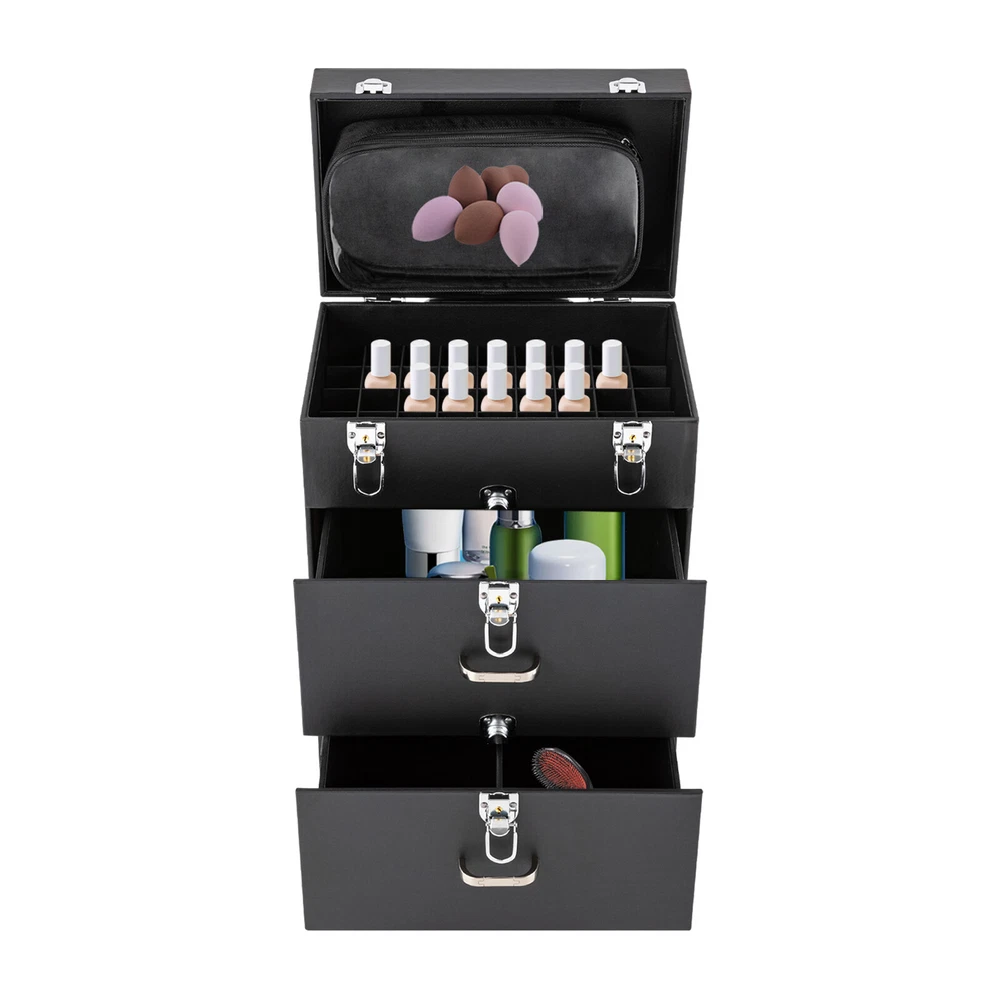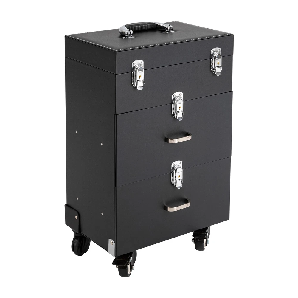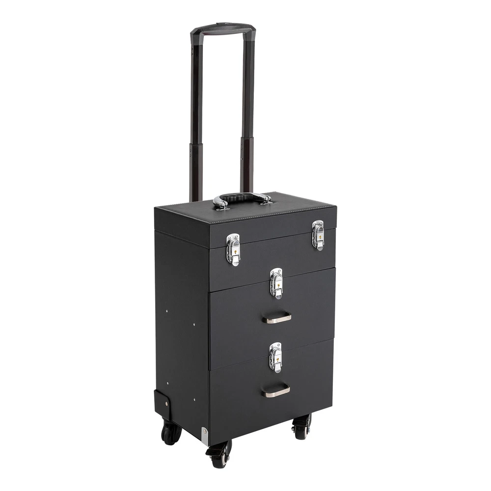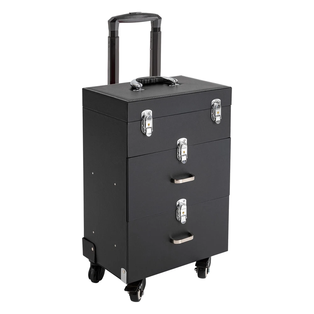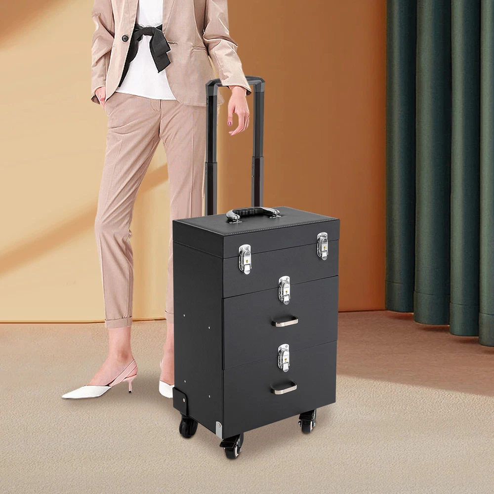 Rolling Makeup Train Case Aluminum Salon Cosmetic Trolley Organizer Box+Drawer Description This is a rolling makeup train case designed for professional beauty artists to make up anytime and anywhere. It is constructed of high-quality PU, wood, PVC , and aluminum alloy that is sturdy and durable. It has extra large capacity compartments and multi-layer drawers. This case is ideal for all people who love beauty or nail art. Key Features High-quality Material: This product is made of high-qualit y PU, wood, PVC, and aluminum alloy, with c orrosion resistance , wear resistance , and not easy to fade. Categorized Storage: Three compartments and a removable grid tray allow you to organize beauty products of different functions and sizes and make it easy to find the tools you want quickly . High Privacy: Four locking cylinders securely protect your valuables inside the box and maximize your privacy. Large Capacity: One 3.54in high tray and two 6.69 high trays can store a variety of cosmetics and beauty appliances, such as perms, nail machines and light therapy supplies, its ample storage space will be able to meet your multiple storage needs. Outstanding Load Capacity: The rectangular structure gives it an excellent load capacity (up to 99 lbs). You can put all your beauty tools in it with confidence. Easy to Move and Carry: The easy-to-move silent universal wheels (two of them can be fixed), three-position telescopic trolley rod, and a top handle make it more convenient to carry on the go, especially suitable for nail technicians and cosmetologists who have a lot of tools and need to be on the go frequently. Stylish Appearance: Its simple structure and black color give people a fashionable and elegant feeling. Such a vintage makeup case can nicely decorate your dressing room and make a good impression when you go out to work. Protective Shipping: To prevent the product from being damaged during transportation as much as possible, this product uses a rigid cardboard box, plastic bag, and foam that can effectively resist normal compression and drops. Details Clear Storage Bag: The clear storage bag on the inside of the lid allows for wet and dry storage and avoids cross-contamination. In addition, the double zipper design not only makes it easier to open and close, but also gives it a better seal. Corner Reinforcement: The bottom corner reinforcement design makes the box structure more stable, thus providing you with more excellent quality assurance. Smooth Tracks: Smooth drawer tracks make the drawing smoother and less noisy. Ergonomic Handles: The top handle has an ergonomic four-finger structure and a slow rebound damping design, making it more comfortable to hold and less likely to break. In addition, two drawer handles make it easy to pull out the drawer. Application This rolling makeup train case is suitable for professional make-up artists, hairdressers, nail technicians, and beauticians in beauty centers, salons, private homes, parties, and other occasions. Specification Material: PU, Wood, PVC, Aluminum Alloy Color: Black Shape: Rectangular Assembly Required: No Opening Method: Latch Carrying Parts: Retractable Handle Rolling Wheel Style: Universal Wheel Number of Trays: 3 Maximum Load: 45kg/99lbs Gross Weight: 9.2kg/ 20.28 lbs Net Weight: 8kg/ 17.64 lbs Package Size: 42*34*64 cm/ 16.54* 13.39*25.2 in Footprint: 36*23cm/14.17*9.05in Top Cover Height from Ground: 49cm/19.29in Top Cover Size: 29*23*5cm/11.4*9.05*1.97in Telescopic Rod Extension Height from Case: 45cm/17.72in First Tier Height: 9cm/3.54in Second Tier Height: 17cm/6.69in Third Tier Height: 17cm/6.69in Package Included 1 * Rolling Makeup Train Case 2 * Keys Notes It's normal for the tie rod to wobble a little bit as it needs clearance to move back and forth better. If it is too tight, it will harm the tie rod instead. Please make sure you don't mind before purchasing. Please allow the slight color difference caused by the shooting light and the 1-3 cm error due to manual measurement, and make sure you do not mind before ordering. Payment Delivery details Terms of sales About us Contact us Payment We accept ebay payment 。 Fees such as import duties, taxes are not included in the item price or shipping costs. These charges are the buyer's responsibility. Delivery details Shipping: 2-9 working days to: USA Terms of sales We maintain high standards of excellence and strive for hundred percent customer satisfaction. Feedback is very important to us. We hope that you contact us immediately before you give neutral or negative feedback, so that we can address your concerns. It is impossible to address issues if we do not know about them! About us Your satis faction is our ultimate goal. We work hard to earn your trust and future business. Our certified technicians have tested each item before shipping. The unit comes with 1 year limited warranty on all manufacturing defects. a) If you receive a defective item, you may return it or ask for a discount. Please contact us within 14 days after you receive the package. b) What you returned must be intact and in its original packaging as re? u. Customer is responsible for shipping costs of the returned item. c) We will cover the cost of shipping back t with the shipping rate indicated in the registration page. We will send you a new unit or refund the full payment you paid. Thank you. Contact us Business Hour Business Hour: Monday To Friday: 8:30 AM to 5:00 PM (Beijing China time) Due to time zones, our reply to your questions may not be immediately. But within above working time, we will reply your email within 24 hours. If it's non-workdays, please kindly be patient and wait till Monday. Please contact us with ebay message. Please feel free to contact us if you have any questions. Monday To Friday: 8:30 AM to 5:00 PM (Beijing China time) Due to time zones, our reply to your questions may not be immediately. But within above working time, we will reply your email within 24 hours. If it'