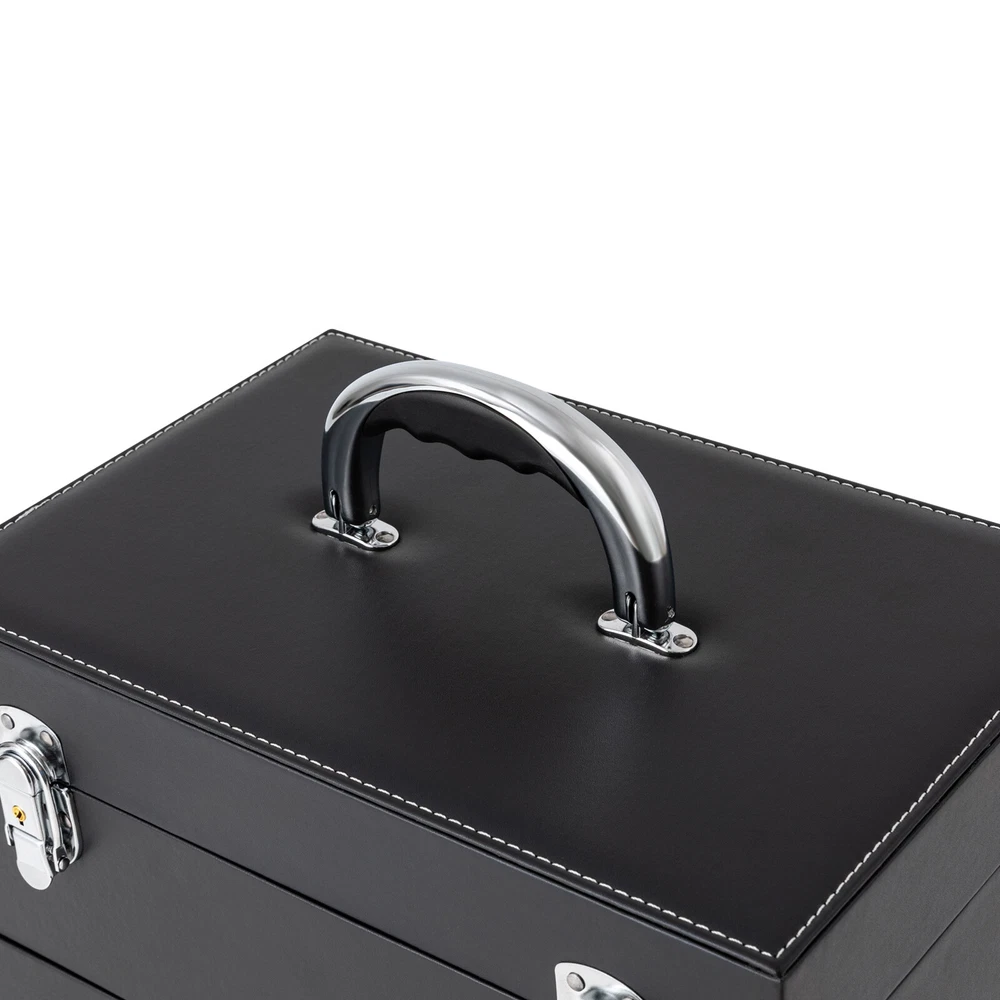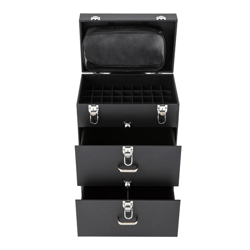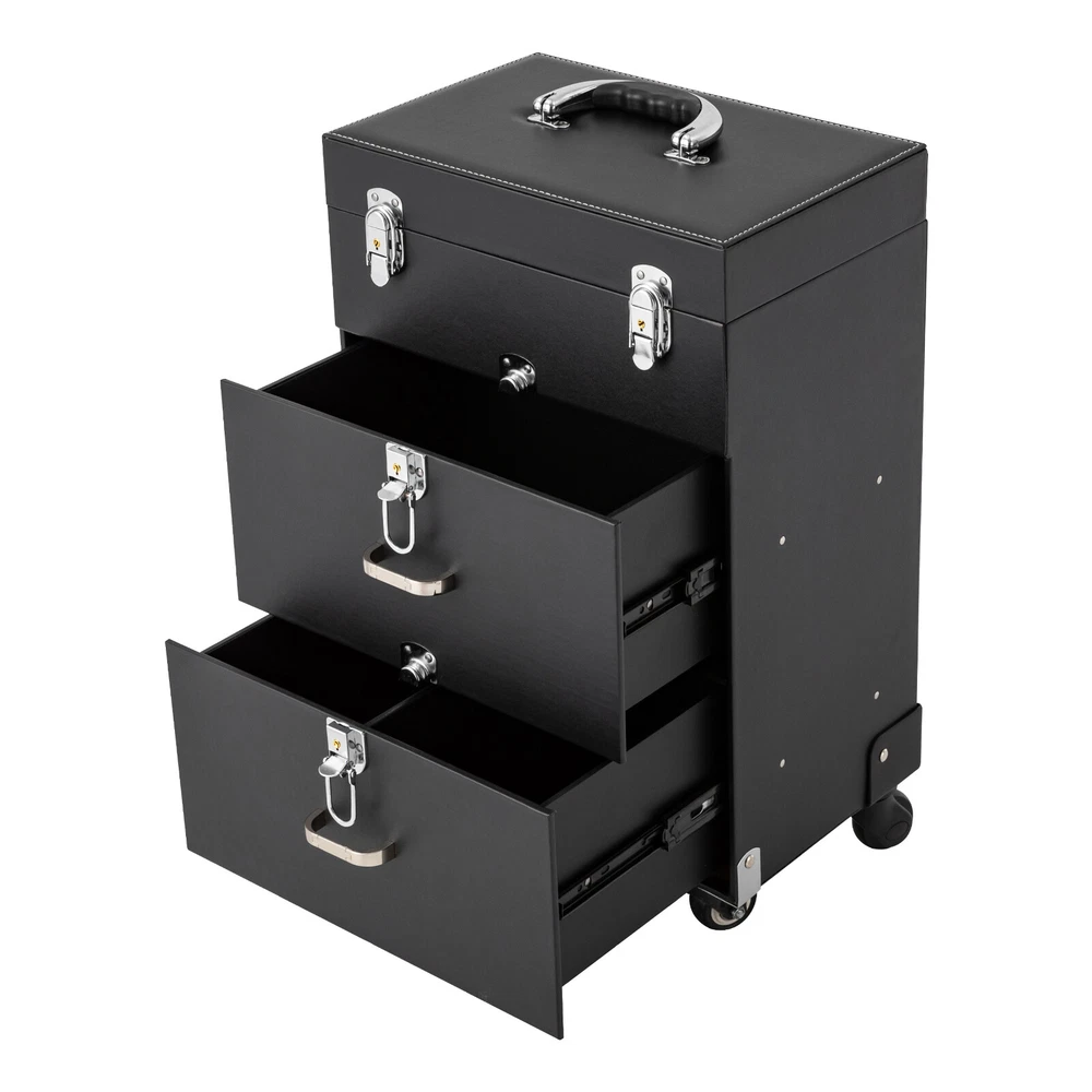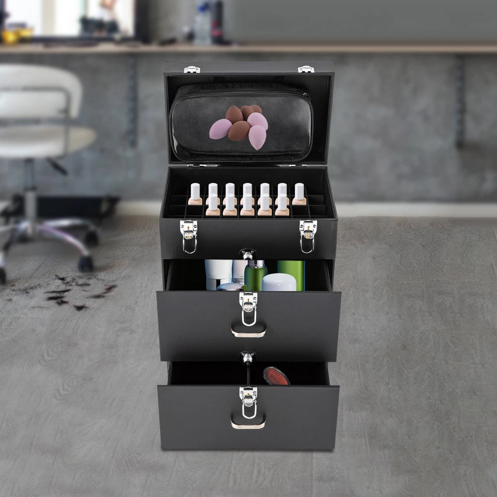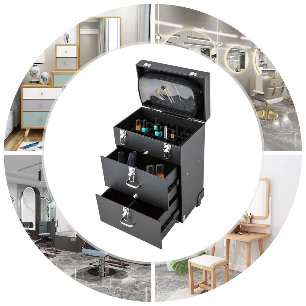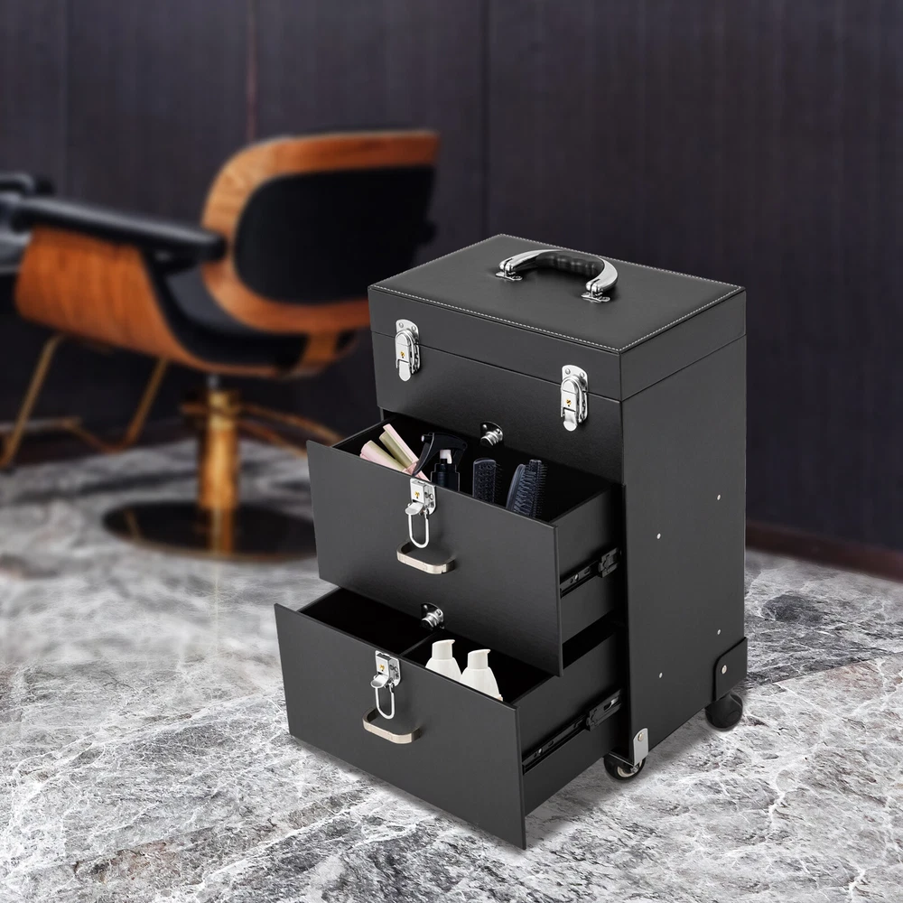 Rolling Makeup Train Case Aluminum Salon Cosmetic Trolley Organizer Box+Drawer Description This is a rolling makeup train case designed for professional beauty artists to make up anytime and anywhere. It is constructed of high-quality PU, wood, PVC , and aluminum alloy that is sturdy and durable. It has extra large capacity compartments and multi-layer drawers. This case is ideal for all people who love beauty or nail art. Key Features High-quality Material: This product is made of high-qualit y PU, wood, PVC, and aluminum alloy, with c orrosion resistance , wear resistance , and not easy to fade. Categorized Storage: Three compartments and a removable grid tray allow you to organize beauty products of different functions and sizes and make it easy to find the tools you want quickly . High Privacy: Four locking cylinders securely protect your valuables inside the box and maximize your privacy. Large Capacity: One 3.54in high tray and two 6.69 high trays can store a variety of cosmetics and beauty appliances, such as perms, nail machines and light therapy supplies, its ample storage space will be able to meet your multiple storage needs. Outstanding Load Capacity: The rectangular structure gives it an excellent load capacity (up to 99 lbs). You can put all your beauty tools in it with confidence. Easy to Move and Carry: The easy-to-move silent universal wheels (two of them can be fixed), three-position telescopic trolley rod, and a top handle make it more convenient to carry on the go, especially suitable for nail technicians and cosmetologists who have a lot of tools and need to be on the go frequently. Stylish Appearance: Its simple structure and black color give people a fashionable and elegant feeling. Such a vintage makeup case can nicely decorate your dressing room and make a good impression when you go out to work. Protective Shipping: To prevent the product from being damaged during transportation as much as possible, this product uses a rigid cardboard box, plastic bag, and foam that can effectively resist normal compression and drops. Details Clear Storage Bag: The clear storage bag on the inside of the lid allows for wet and dry storage and avoids cross-contamination. In addition, the double zipper design not only makes it easier to open and close, but also gives it a better seal. Corner Reinforcement: The bottom corner reinforcement design makes the box structure more stable, thus providing you with more excellent quality assurance. Smooth Tracks: Smooth drawer tracks make the drawing smoother and less noisy. Ergonomic Handles: The top handle has an ergonomic four-finger structure and a slow rebound damping design, making it more comfortable to hold and less likely to break. In addition, two drawer handles make it easy to pull out the drawer. Application This rolling makeup train case is suitable for professional make-up artists, hairdressers, nail technicians, and beauticians in beauty centers, salons, private homes, parties, and other occasions. Specification Material: PU, Wood, PVC, Aluminum Alloy Color: Black Shape: Rectangular Assembly Required: No Opening Method: Latch Carrying Parts: Retractable Handle Rolling Wheel Style: Universal Wheel Number of Trays: 3 Maximum Load: 45kg/99lbs Gross Weight: 9.2kg/ 20.28 lbs Net Weight: 8kg/ 17.64 lbs Package Size: 42*34*64 cm/ 16.54* 13.39*25.2 in Footprint: 36*23cm/14.17*9.05in Top Cover Height from Ground: 49cm/19.29in Top Cover Size: 29*23*5cm/11.4*9.05*1.97in Telescopic Rod Extension Height from Case: 45cm/17.72in First Tier Height: 9cm/3.54in Second Tier Height: 17cm/6.69in Third Tier Height: 17cm/6.69in Package Included 1 * Rolling Makeup Train Case 2 * Keys Notes It's normal for the tie rod to wobble a little bit as it needs clearance to move back and forth better. If it is too tight, it will harm the tie rod instead. Please make sure you don't mind before purchasing. Please allow the slight color difference caused by the shooting light and the 1-3 cm error due to manual measurement, and make sure you do not mind before ordering. Payment Delivery details Terms of sales About us Contact us Payment We accept ebay payment 。 Fees such as import duties, taxes are not included in the item price or shipping costs. These charges are the buyer's responsibility. Delivery details Shipping: 2-9 working days to: USA Terms of sales We maintain high standards of excellence and strive for hundred percent customer satisfaction. Feedback is very important to us. We hope that you contact us immediately before you give neutral or negative feedback, so that we can address your concerns. It is impossible to address issues if we do not know about them! About us Your satis faction is our ultimate goal. We work hard to earn your trust and future business. Our certified technicians have tested each item before shipping. The unit comes with 1 year limited warranty on all manufacturing defects. a) If you receive a defective item, you may return it or ask for a discount. Please contact us within 14 days after you receive the package. b) What you returned must be intact and in its original packaging as re? u. Customer is responsible for shipping costs of the returned item. c) We will cover the cost of shipping back t with the shipping rate indicated in the registration page. We will send you a new unit or refund the full payment you paid. Thank you. Contact us Business Hour Business Hour: Monday To Friday: 8:30 AM to 5:00 PM (Beijing China time) Due to time zones, our reply to your questions may not be immediately. But within above working time, we will reply your email within 24 hours. If it's non-workdays, please kindly be patient and wait till Monday. Please contact us with ebay message. Please feel free to contact us if you have any questions. Monday To Friday: 8:30 AM to 5:00 PM (Beijing China time) Due to time zones, our reply to your questions may not be immediately. But within above working time, we will reply your email within 24 hours. If it'
