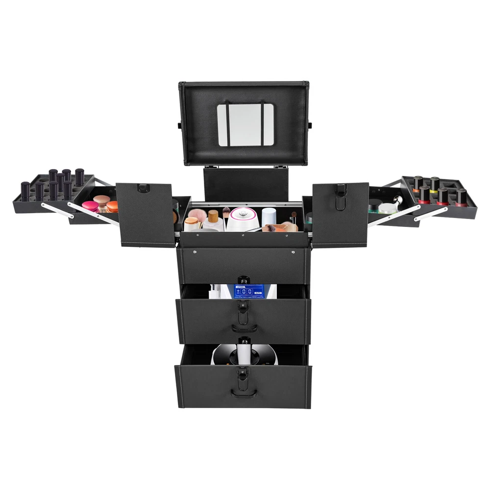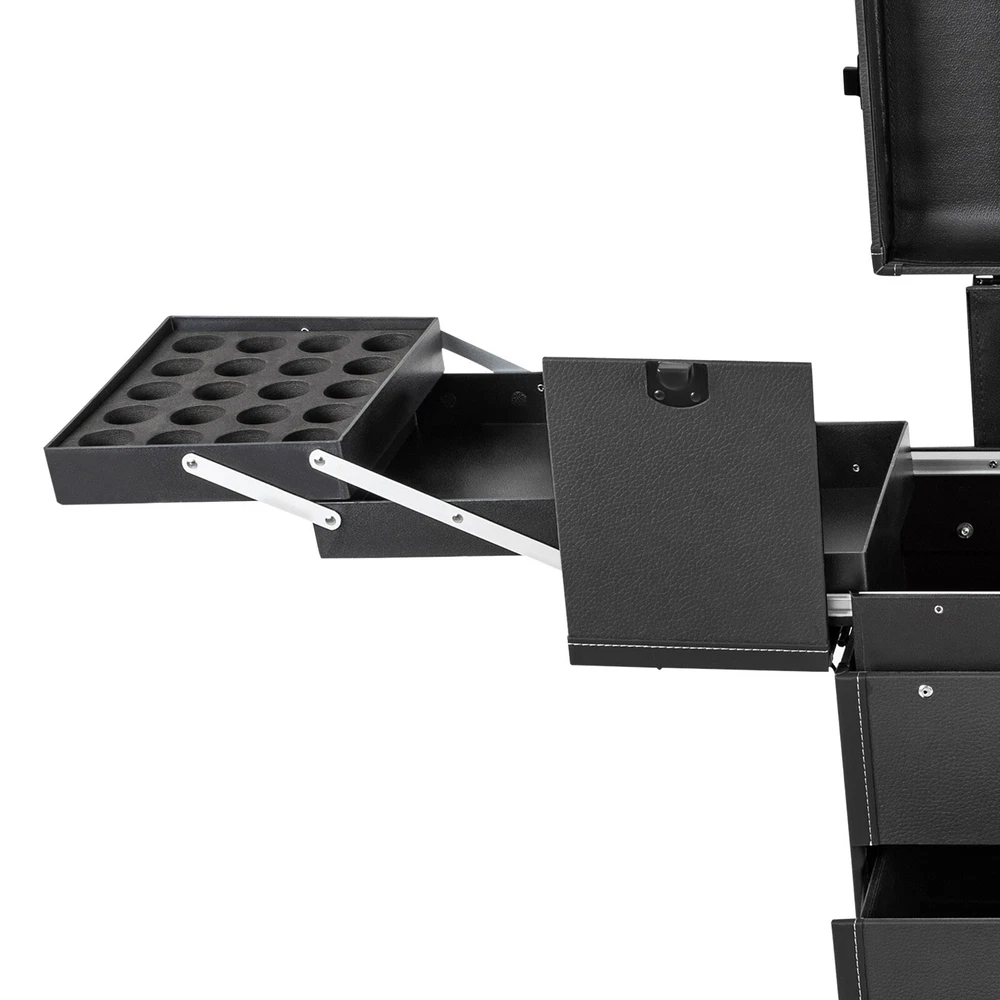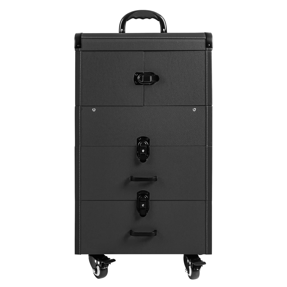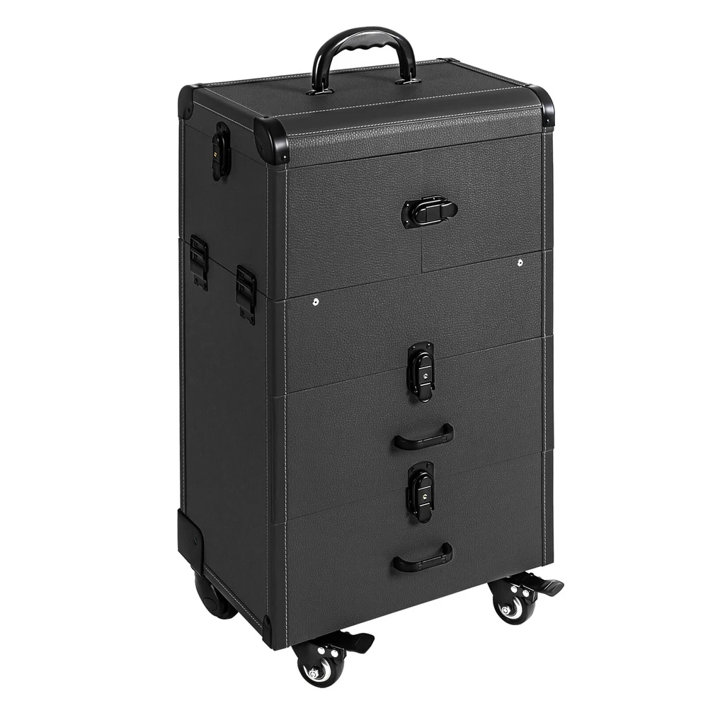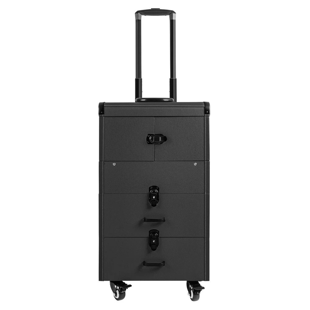 Rolling Makeup Travel Case Nail Tech Suitcase Cosmetic Train Case on Wheels Description If you are a make-up artist or embroiderer who often needs to go out to work, you will need our makeup train case. It is made of premium material, sturdy and durable. 4 universal wheels and a large capacity make it an excellent makeup assistant when outgoing. With its beautiful appearance, it is an ideal gift for your mother, sister, or wife. In addition, locks and latches can ensure high safety, so you can use this item confidently. Key Features Long Service Life: High-quality wood board and PVC make this product anti-corrosion, waterproof , and rustproof and not easily deform, thus ensuring a long service life. Easy to Move & Carry: The 4 universal wheels(2 with brakes) ensure silent and smooth rolling and you can fix it stably. With the practical pull rod and comfortable handle, you can carry this product with less effort. Large Capacity: 4 retractable trays on the top, a large space in the middle, and 2 large drawers at the bottom can provide enough storage space for various cosmetics and makeup tools, such as foundation, eye shadow, blush powder, skin care products, sprays, hair tools. Neat Storage: With different partitions, you can arrange cosmetics in an orderly manner, saving the countertop space and saving time searching for cosmetics, giving your dressing table a new look. Excellent Load-bearing Capacity: The premium materials and rectangular structure provide the make-up case with a maximum weight-bearing capacity of about 110.23 lbs. You can place all kinds of hairdressing and beauty tools on it with confidence. Ready to Use: You can use this product without tedious assembly after receiving it, which saves you time and energy. Stylish Appearance: The rectangular frame, low-key black color, and anti-scratch diamond patterns give this product a stylish look, which is a brilliant view when you are carrying it outside. Thoughtful Design: The clear and bright makeup mirror in the case is convenient for you to create the ideal makeup look. The EVA partition can protect your cosmetics from being damaged and allow for neat storage. Ideal Gift: Its exquisite design and large capacity make this product a great gift to your mother, girlfriend, sisters, wife and loved ones so that they can enjoy more convenient makeup time. Protective Shipping: To prevent the product from being damaged and bumped during transportation, we fill the package with an anti-collision sponge to protect your products to the maximum extent possible. Customer Service: We aim to provide quality products and services. If you have any problems, please feel free to contact us. We will reply and solve the problem for you as soon as possible. Details Zinc Alloy Corner Wrap: The zinc alloy corner wrap with a round design can not only protect your case from impact but also better care for your skin. Locks and Latch: They are solid and durable to effectively protect the inside items from loss. Application Professional makeup artists, hairdressers, beauticians, manicurists, beauty lovers, etc. can use this product to store cosmetics and makeup tools. It is ideal for makeup contests, wedding makeup scenarios, travel makeup, outdoor shooting, cinemas, dressing rooms, crew, tourism, beauty salons, and more. How to Lock 1. Lift the steel ring. 2. Press the lock plate. 3. Insert the key. 4. Turn clockwise to lock it, and turn counterclockwise to open it. 5. The case is locked. Specification Color: Black Shape: Rectangular Material: Zinc Alloy, Wood Board, PVC, EVA Style: Modern Assembly Required: 1 Number of Items: 1 Mounting Type: Free Standing Overall Load-bearing Capacity: About 50kg/110.23 lbs Wheel Height: 7cm/2.76in Overall Product Size: 37*24*66cm/14.57*9.45*25.98in Pull Rod Length: 43cm/16.93in Mirror Size: 16.5*11cm/6.5*4.33in Each Tray Size: 19.5*16.5*4.5cm/7.68*4.69*1.77in Middle Space Size: 34*21*12cm/13.39*8.27*4.72in Each Drawer Size: 34*20*11cm/13.39*7.87*4.33in Package Size: 42*32*72cm/16.54*12.6*28.35in Net Weight: 9.8kg/21.61 lbs Gross Weight: 12kg/26.46 lbs Package Included 1 x Makeup Train Case 2 x Keys Notes The service wear of the case is a normal phenomenon. In the process of daily use, please try to avoid excessive impact and drop to extend the lifespan of the product. Please use soft tools and water to clean. Please keep away from corrosive liquids. Please avoid long-term exposure to the sun. Please clear the wheels in time to maintain smooth movement. Please allow the slight color difference caused by the shooting light and the 1-3cm error due to manual measurement. Please make sure you do not mind before you order. Payment Delivery details Terms of sales About us Contact us Payment We accept ebay payment 。 Fees such as import duties, taxes are not included in the item price or shipping costs. These charges are the buyer's responsibility. Delivery details Shipping: 2-9 working days to: USA Terms of sales We maintain high standards of excellence and strive for hundred percent customer satisfaction. Feedback is very important to us. We hope that you contact us immediately before you give neutral or negative feedback, so that we can address your concerns. It is impossible to address issues if we do not know about them! About us Your satis faction is our ultimate goal. We work hard to earn your trust and future business. Our certified technicians have tested each item before shipping. The unit comes with 1 year limited warranty on all manufacturing defects. a) If you receive a defective item, you may return it or ask for a discount. Please contact us within 14 days after you receive the package. b) What you returned must be intact and in its original packaging as re? u. Customer is responsible for shipping costs of the returned item. c) We will cover the cost of shipping back t with the shipping rate indicated in the registration page. We will send you a new unit or refund the full payment you paid. Thank you. Contact
