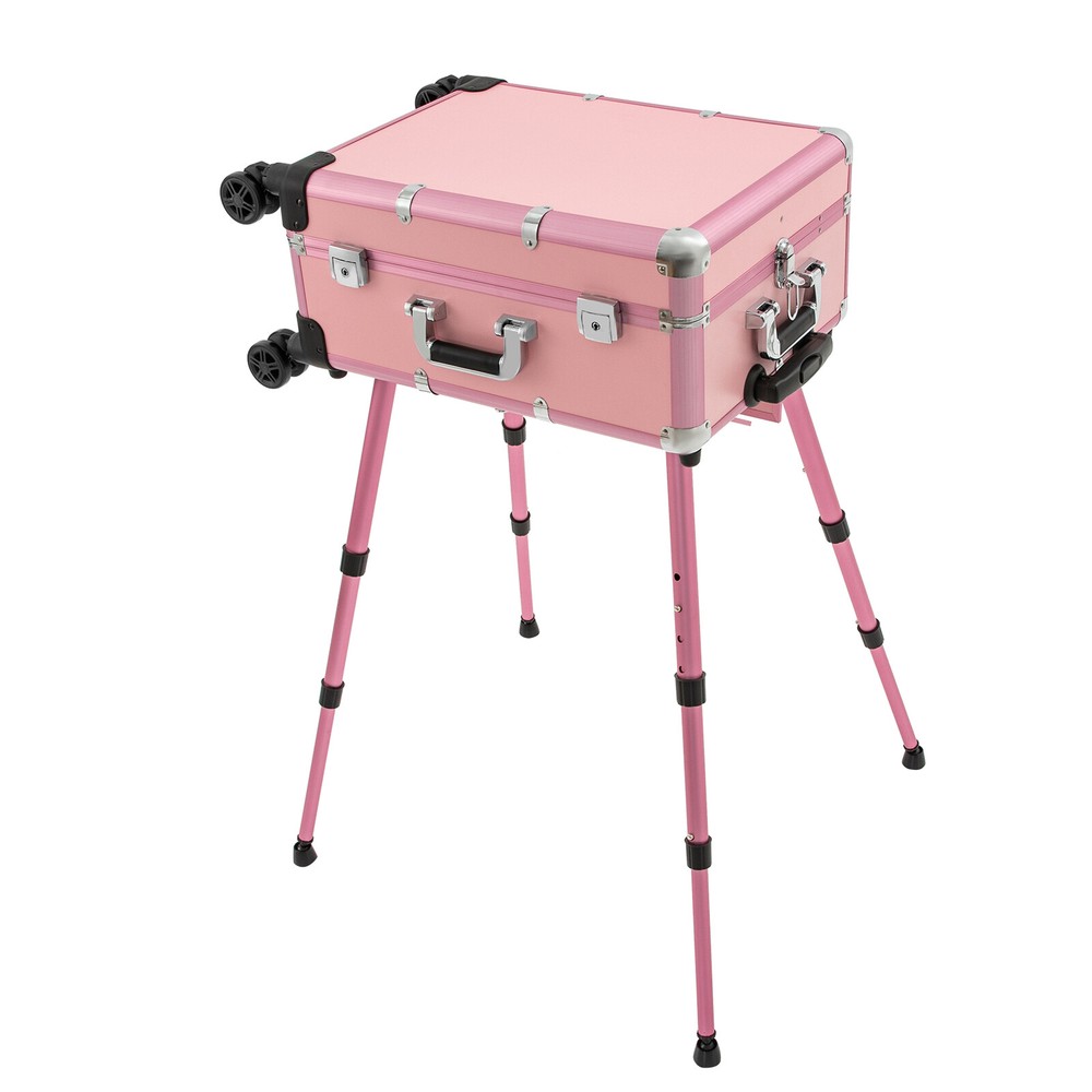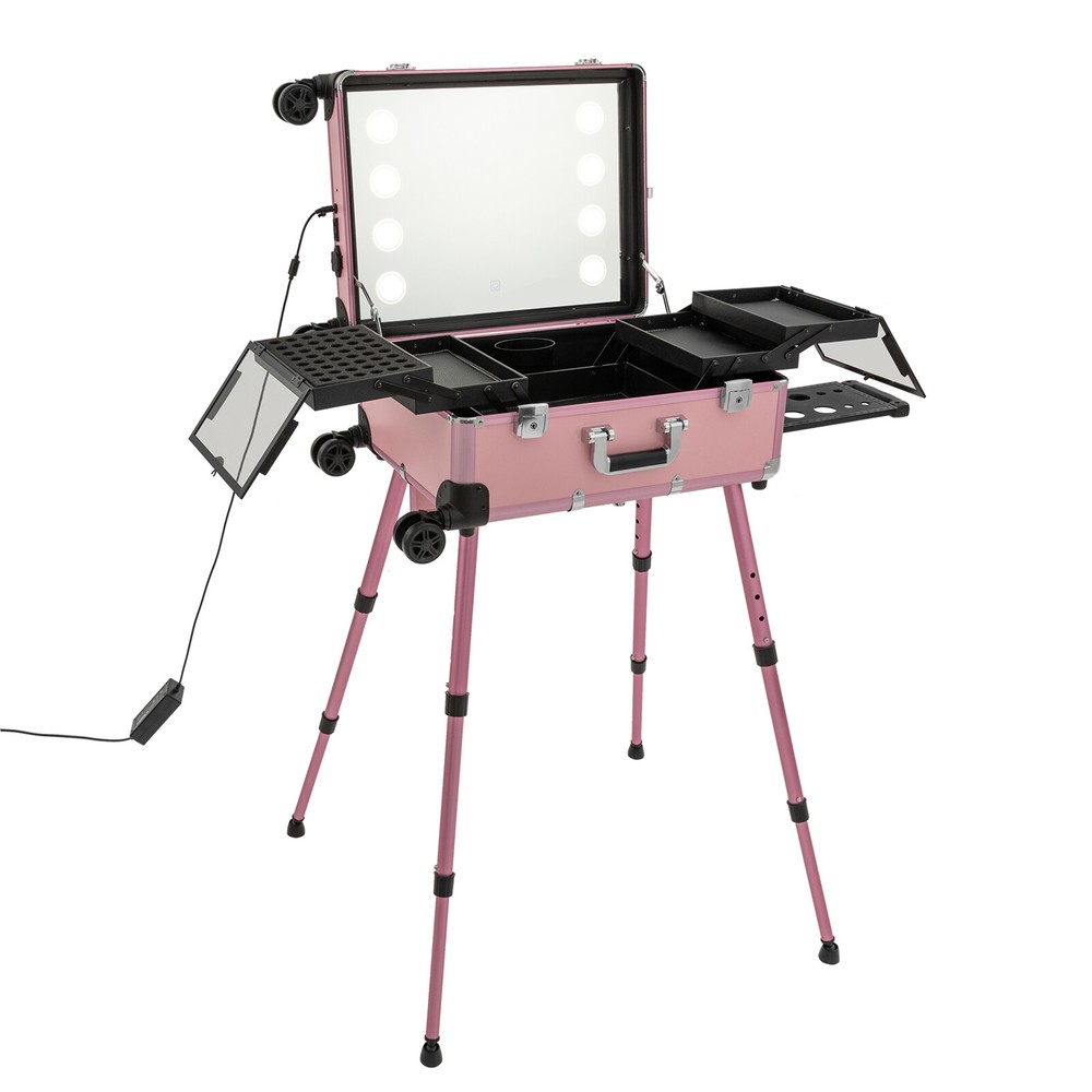 Professional Cosmetic Travel Case Vanity Organizer Rolling Makeup Train Case Description If you are a make-up artist and embroiderer who often needs to go out to work, you will need our makeup train case, combining the suitcase with the four legs, which is very convenient. Our makeup train case with high durability, 4 universal wheels, a large capacity, built-in LED 3-color lights, and a chargeable design will be your excellent makeup assistant when outgoing. Key Features Long Service Life: With the high-quality aluminum alloy and decorative high-pressure laminate, this product is anti-corrosion, flame-resistant , and rustproof and is not easily deformed, thus ensuring a long service life. Large Capacity: The 3-tier design with 5 collapsible&detachable inner boxes and a makeup brush holder can orderly sort and store your makeup/tools while well protecting them from scratches because of PU&MDF lining. And the retractable side tray can hold your hairdryer, flat iron, curling iron, etc. Excellent Load-bearing Capacity: The four supporting feet at the bottom and the aluminum alloy frame provide the make-up case with a maximum weight-bearing capacity of 110.23 lbs. You can place all kinds of hairdressing and beauty tools on it with confidence. Professional Make-up Assistant: The 8 LED lights(each 2.17" in diameter) with adjustable brightness and 3 light colors(warm, natural, and cold light) provide an ideal view for your different makeup needs without worrying about unwanted glare/shadows while protecting your eyes, together with the high-transparency resin mirror, helping you achieve flawless professional makeup. You can long press the button on the mirror to adjust the brightness and short press it to change the light color. Adjustable Height: With the 4-gear height adjustable quadripod(32.3 inches), you can find the height that suits you best to have enjoyable makeup without back pain. Built-in Retractable Quardipod: The built-in retractable quardipod can be stretched when needed or folded when not in use, enabling quick switching between the two usage modes without disassembly. The adjustable foot pads of the quardipod adapt to uneven ground. Thoughtful Design: The 12V rechargeable jack, external power supply jack, and power jack with a dustproof cover on the case will bring more convenience to your operation. Stylish Appearance: The rectangular frame with simple&elegant lines and lively pink embellished with a little black&silver gives this product a stylish look, which is a brilliant view when you are carrying it outside. Ideal Gift: Its exquisite design and large capacity make this product a great gift to your mother, girlfriend, sisters, wife, and loved ones. They would be fond of it. Easy to Move&Carry: The 4 nylon universal wheels ensure silent and smooth rolling and its detachable design allows for convenient replacement. Along with the telescopic pull rod and 2 comfortable handles, you can carry this product with less effort. Protective Shipping: In order to prevent the product from being damaged and bumped during transportation, we fill the package with anti-collision foam to protect your products to the maximum extent possible. Details Alloy Cladding Corners: The alloy cladding corners with a round design can not only protect your case from tahoma but also better care for your skin. Flat Built-in Bulb: This design makes the bulbs not easy to break. When the case is closed, it does not occupy the interior space of the case. Non-slip Feet: The non-slip feet enhance the stability of the product without slipping and bring you a better user experience. Clear Inner Box Lid: The clear inner box lid with a latch lock allows you to view the inside items and avoids them from falling. Locks and Latch: The two locks on the side and the latch on the top are solid and durable to effectively protect the inside items from losing. Application Professional makeup artists, hairdressers, beauticians, manicurists, beauty lovers, etc. can use this product to store cosmetics and makeup tools. It is ideal for makeup contests, wedding makeup scenarios, travel makeup, outdoor shooting, cinemas, dressing rooms, crew, tourism, beauty salons, and more. How to Use 1. Open the bottom plate buckle. 2. Extract the quardipod and clamp it in place. 3. Adjust the suitable length. 4. Place the product upright. 5. Open the box. 6. Open the lock inside the box and pull out the small box inside. 7. Connect the power supply as needed and start using it. Specification Color: Pink Shape: Rectangular Material: Aluminum Alloy, Decorative High-pressure Laminate, Resin Wheel Material: Nylon Surface Treatment: Oxidation Plug: US Standard Mounting Type: Free Standing Light Color Type: Warm Light, Neutral Light, Cold Light Number of Wheels: 4 Voltage: 12V Bulb Type: 8*5W LED Bulbs (Included) Max. Load-bearing Capacity: 50kg/110.23lbs Gross Weight: 14kg/30.86lbs Net Weight: 12kg/26.46lbs Each Light Source Diameter: 5.5cm/2.17inch Mirror Size(L*W): 49*36cm/19.3*14inch Each Tray Size: 16.5*26.5*3cm/6.5*10.4*1.2inch Top Cover Size(L*W): 52*40cm/20.5*15.7inch Overall Height: 133cm/52.4inch Supporting Leg Max. Height: 82cm/32.3inch Tray Distance From Floor: 96cm/37.8in Package Size: 67.5*51*29cm/26.57*20.08*11.42inch Package Included 1 x Makeup Train Case 2 x Power Cords 1x USB Cable 2 x Keys Notes Please do not use high-voltage plugs as they may burn out the product. This product is an 8-light model without audio and Bluetooth functions. The support legs need to be tightened slightly before being supported. The service wear of the case is a normal phenomenon. In the process of daily use, please try to avoid excessive tahoma and drop to extend the lifespan of the product. Please use soft tools and water to clean. Please keep away from corrosive liquids. Please avoid long-term exposure to the sun. Please clear the wheels in time to maintain smooth movement. Please allow the slight color difference caused by the shooting light and the 