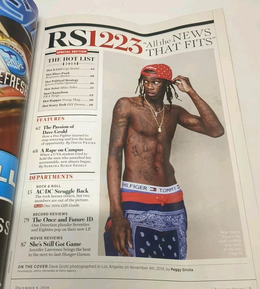This issue of Rolling Stone magazine, number 1223, is a must-have for music fans and collectors alike. Featuring in-depth articles and interviews with Young Thug, Kid Rock, Dave Grohl, AC/DC, and more, this biweekly publication is packed with interesting insights and trends in the music world. The magazine also includes The Hot List 2014, a comprehensive guide to the hottest songs and artists of the year, as well as articles on Miles Teller, Jennifer Lawrence, and more. With a focus on music and culture, Rolling Stone is an essential addition to any collection. This particular issue, published in December 2014, is a great example of the magazine's quality and range. Whether you're a fan of AC/DC, Dave Grohl, or simply interested in the latest trends in music, this issue is sure to provide hours of entertainment and inspiration.