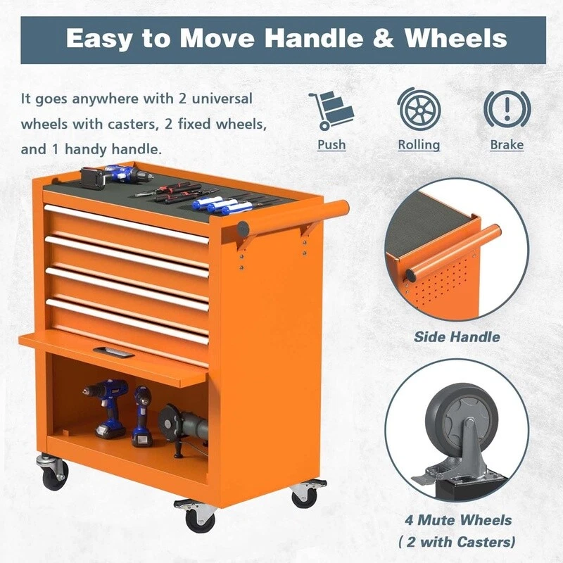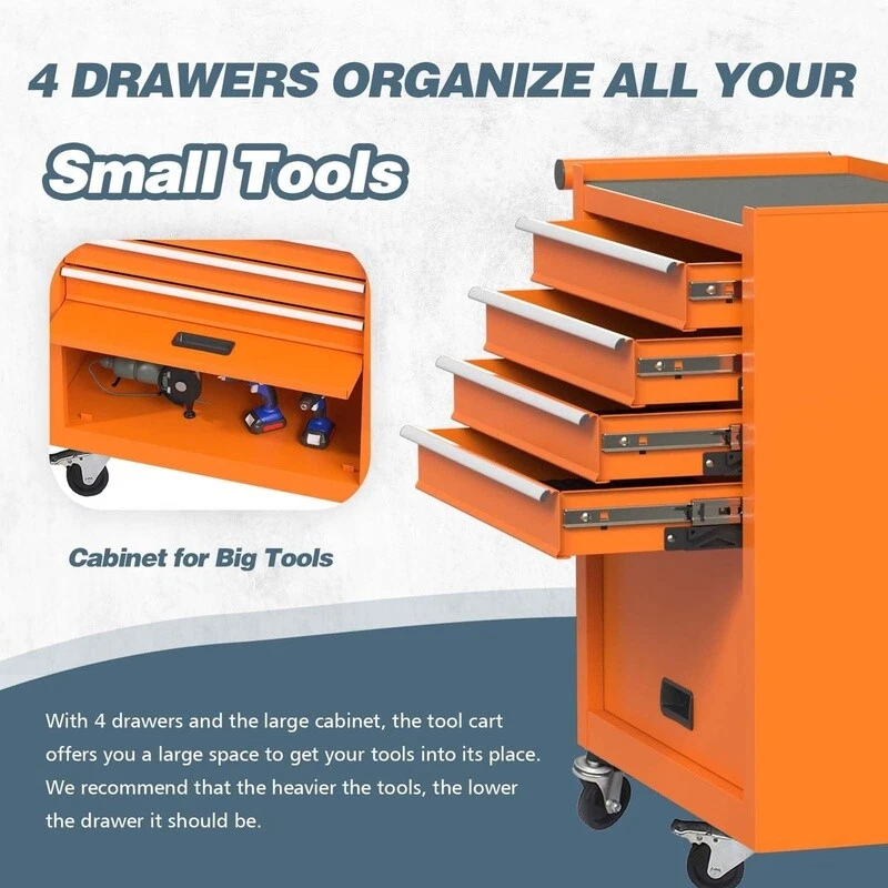 You may also like Mini Metal Tool Box with 2 Drawers and Top Storage Small Tool Chest W/PVC Liners 49.39 USD Free shipping 20-Inch 2-Drawer Tool Storage Box Tool Chest with Flip-Up Lid Garage Workshop 55.22 USD Free shipping The AK-HTS1-005 rolling tool chest is sturdy, and not easy to deform or bend. made of high-quality cold-rolled steel. And coated with an anti-corrosion paint surface which is waterproof and rustproof. Design to organize and store tools better! Perfect for any kind of project - DIY projects, home improvement, auto mechanics, and more. This tool chest has 4 drawers and 1 large bottom cabinet, which has various spaces to store various tools. Meanwhile, comfortable side handles make it easier to push or pull the tool chest, provide stability and support, and improve control and maneuverability. This rolling tool chest is great for home workshops and some professional environments and could be placed in the garage, workshop, warehouse, etc. CONVENIENT STORAGE SOLUTION - Our AK-HTS1-005 rolling tool chest offers ample space to organize and store your tools, ensuring easy access and efficient workflow in your garage or workshop. ANTI-RUST MATERIAL - This tool box is made of high quality metal steel material, has a stable construction, prevents scratching, denting, and chipping, more durable; adopts a powder coat, classic neutral color, beautiful and anti-rust. LARGE HIGH CAPACITY - The rolling toolbox has 4 sliding drawers and 1 bottom cabinet, to store different size tools and meet your needs. Each drawer is designed with a liner to prevent scratches. EASY MOVING & SECURE STORING - Our general tool cart can be easily moved and stored because there are 4 universal casters, 2 of which are braked. Also, the side with handles, helps you to move forward. MUTI-PURPOSE GIFT - It is a Christmas gift, and it is a holiday tool organizer for husbands and women. With classic color and unique appearance, lockable tool chests can be furniture for your home, garage, warehouse, shop, etc. PRODUCT INFORMATION Overall: 24. 2” L x 13” D x 29. 9” H Overall Product Weight: 41. 9 lb Box Size: 29” L x 26. 9” W x 15" H;52. 2 lb Features Product Type: Rolling Tool Box Primary Material: Steel Locking System: Yes Drawers Included: Yes Number of Drawers: 4 Ball-Bearing Drawer Glides: Yes Color: Orange Drawer Liner Included: Yes Soft Close or Self Close Drawer Glides: Yes Wheels Included: Yes Locking Casters/Wheels: Yes Cabinet: Yes Legs Included: No Side Push Handles: Yes Supplier Intended and Approved Use: Residential Use Weight Capacity: 300 lbs Powder Coated: Yes Drawer Slide: Soft Close; Ball Bearing Worktop Material: Steel Assembly Assembly Required: Yes Installation Location: Wheels;Side Push Handles You may also like 7-Qt. Slow Cooker 3 Heat Settings Removable Ceramic Pot Led Power Indicator Blue 59.79 USD Free shipping Indoor & Outdoor Wood Flooring 12" x 12" Tiles for Patio Garden 27 Pieces Black 96.59 USD Free shipping 8-Pack Wall-Mount Storage Hooks Heavy-duty Steel Vinyl Coating Garage Organizer 29.42 USD Free shipping 12.5-Amp Variable-Temperature compact Heat Gun w/ Adjustable Air Flow 2 speeds 35.0 USD Free shipping 100W CD Stereo W/USB & BT Connectivity Bluetooth Wireless Tray-loading CD Player 97.75 USD Free shipping Full Size Garment Steamer with Telescopic Pole Foldable Hanger 70 Oz. Water Tank 83.99 USD Free shipping 12 Can Capacity Welded Cooler Heavy Duty Waterproof Adjustable Shoulder Strap 55.96 USD Free shipping 8-Person Family Camping Instant Cabin Tent with LED Lights Bluetooth Speaker 202.92 USD Free shipping Set of 4 Glass Food Storage Containers Leak-proof Seal Airtight W/ Latching Lids 55.99 USD Free shipping 37" Small Animal Cage for Ferret Large Rat Guinea Pig and Mouse W/ Pull Out Tray 96.02 USD Free shipping 74" H 5 Shelf Plastic Garage Shelves Rack Pack of 2 Storage Shelving Unit Black 109.14 USD Free shipping Portable Charcoal Grill Heavy-gauge Steel Removable Dual Adjustable Air Dampers 111.55 USD Free shipping