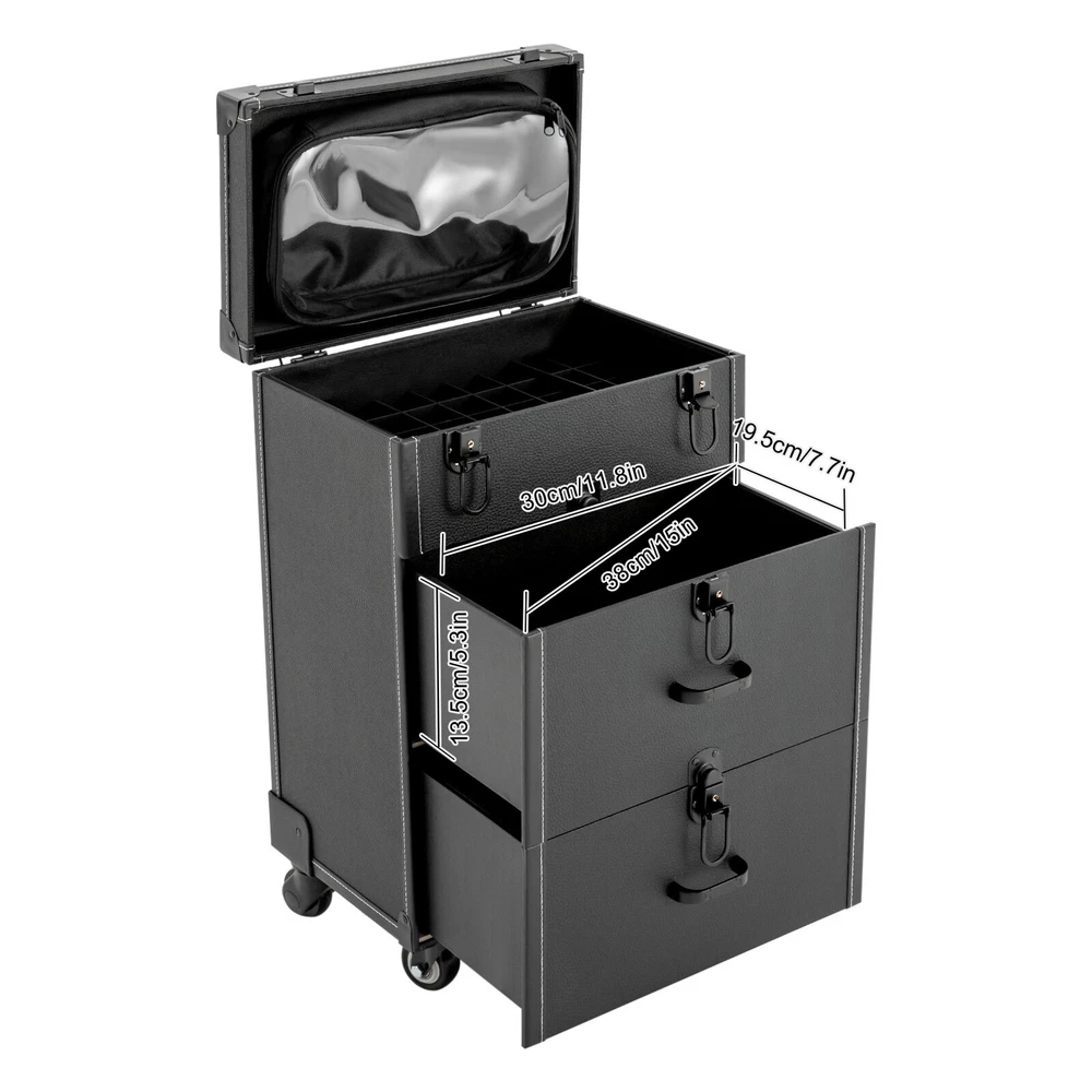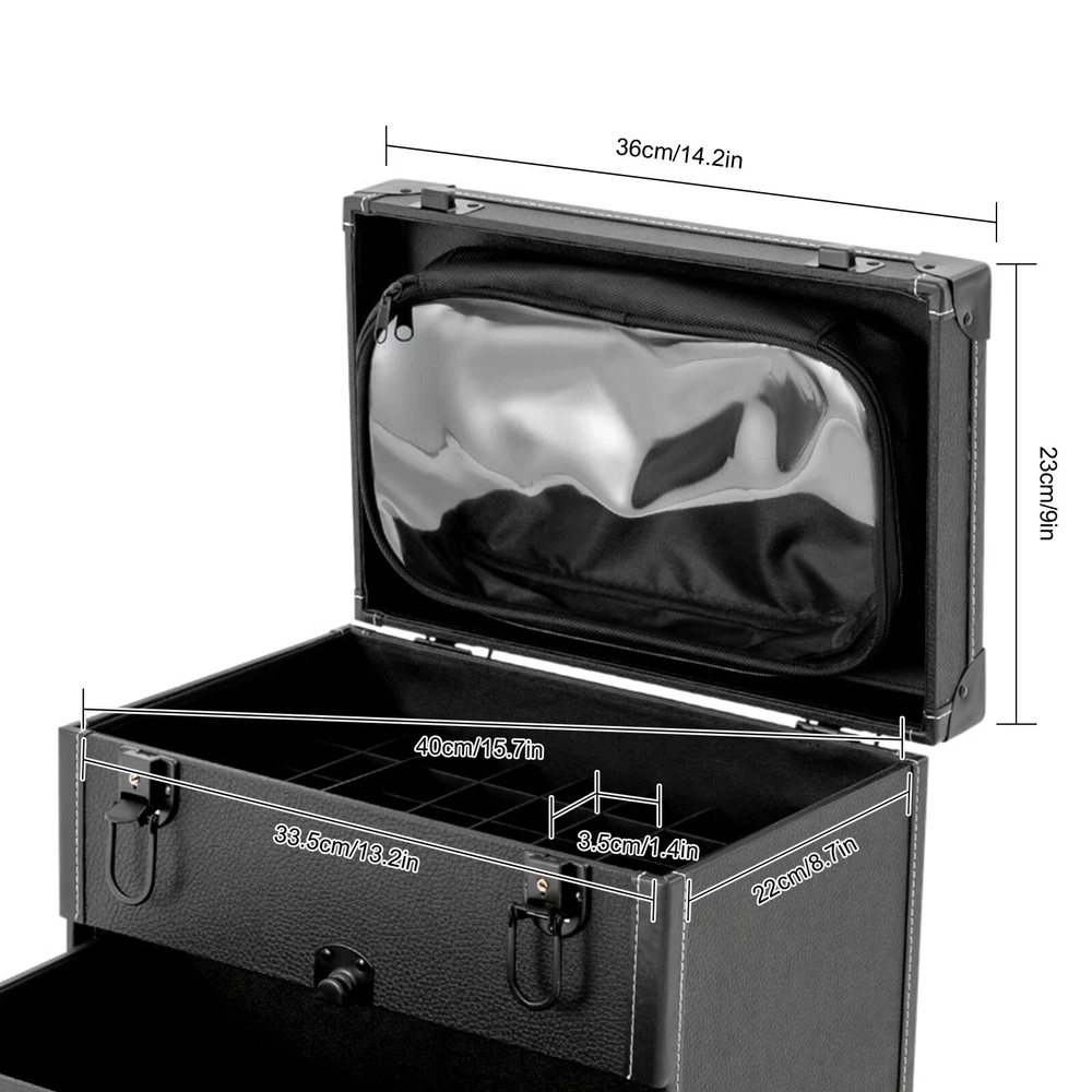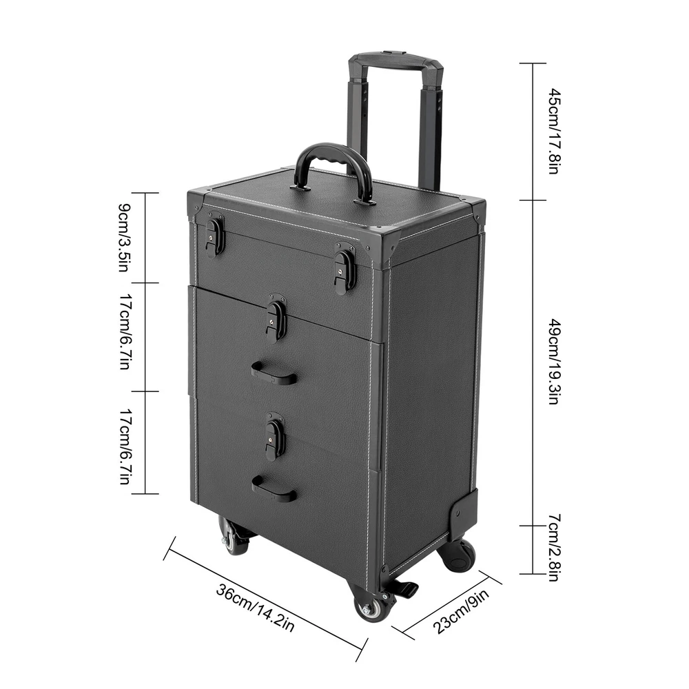 Specification Color: Black Shape: Rectangular Number of Tiers: 3 Number of Wheels: 4 Number of Keys: 2 Caster Type: Swivel Target Audience: Unisex Adult Mounting Type: Free Standing Material: PU, PVC, Zinc Alloy, Aluminum Alloy Max. Load-bearing Capacity: About 40kg/88.2lbs Lid Size(L*W): 36*23cm/14.2*9inch Wheel Height: 7cm/2.8inch Telescopic Rod Length (Min.): 38cm/14.9inch Telescopic Rod Length (Max.): 86cm/33.8inch Second Tier Inside Size: 30*19.5*13.5cm/11.8*7.7*5.3inch Each Compartment of Top Tier Size(L*W): 3.5*3.5cm/1.4*1.4inch Each Compartment of Third Tier Size: 14.5*19*13.5cm/5.7*7.5*5.3inch Top Tier Height: 9cm/3.5inch Second&Third Tier Height: 17cm/6.7inch Overall Case Body Size: 36*23*49cm/14.2*9*19.3inch Overall Product Size: 36*23*101cm/14.2*9*39.76inc Welcome to llppwe❤, have a good day!!! Description If you are troubled by storing all your hairdressing tools in order and finding them easily, our makeup train case can be of great help to you. Featuring high durability, attractive appearance, large capacity, universal wheels, humanized handles, a telescopic rod, and more, this product is easy to carry outside while keeping practical and beautiful. It is an ideal choice for young manicurists, make-up artists, and hairdressers/cosmetics lovers to store various cosmetics. Key Features Beautiful Appearance: Elegant black color combined with a rectangular frame, smooth lines, and delicate lychee texture gives this product a stylish and beautiful look. High-quality black hardware and exquisite stitching also add to its appearance. Durable and Sturdy: This product is constructed with premium PU, PVC, and reinforced corners, aluminum alloy rod, zinc alloy-wrapped edge , which is waterproof, wear-resistant , and has a long service life. Large Capacity: The 3-tier and compartment designs, cubicles, and a large clear pocket on the lid give this case a large capacity to hold your daily cosmetics and makeup tools in a categorized way, allowing you to quickly find what you want. And the dividers are removable for organizing different sized bottles. Easy to Move&Carry: 4 universal wheels (2 of which are lockable) ensure that the case can be moved smoothly and silently in all directions and allow for safe fixation to handle different road conditions. The telescopic handle and top handle give it high portability. Easy to Clean: The lid and drawer designs can prevent dust from entering, along with the waterproof surface, making it easy to clean. You just need to wipe off the dirt with a wet cloth. Excellent Load-bearing Capacity: The sturdy construction and the zinc alloy frame provide the product with an excellent weight-bearing capacity of 88.2 lbs. You can place all kinds of hairdressing and beauty tools in it with confidence. High Safety: The 4 latch locks and waterproof surface provide maximum protection and security for your toiletries, giving you peace of mind while traveling. Protective Packaging: To prevent the product from being damaged and bumped during transportation, we pack it with pearl cotton for maximum protection of your products. After-sales Service : We aim to provide quality products and services. If you have any problems, please feel free to contact us, and we will reply and solv e the problem for you as soon as possible. Details Back Buckles: The back of the luggage has two hardware eight-nail back buckles to make the case more stable and to ensure that it remains as good as new when repeatedly opened and closed. User-friendly Drawer Handle: The 2 comfortable drawer handles of the second and third tiers allow for convenient closing/opening of the drawers, thus ensuring easy access to the inside items. Application It is good for manicurists, makeup artists, both beginner and professional, freelance makeup artists, wedding makeup artists, celebrity makeup artist, and cosmetic trainees. Structure Overview The inside of the lid has a makeup bag where you can keep the things you use regularly for quick and easy access. The first tier can be used for nail varnish or other small items. The second tier is suitable for larger items such as hair dryers, curling wands, nail art machines, and more. The third tier has two compartments for medium items, such as cosmetics, hairspray spray. Specification Color: Black Shape: Rectangular Number of Tiers: 3 Number of Wheels: 4 Number of Keys: 2 Caster Type: Swivel Target Audience: Unisex Adult Mounting Type: Free Standing Material: PU, PVC, Zinc Alloy, Aluminum Alloy Max. Load-bearing Capacity: About 40kg/88.2lbs Lid Size(L*W): 36*23cm/14.2*9inch Wheel Height: 7cm/2.8inch Telescopic Rod Length (Min.): 38cm/14.9inch Telescopic Rod Length (Max.): 86cm/33.8inch Second Tier Inside Size: 30*19.5*13.5cm/11.8*7.7*5.3inch Each Compartment of Top Tier Size(L*W): 3.5*3.5cm/1.4*1.4inch Each Compartment of Third Tier Size: 14.5*19*13.5cm/5.7*7.5*5.3inch Top Tier Height: 9cm/3.5inch Second&Third Tier Height: 17cm/6.7inch Overall Case Body Size: 36*23*49cm/14.2*9*19.3inch Overall Product Size: 36*23*101cm/14.2*9*39.76inch Package Size: 63*32*41cm/ 24.8*12.6*16.14inch Gross Weight: 10kg/22.04 lbs Product Weight: 9kg/19.84 lbs Package Included 1*Makeup Train Case 2*Keys Notes Please note that cosmetics or makeup tools are not included. This product is a carry case only. Please allow the slight color difference caused by the shooting light and 1-3 cm error due to manual measurement, and make sure you do not mind before ordering. Payment Delivery details Terms of sales About us Contact us Payment We accept ebay payment 。 Fees such as import duties, taxes are not included in the item price or shipping costs. These charges are the buyer's responsibility. Delivery details Shipping: 2-9 working days to: USA Terms of sales We maintain high standards of excellence and strive for hundred percent customer satisfaction. Feedback is very important to us. We hope that you contact us immediately before you give neutral or negative feedback, so that we can addre