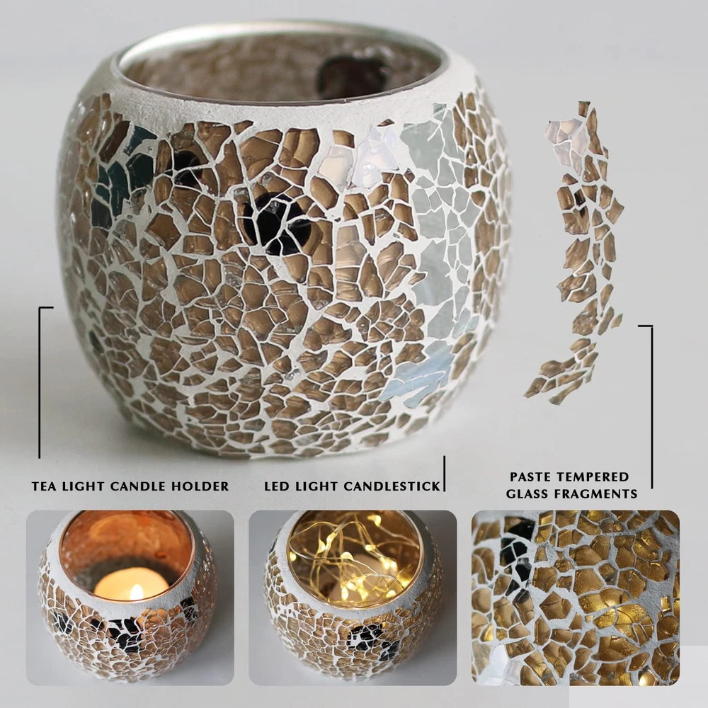 These candle holders are absolutely stunning! The delicate mosaic design and cracked glass give them a romantic, vintage charm. Perfect for weddings, dinners, or adding cozy ambiance to any space. The nude gold color is elegant and versatile—great for Valentine’s, Christmas, or everyday decor. Handmade with care, they’re a beautiful addition to any table setting. Love how they catch the candlelight! Highly recommend for anyone looking to add a touch of warmth and elegance to their home.