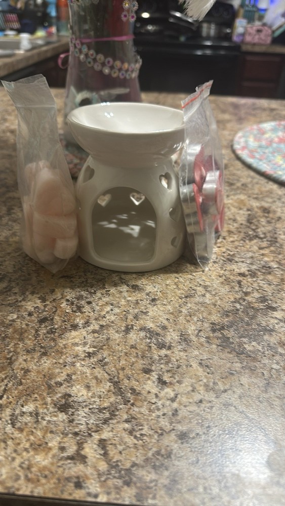 This wax warmer set includes a heart-shaped ceramic wax warmer in silver color, designed for everyday use. It is handmade and measures 5 inches in both length and width, making it small and modern in style. The set also includes wax melts with assorted scents like tea, perfect for aromatherapy in the living room. Additionally, tea lights are included for easy use of the wax warmer, providing a cozy and love-themed ambiance to the room. Made in China, this product is ideal for adults looking to create a soothing atmosphere in their home. Wax made by me
