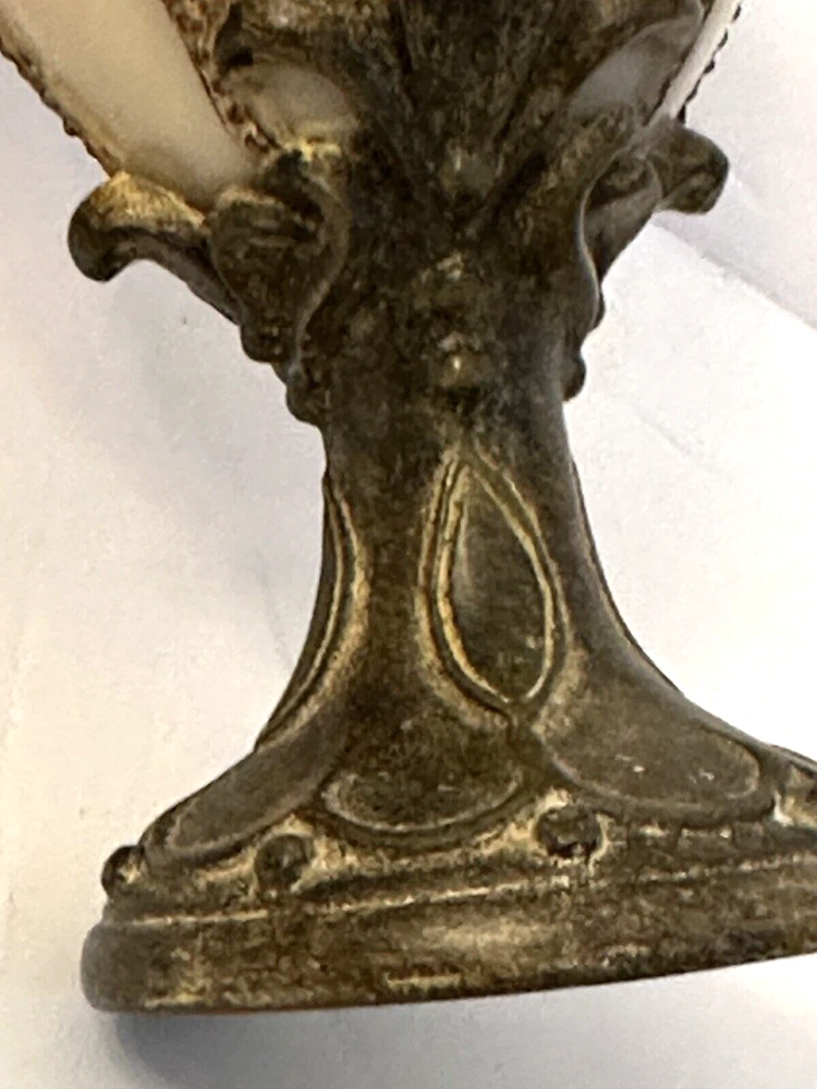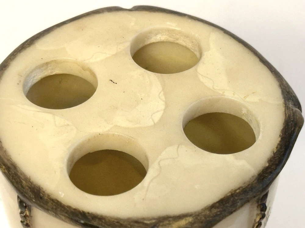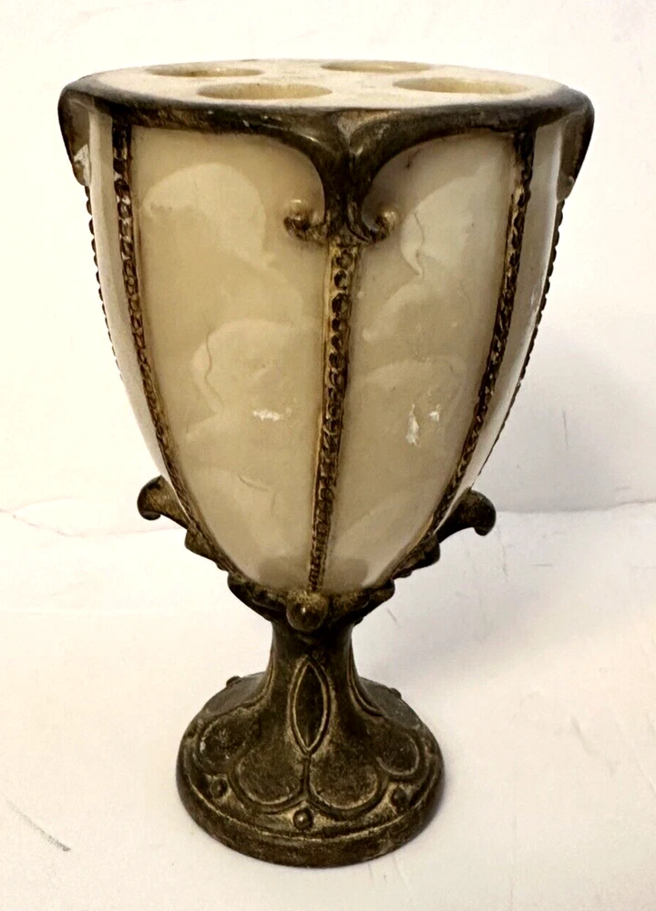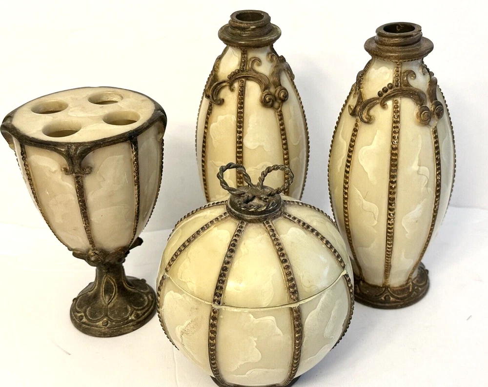 1- Romanza vanity potpourri, or trinket jar / dish with lid cover, hand painted bronze color metal rope and faux marble finish. Measurements: Diameter 4.5” Height 5” Weight 14.9 oz * Excellent condition 1 - Romanza toothbrush holder with ornate base and bronze metal rope accents. Height 5.5” Diameter 3” Weight 11 Oz 2 - Romanza lotion or soap dispensers (pumps are missing but generic pumps can be used instead or they can be used as bud vases) Height 7” Diameter 2.5” Weight each 11 oz