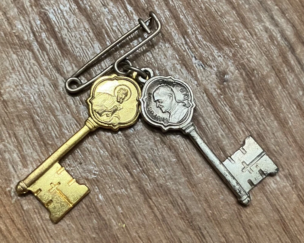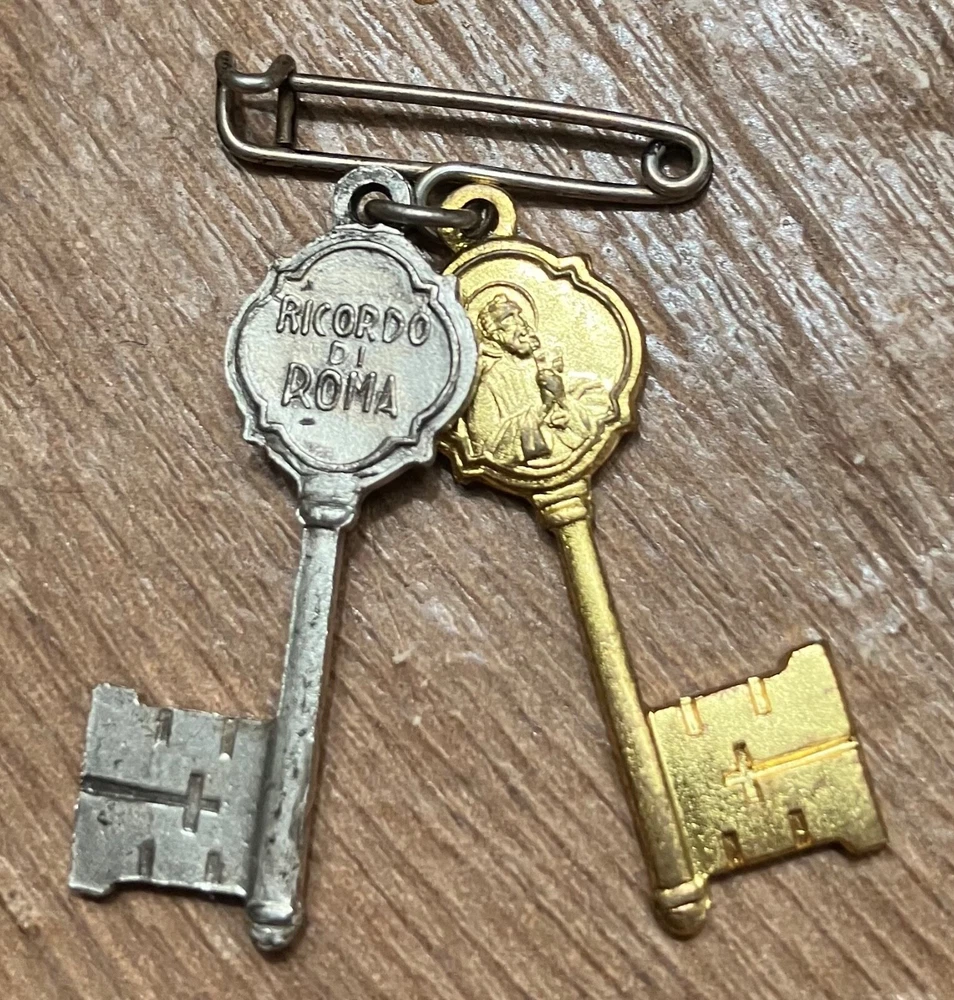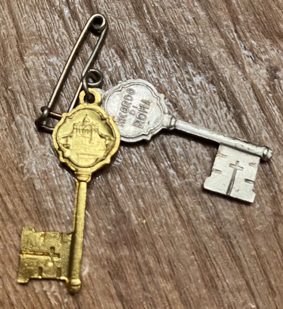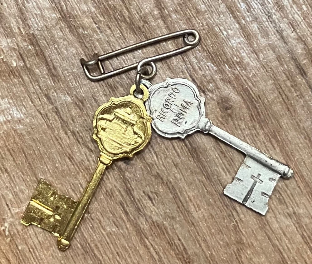 This is a lovely vintage pin from the 1960’s, when Paul VI was pope. One of the images on the keys is of Pope Paul VI. Another is the words, “Ricordo di Roma”, which means “souvenir of Rome” in Italian. A third image is of the Vatican, and the fourth is of a Saint, I assume, because he has a halo behind his head. The two keys are hanging from a charming little safety pin with a loop in it. They don’t make them like that anymore! This is the sort of pin that would have been worn by a teenage girl in a Fellini film. A real retro gem.