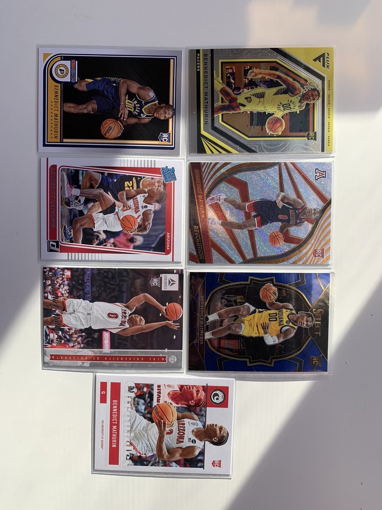 7 Cam Reddish and 7 Bennedict Mathurin RC - Mosaic base, Debut, & Pink Camo - Court Kings - Optic - Select - Revolution - NBA Hoops, Chronicles, Donruss, Flux Each mystery pack will contain 25 cards. 10 guaranteed Rookie cards, 3 guaranteed non-base inserts/parallels, 1 guaranteed HIT of an autograph/memorabilia/jersey patch/numbered card. These packs will be comprised of a wide array of basketball cards including prints from the following series; Panini Select, Prizm, Prizm draft picks, Mosaic, National Treasures, Illusions, NBA Hoops, Flux, Chronicles, Threads, Contenders, Optic/Donruss, Essentials, Status, Revolution, Prestige, and more!