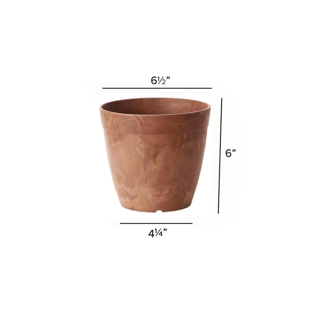 Flaunting a sophisticated wide-rim top and natural marbled finish, the Dolce Round Planter is a step-up from the traditional round planter. Made from Artstone, our BPA-free, weather resistant, proprietary blend of natural stone and recycled resin, the pot is lightweight, yet durable. The Dolce Round Planter works well to complement existing interior or exterior spaces. For use outdoors, the bottom of the planter is gently lifted with a footed base. In addition, the planter has a removeable rubber stopper to promote air flow and proper drainage. For added functionality, the built-in self-watering feature, the Water-Minder, keeps plants hydrated so you dont have to water as often. This planter is available in a multitude of sizes and colors to meet the requirements of any plant, flower, or small shrub and style. Classic, rimmed planter made with Artstone, a superior blend of stone and resin Each pot features a -of-a-kind weathered marble facade Built-in self-watering feature keeps you plants hydrated and prevents overwatering and underwatering Eco-friendly planter made with BPA-free, recycled materials This lightweight Artstone planter can be used indoors or outside since it is waterproof, frost-resistant, and UV-resistant