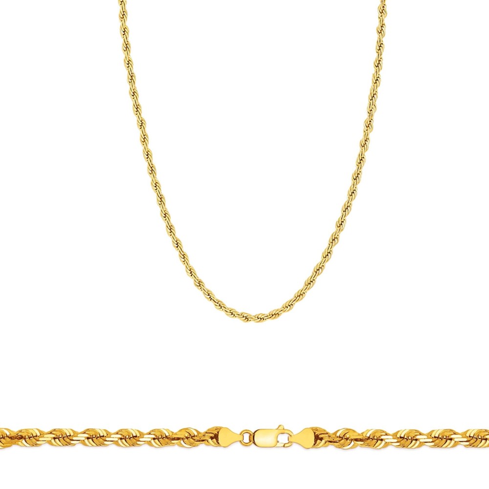 Title Rope Chain in Yellow Gold - 2mm PRODUCT DESCRIPTION Elevate your jewelry collection with our exquisite Rope Chain in Yellow Gold - 2mm. Crafted with precision and care, this stunning chain is designed to make a bold yet sophisticated statement. Its delicate 2mm width offers a perfect balance of subtle elegance and eye-catching appeal, making it an ideal accessory for any occasion. Handcrafted from premium 18K yellow gold and finished with a meticulous diamond cut, this rope chain boasts a *bright, lustrous finish* and intricate detailing that enhances its timeless charm. The durable construction ensures *strength and flexibility*, allowing you to wear it comfortably day after day without worry. Available in multiple lengths—from 16" to 30"—this versatile piece seamlessly complements both casual and formal outfits. The secure lobster clasp ensures *easy wear and reliable closure*. Whether layered with other chains or worn alone as a statement piece, this gold rope chain effortlessly adds a touch of luxury to your look. Quality Material: 18K Yellow Gold Plated for lasting shine Elegant Design: Classic Rope Style with 2mm width Multiple Sizes: 16" to 30" lengths to suit your style Secure Closure: Durable Lobster Clasp for peace of mind Lightweight & Comfortable: Approximate weight varies from 12.20 to 22.15 grams based on length Upgrade your jewelry collection today with this timeless Rope Chain in Yellow Gold - 2mm. Perfect for daily wear or special occasions, it’s a versatile investment that combines elegance with durability. Don’t miss the chance to add this essential piece to your wardrobe—order now and shine with confidence! Powered by