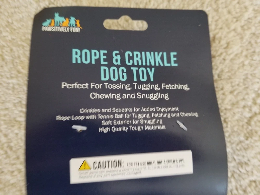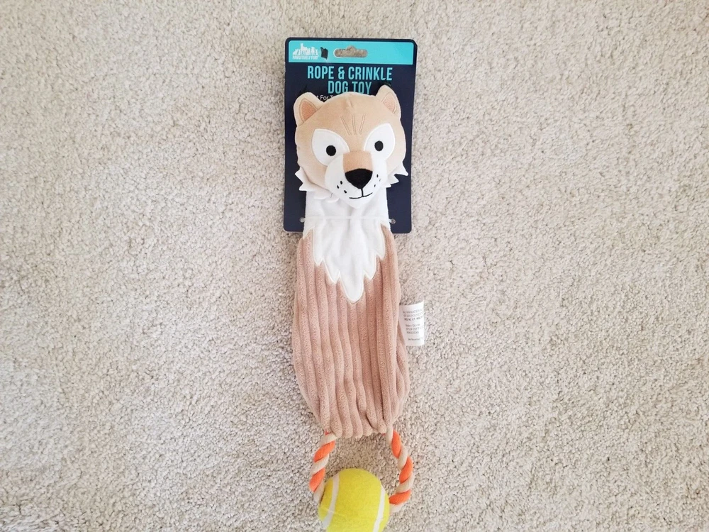 17" Rope & Crinkle Squeaky Dog Toy with a Tennis Ball, designed by Pawsitively Fun. It is made of plush material and features both a squeaky component and a tennis ball for added entertainment for your pet. Brand new. Please view photos.