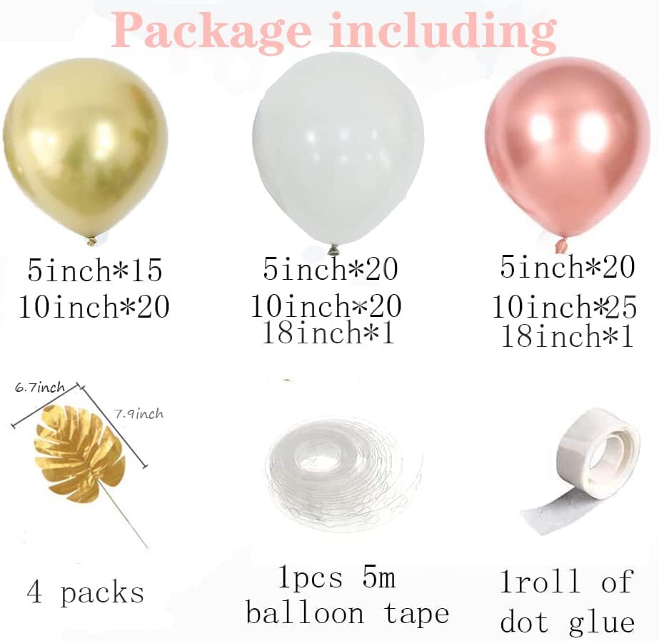 PageebO Rose Gold Balloon Arch Kit-126pcs Rose Gold Balloons Sand White Balloons Chrome Gold Balloons with Golden Leaf for Baby&Bridal Shower, Birthday Party, Wedding, Grad, Anniversary Party Package including:This pack including 126pcs balloons.15pcs 5inch/20pcs 10inch gold balloons,20pcs 5inch/20pcs 10inch/1pcs 18inch sand white balloons,20pcs 5inch/25pcs 10inch/1pcs 18inch rose gold balloons,4 packs golden leaf.Two tools-1pcs 5m balloon tape,1roll of dot glue. Quality material:The balloons made with natural latex,non-toxic. Every balloons have been rigorously tested and selected manually. Many occasions:Baby Shower,Wedding, Engagement, Anniversary, Wedding Receptions, Birthday Party, Girl Birthday, Business Celebration, Theme Party etc. Easy to use:Each size balloons have enough qty to let you make a pretty and astonishing balloon garland kit.Also including three tools which can help you to make balloon arches more easily. SERVICE:We are committed to providing you only the best quality party supplies. With a dedicated team that excels at the customer experience, we are confident we can make you happy and give you the event of your dreams! Package including:This pack including 126pcs balloons.15pcs 5inch/20pcs 10inch gold balloons,20pcs 5inch/20pcs 10inch/1pcs 18inch sand white balloons,20pcs 5inch/25pcs 10inch/1pcs 18inch rose gold balloons,4 packs golden leaf.Two tools-1pcs 5m balloon tape,1roll of dot glue. Quality material:The balloons made with natural latex,non-toxic. Every balloons have been rigorously tested and selected manually. Many occasions:Baby Shower,Wedding, Engagement, Anniversary, Wedding Receptions, Birthday Party, Girl Birthday, Business Celebration, Theme Party etc. Easy to use:Each size balloons have enough qty to let you make a pretty and astonishing balloon garland kit.Also including three tools which can help you to make balloon arches more easily. SERVICE:We are committed to providing you only the best quality party supplies. With a dedicated team that excels at the customer experience, we are confident we can make you happy and give you the event of your dreams! Shipping from the USA All of our products are shipped from the USA, ensuring quick delivery to your destination. Payment We offer the following payment methods: PayPal, credit card, bank transfer, and eBay's secure payment system. Free Shipping & Free Returns Shipping within the USA is FREE. Additionally, any return is absolutely free for you. Risk-Free Purchase You have the option to return an item within 30 days without any justification. We cover the return shipping costs! Fast Shipping We ship immediately upon receipt of payment. Generally, the package is delivered within 2-3 days in the USA. If it takes longer, we will contact you. Quality and Costs Made in Europe, USA, China No customs fees or additional charges Total satisfaction guarantee Invoice with declared VAT available upon request in .pdf format Feedback Your feedback is very important to us. After you pay for your purchase, you will automatically receive positive feedback from us.