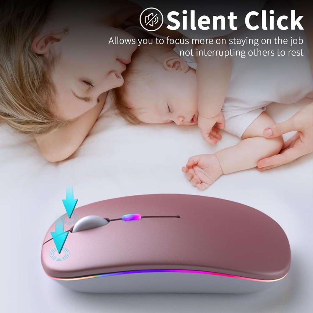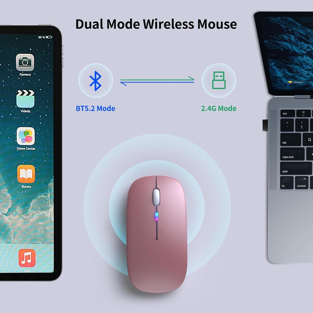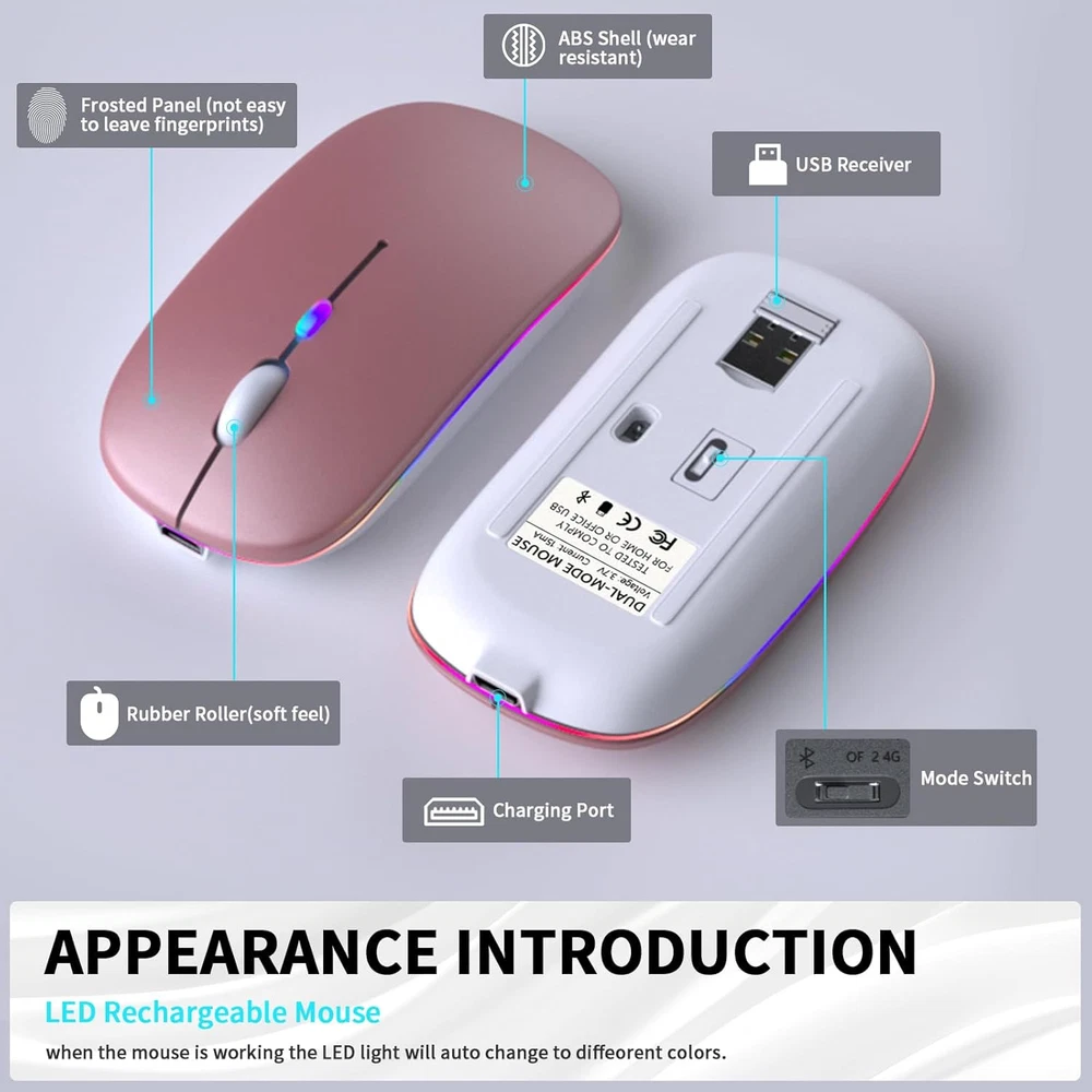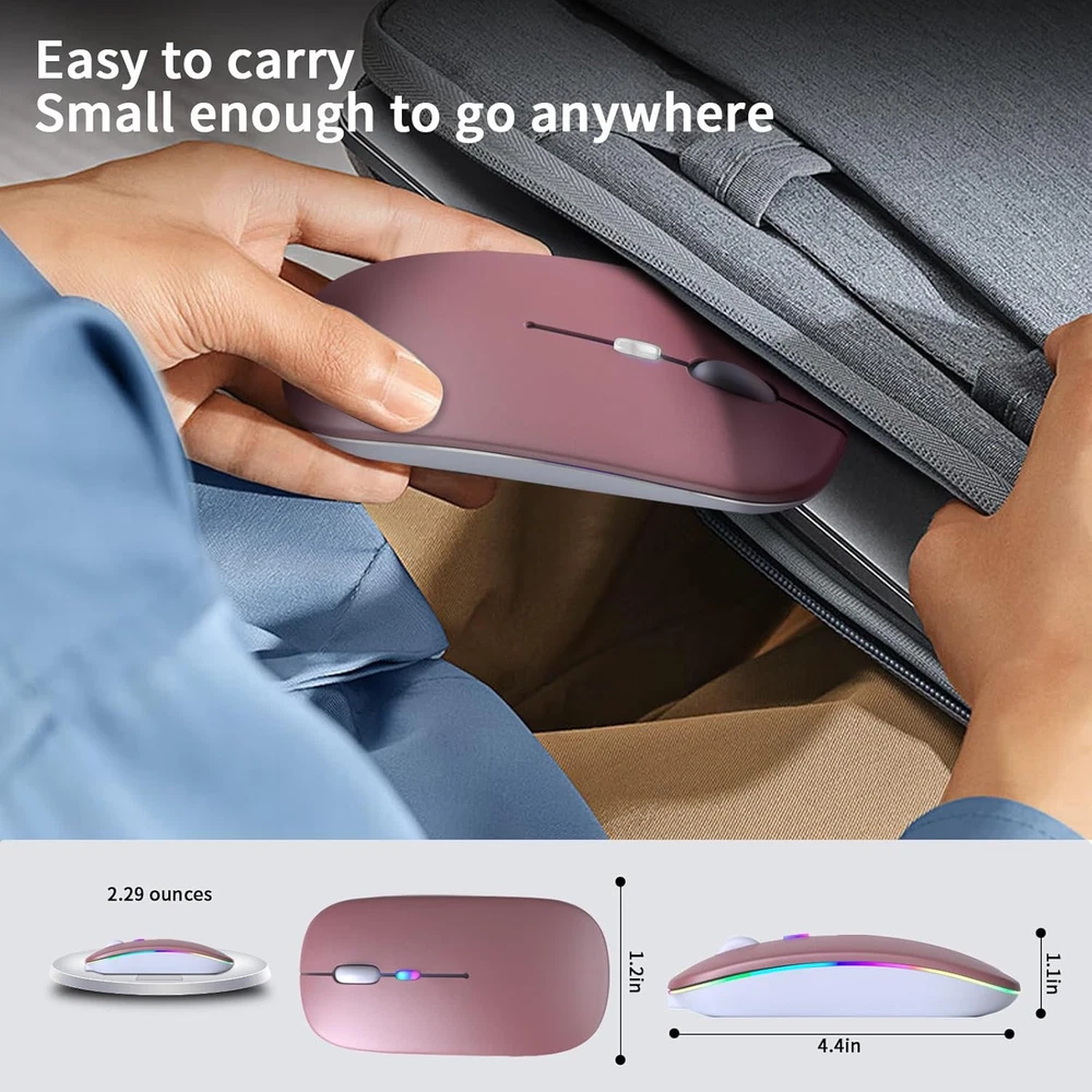 Wireless Bluetooth Mouse, Rechargeable LED Dual Mode Mouse Rose Gold Product Details Product Dimensions: 4.4 x 2.3 x 0.1 inches Item Weight: 2.1 ounces Manufacturer: KANMABPC Country of Origin: China Brand: KANMABPC Color: Rose Gold Connectivity Technology: Bluetooth Special Feature: Wireless, Portable, Rechargeable, Soundless, LED Lights Movement Detection Technology: Optical 【Rechargeable Silent Mouse】: Built-in rechargeable battery, no need change battery.it can be easily charged using the included USB cable. 2 hours charging, you can use it for 7-15 days. Special soundless design for the right and left buttons, Noiseless click, no worrying about disturbing others beside you, let you concentrate on work. 【Colorful Light】: 7 different color changes randomly while in use, offering soothing lighting, creating cool and fancy atmosphere for work and play.This wireless mouse Bluetooth with lights can give you more fun during office time. 【Energy Saving】: The mouse will be in sleep mode in 5 mins of inactivity. You can choose use the 2.4G wireless mouse when the mouse botton switch is on the 2.4G mode,or connect your laptop's Bluetooth to use the Bluetooth mouse, easy to switch,suitable for any occasion. 【Portable Mouse and Operation Notice】: Size About 4.4 x 2.3 x 1.1 inch,it can be easily put into your laptop bag and ultra-space saving.Slim and lightweight,durable ergonomic mouse is perfect for travel.The USB receiver is stored inside the back of the mouse.No need for a driver,Plug and Play!Automatic sleep mode and wake-up mode are installed to save energy.Pls Turn off the mouse LED light when not in use to expand the using life. 【WIDE COMPATIBILITY】: Accurate wireless bluetooth mouse with a working distance up to 10 meters (33 feet) for fast data transfer without delay or loss. Compatible with Windows XP, Vista, 7, 8, 10, 11, Windows ME, Mac OS and more. Also supports bluetooth connection, this LED wireless + bluetooth mouse is perfect for desktop, laptop, tablet, PC, Macbook, iPad and other bluetooth devices. for home, office, travel and more. Colorful LED rechargeable dual-mode Bluetooth mouse (Bluetooth 5.2+USB 2.4G) Note: Cannot be set to a specific color. One mouse, multiple devices Just press the mode switch button at the bottom of the mouse to control the device you want. Wide Device Compatibility Windows 8, Windows 10 or later, Android 5.0 or later, Mac OS X10.10 or later, iPad OS 13 or later, Chrome OSTM. charging function Built-in 500mA rechargeable Li-ion battery provides 7-15 days of working time and 1 month of standby time. It can be easily recharged with the included USB cable, eliminating the need for battery changes. Support charging while using, more power saving and more to charge it with phone charger adapters. portable The lightweight and slim design makes it ideal for travel and fits easily in a laptop bag or pocket. (Measures approximately 4.4 x 2.3 x 1.1 inches) Package Included: 1 wireless bluetooth dual-mode mouse 1 x USB receiver (in the mouse's battery compartment) 1 x USB charging cable 1 x User Manual