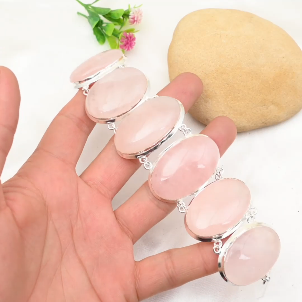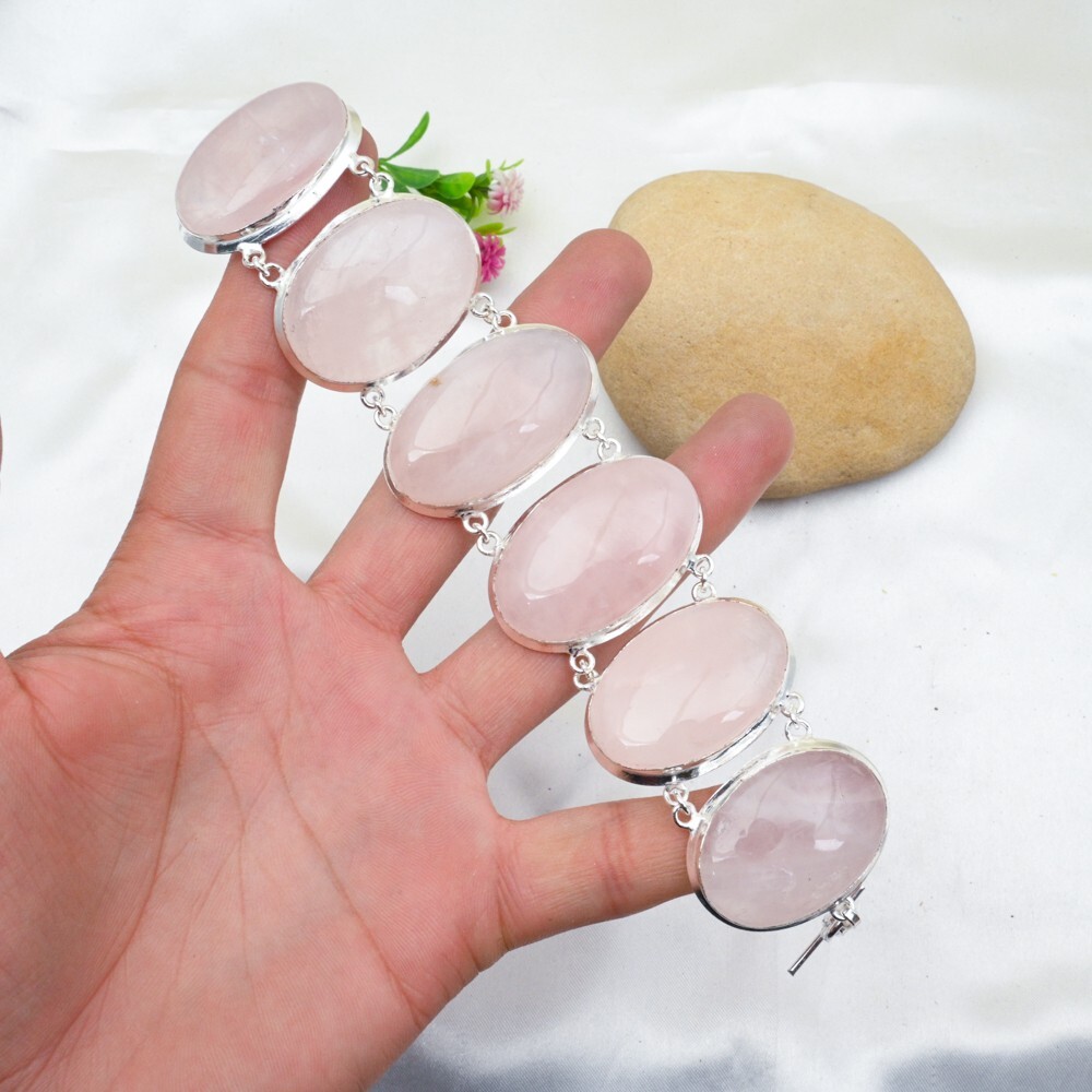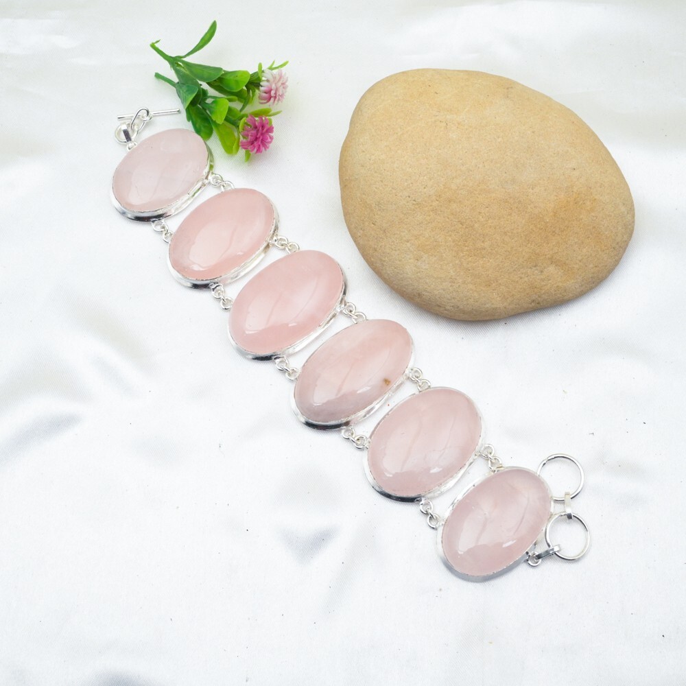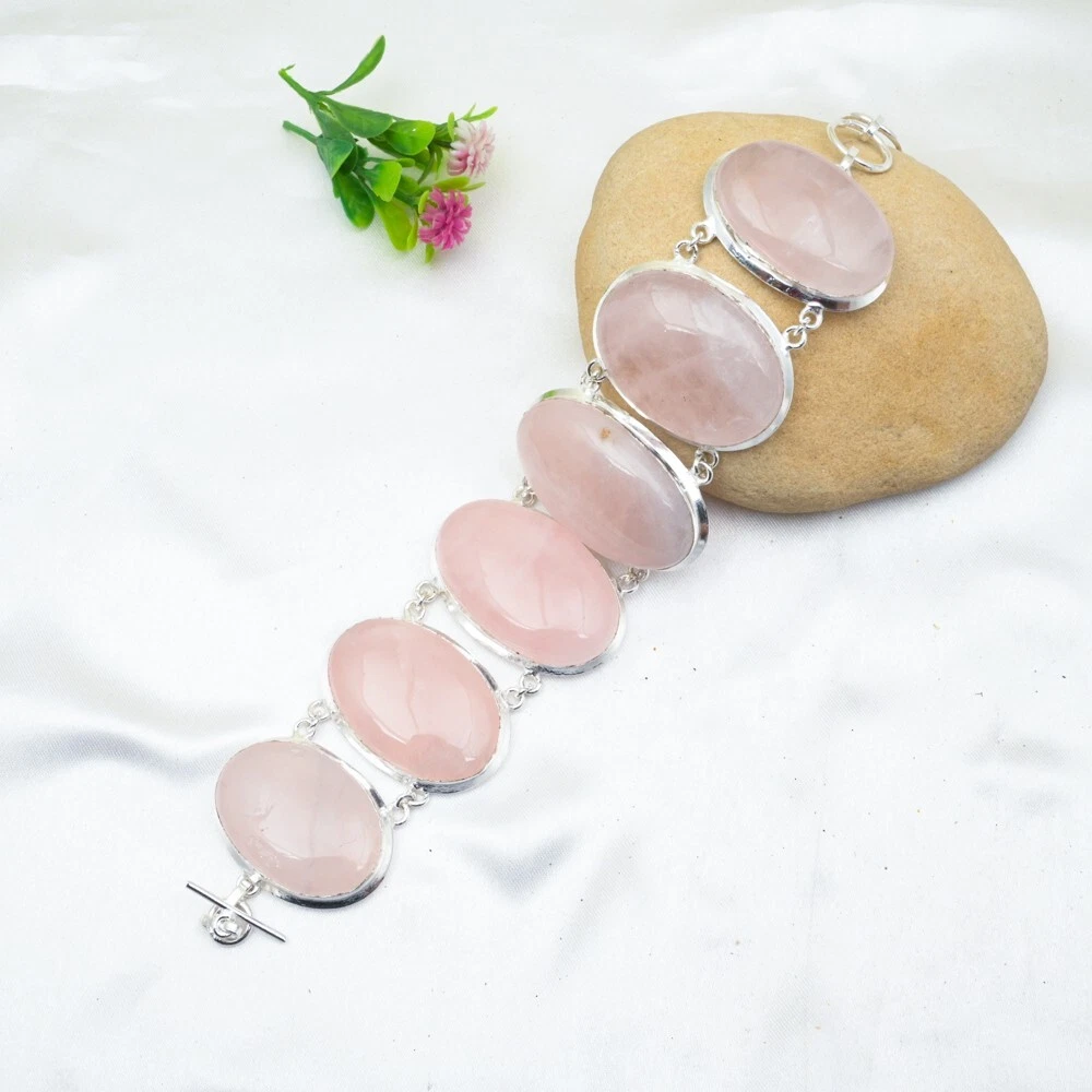 Main Stone Creation:NaturalMain Stone Length:N/AOccasion:Anniversary, Birthday, Christmas, Engagement, Mother's Day, Valentine's Day, WeddingSetting Style:BezelCut Grade:ExcellentMetal Purity:925Number of Diamonds:N/ADiamond Clarity Grade:N/ACountry/Region of Manufacture:IndiaCharm Type:Same As PictureFeatures:AdjustableMain Stone:Rose QuartzMain Stone Color:PinkTotal Carat Weight:10 carat and aboveMain Stone Width:N/AColored Diamond Intensity:N/AItem Length:8 inches with Adjustable ChainMain Stone Depth:N/ACertification:N/AMetal:Sterling SilverMaterial:GemstoneStyle:ChainCollection:HandmadeShape:Same As PictureColor:SilverBase Metal:Sterling SilverType:BraceletBrand:HandmadeCountry of Origin:IndiaMain Stone Shape:OvalTheme:Beauty, Bohemian, Ethnic, Halloween, LoveSecondary Stone:Rose QuartzChain Type:N/AClosure:ToggleMain Stone Treatment:Not EnhancedNumber of Gemstones:6Diamond Color Grade:N/A