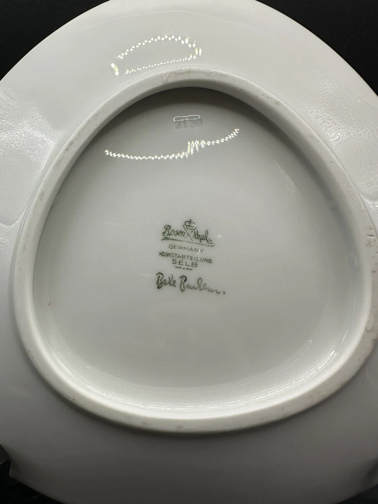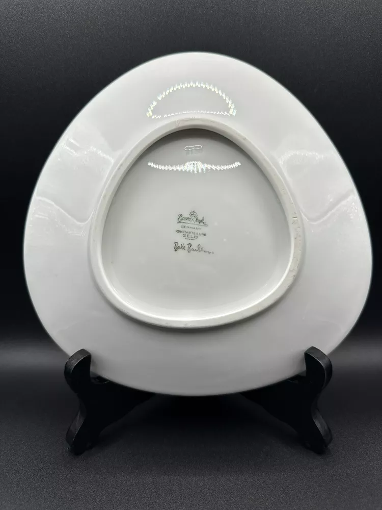 Vintage 1960s Decorative Plate by Rosenthal. Designed by Bele Bachem Excellent condition, no chips or cracks The is one of two similar Rosenthal Plates in my eBay shop that have been designed by Bele Bachem for Rosenthal, Germany They both date to the 1960s - and are fully marked to the back of each plate, as photographed. The plates are made of porcelain and are triangular in shape with three rounded corners. This one features a pretty young girl in pedal pusher slacks, a pink blouse and a large sun hat. She is resting in an orchard in the mid-day sun. There is a tree covered with flitting birds to the right - and in the mid-distance, there is a little man sitting in a horse-drawn cart and going along a dust road in the fields and towards the hills in the far distance. Each side of the plate is 7 3/4 inches. It is in good condition with no damages or condition issues.