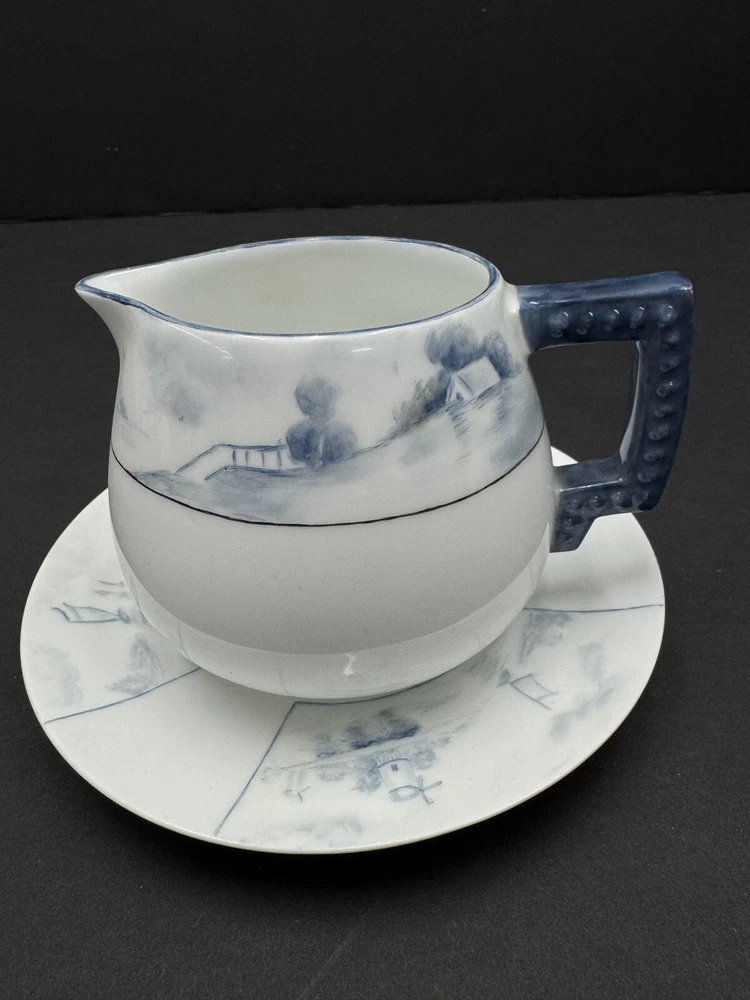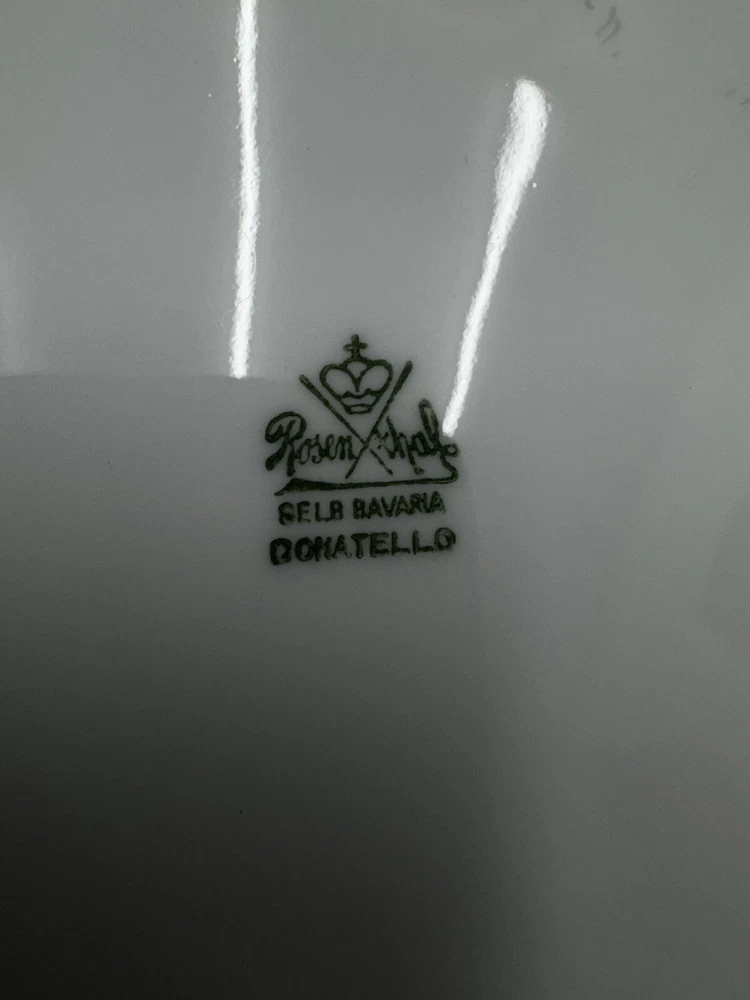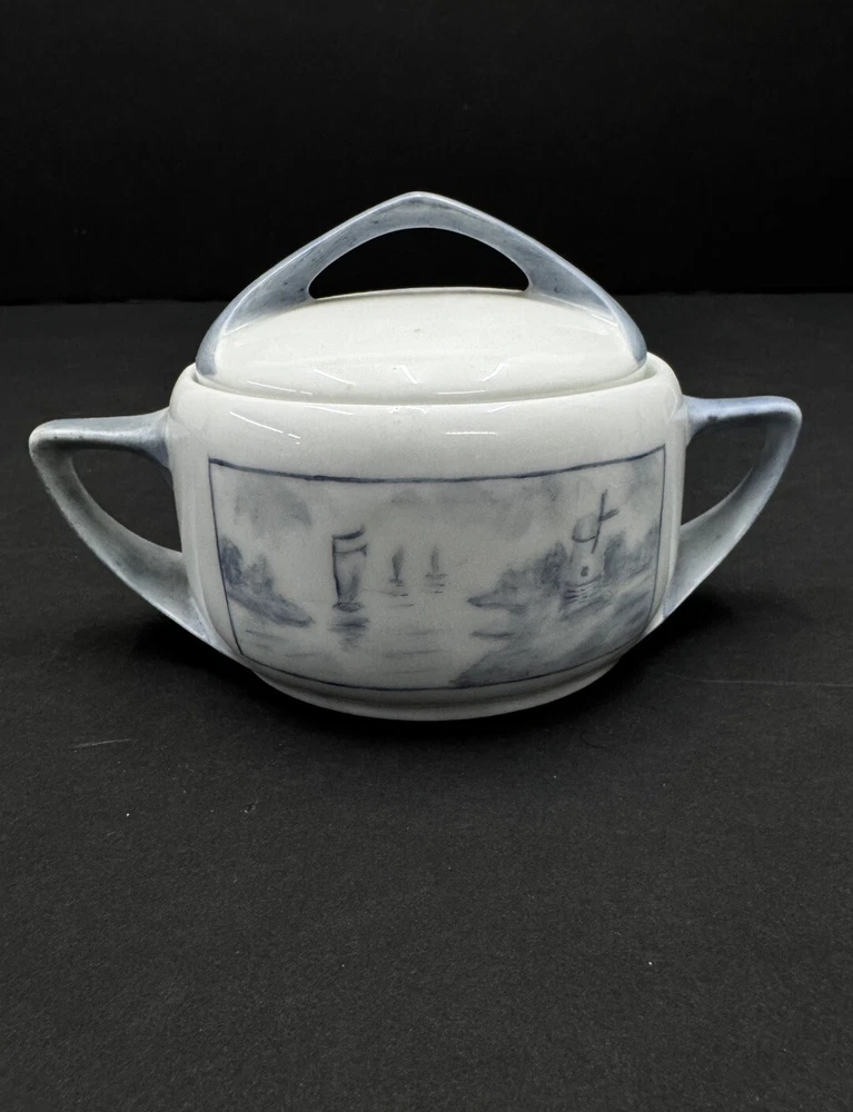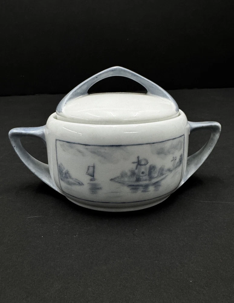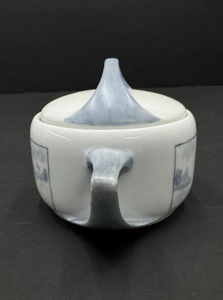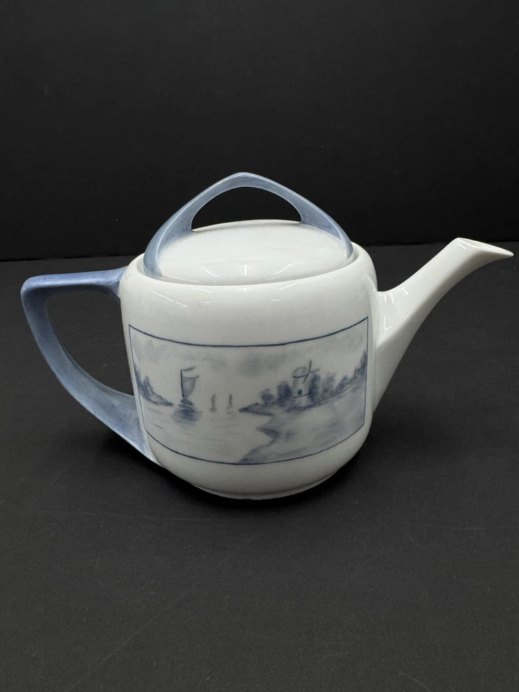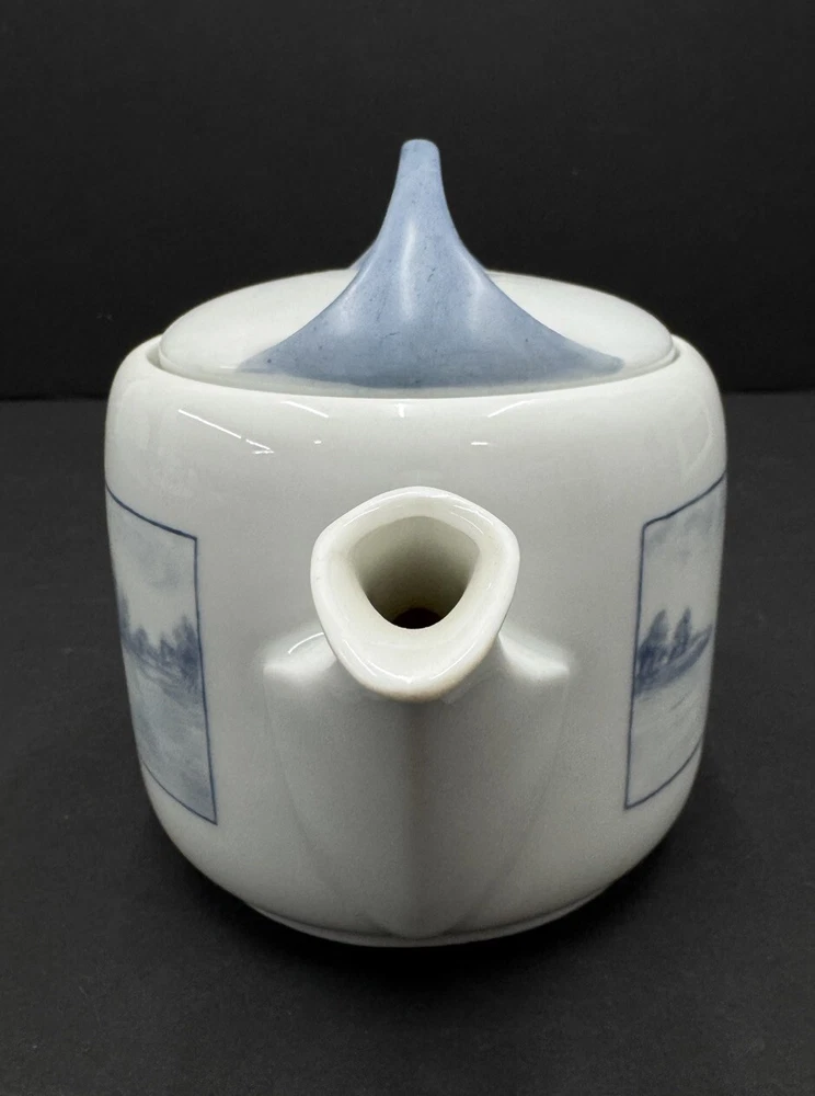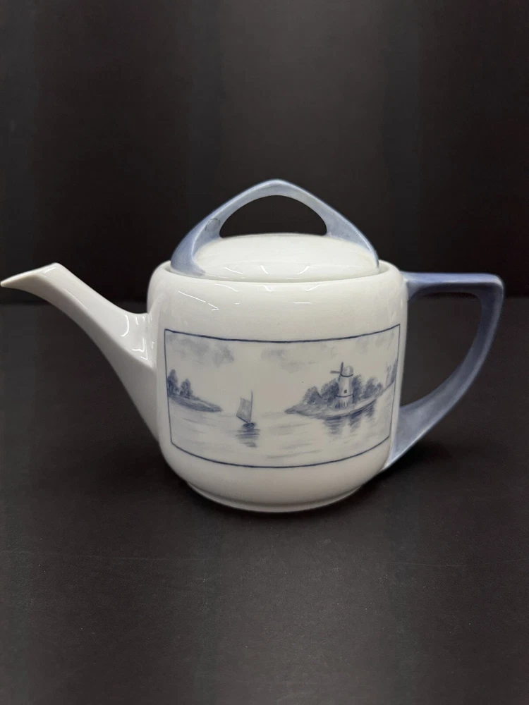 This Rosenthal Donatello Tea Set is a beautiful addition to any collection. The set includes a medium-sized pot with a blue and white windmill pattern, lids, sugar bowl, creamer, and six cups. The pieces are made of high-quality porcelain and are perfect for all occasions. The set has a vintage feel, dating back to Germany's nature-inspired style. The set is original and licensed reproduction, making it a collector's item for tea enthusiasts. Add this to your kitchen or display it in your home as a collectible piece.