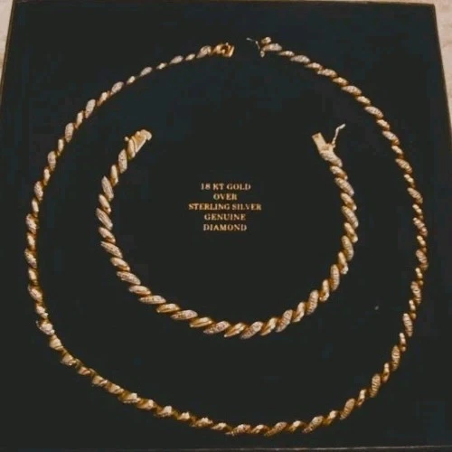 This Ross Simmons 925 Tennis Style Necklace, Bracelet, and Earrings set is a stunning vintage piece crafted with 18K yellow gold overlay over a 925 sterling silver Base. The set features diamond chips as the main stone. The jewelry set includes a Necklace that is 17.5 inches in length, (2) identical bracelets that are 7.5 inches in Length, Also Included is A Pair Of Matching Earrings. The Total Carat Weight of the Entire set is 29.5 Grams.