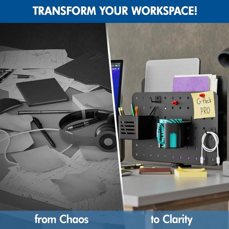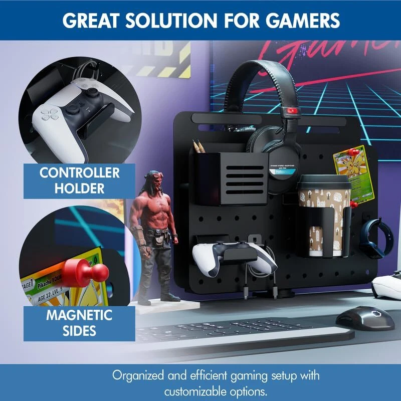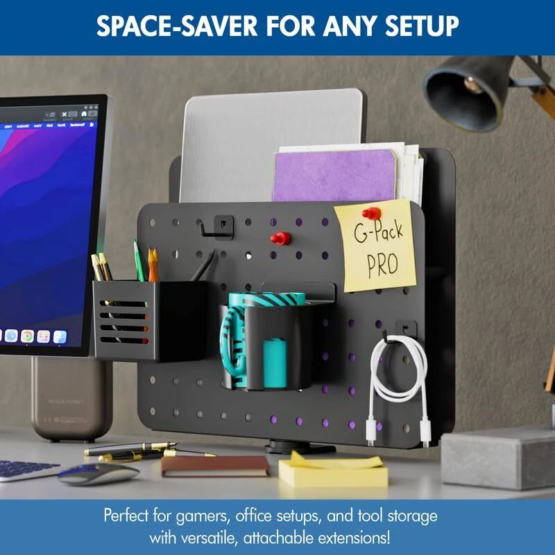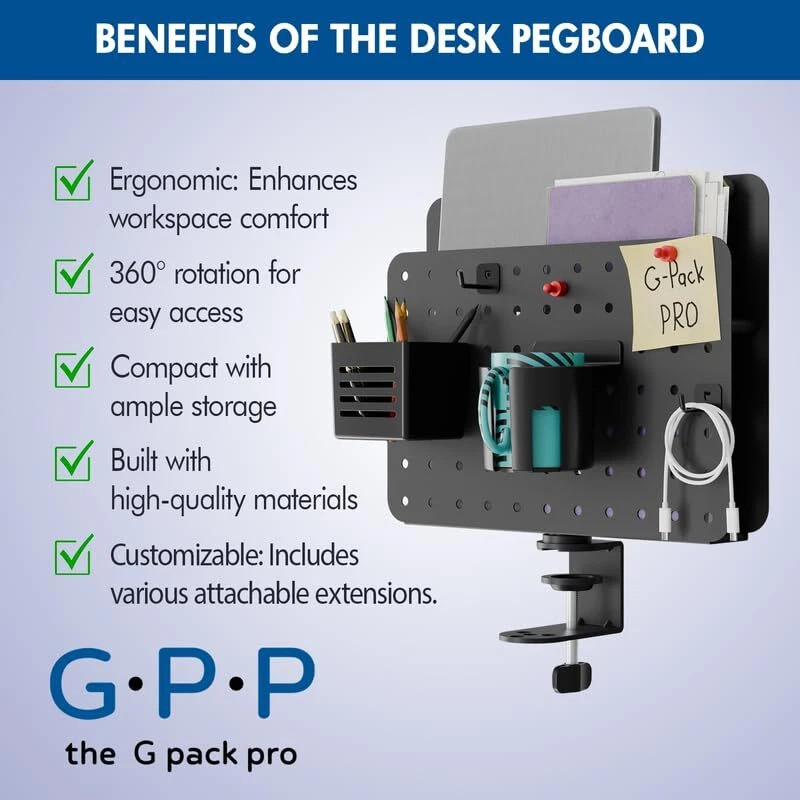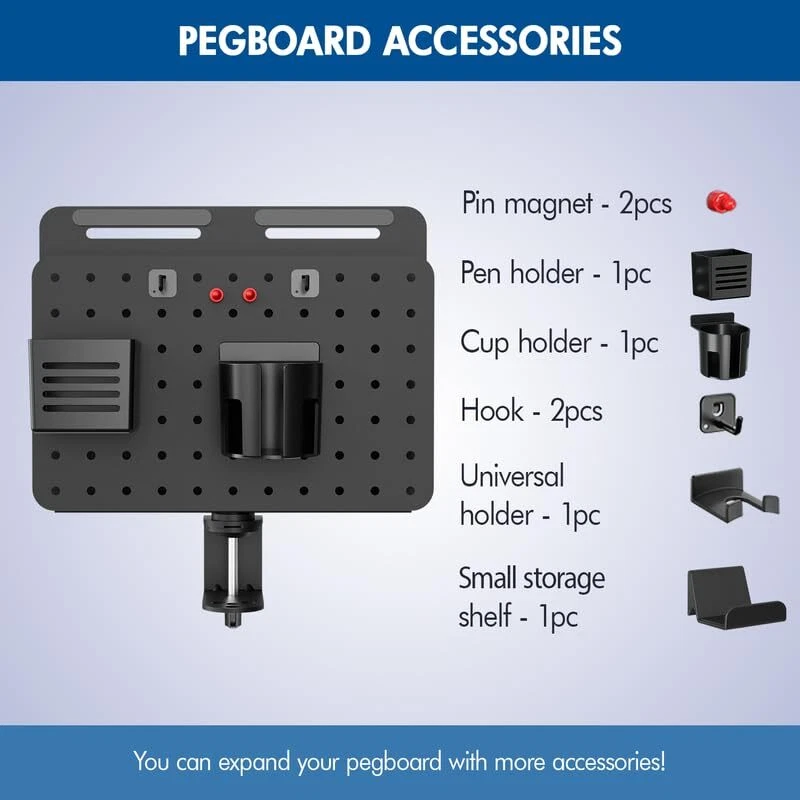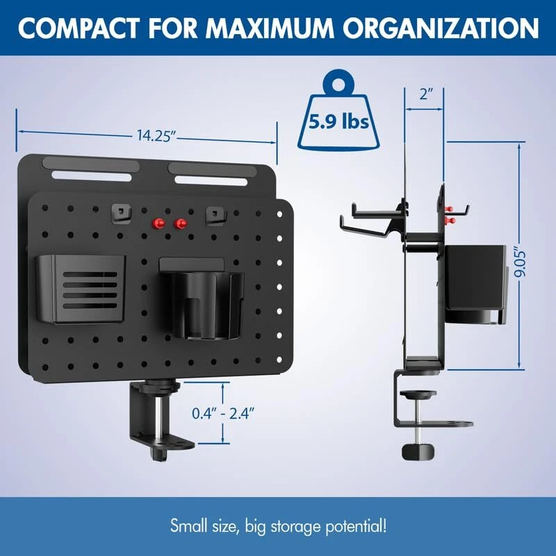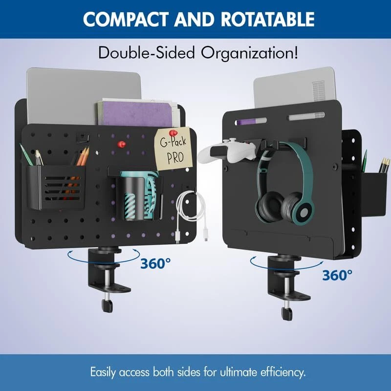 -Clamp-on Desk Pegboard – 360 Degree Rotatable, Desk-Mount – Desktop Gaming S1-Rotating-Black Effortless Pegboard Organization – Pegboard attaches securely to desk, creating a stylish and tidy workspace or privacy shield. Reduces clutter and makes finding items a breeze. Perfect for hanging headphones, storing pens, markers, and scissors within easy reach. Keep notes conveniently visible. Boost productivity and reduce with a more organized setup. Installs in Seconds - No drilling or nailing needed. This C-lamps onto your desk for convenient top mount. Fits just about any thickness up to a fat 2.4”. Many customers get several for more extensive organization. Use your imagination to upgrade your desk with added convenience and easier productivity. Large Built-in Storage - Includes hooks for headphones, designer box for pens, shelf for notebooks, space for notes, and more. Features standard pegboard holes for additional organization with widely available metal hooks. Sturdy Steel Construction - Made with rugged painted steel that will last and look good for years of beneficial use. Much better than fiberboard that chips, cracks, and falls apart with age. This is lightweight with an attractive black color that goes with all decor. So helpful you will wonder how you ever lived without it. Effortless Setup – Installation is a breeze with straightforward instructions for both above and below-desk mounting; Standard peg holes accommodate most pegboard hooks available, offering limitless possibilities for display and organization.