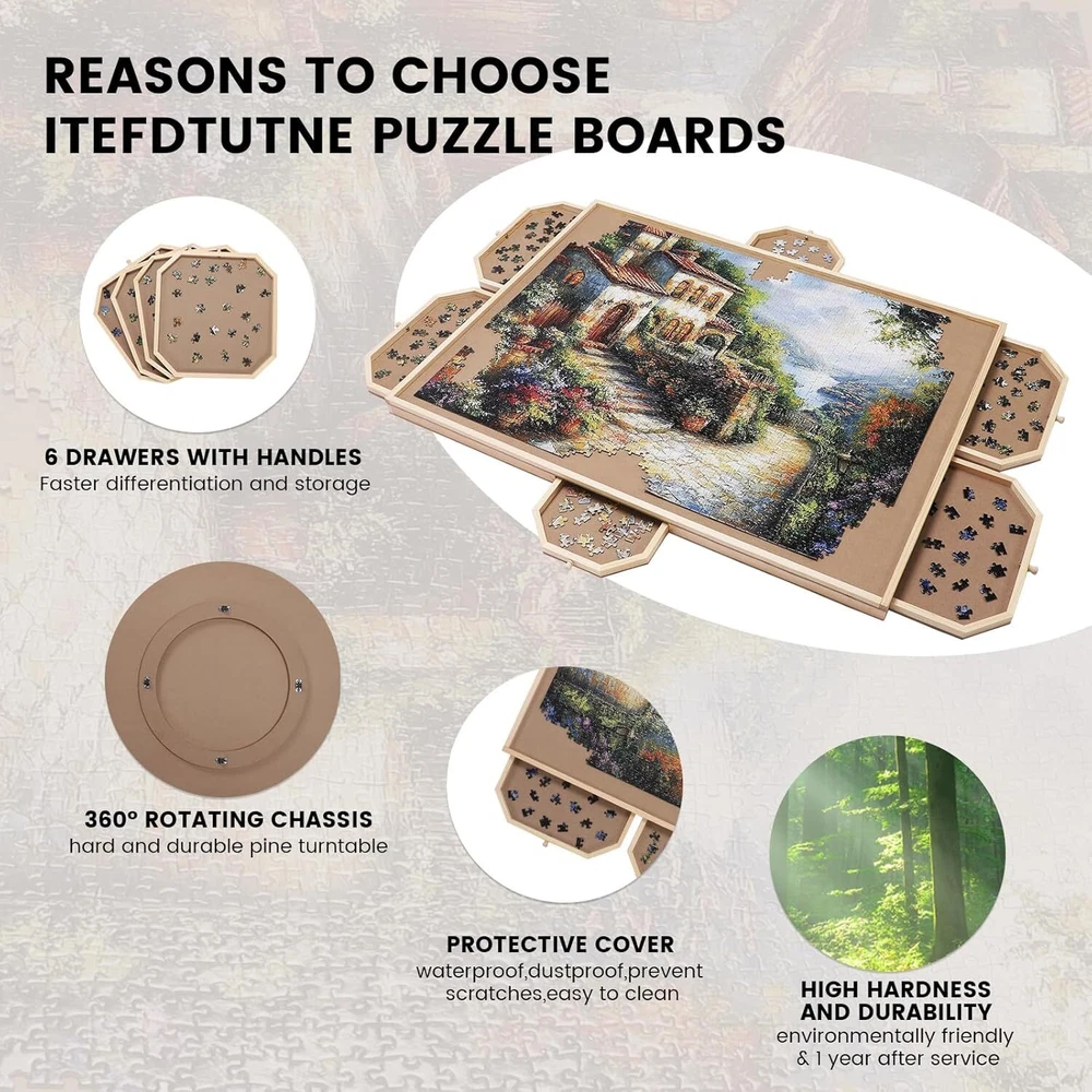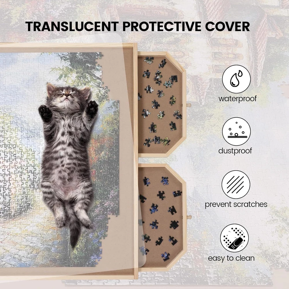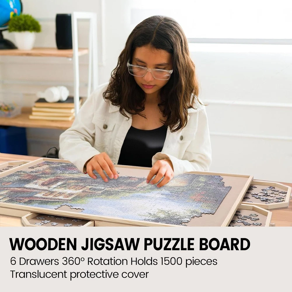 Rotating Jigsaw Puzzle Board with 6 Drawers and Cover, 35 "x 26" Wooden Puzzle Table for Puzzle Storage and Sorting, Portable Puzzle Enlightenment Board for Adults and Kids - 1500 Piece Product Details ROTATING PUZZLE BOARD WITH 6 DRAWERS: Our puzzle board with 360° rotation greatly improves the convenience of puzzles, allowing you to create beautiful puzzles easily and efficiently. The puzzle board with 6 drawers is designed for assembly and storage and can store up to 1500 pieces. Store your progress when you want to take a break and close the translucent lid to protect from dust, water and pets. DURABLES AND SMOOTH JUGGLE TRAY: 1500 pieces puzzle table uses top quality materials to make a smooth and sturdy surface to work with, allowing the puzzle pieces to slide into place easily and securely. Ensure that your puzzle board will not warp or collapse after a long time of use. PREMIUM QUALITY 35 "x 26" JUGGLE TABLE: The puzzle boards are made of high quality sustainable hardwoods, which are more load bearing and durables than plastic puzzle boards, making it a no-brainer and a worthwhile investment.The 35 "x 26" smooth work surface is large enough to hold most of the 1,500 pieces. 6 DRAWERS AND 1 LID: The 6 drawers are large enough for you to sort the puzzles by color, theme or border. Each drawer has been specially designed with a handle to ensure that all drawers are easy to open when in use, safely preventing puzzles from getting lost. The translucent included lid can contain your masterpiece from dust, water and pet damage. IDEAL GIFTS FOR PUZZLE LOVERS: Our puzzle table makes a birthday or holiday gifts for teens, seniors, or anyone who enjoys puzzles that enhance the overall puzzle solving experience while putting together your favorite pieces. Place the puzzle board on any surface (countertop, coffee table, beach blanket or floor) and have fun.