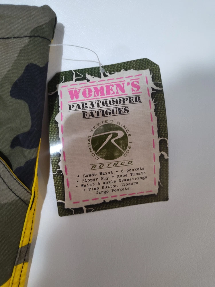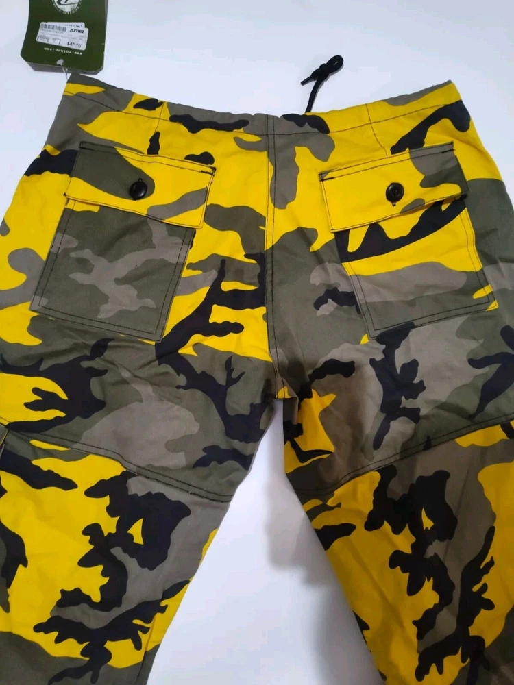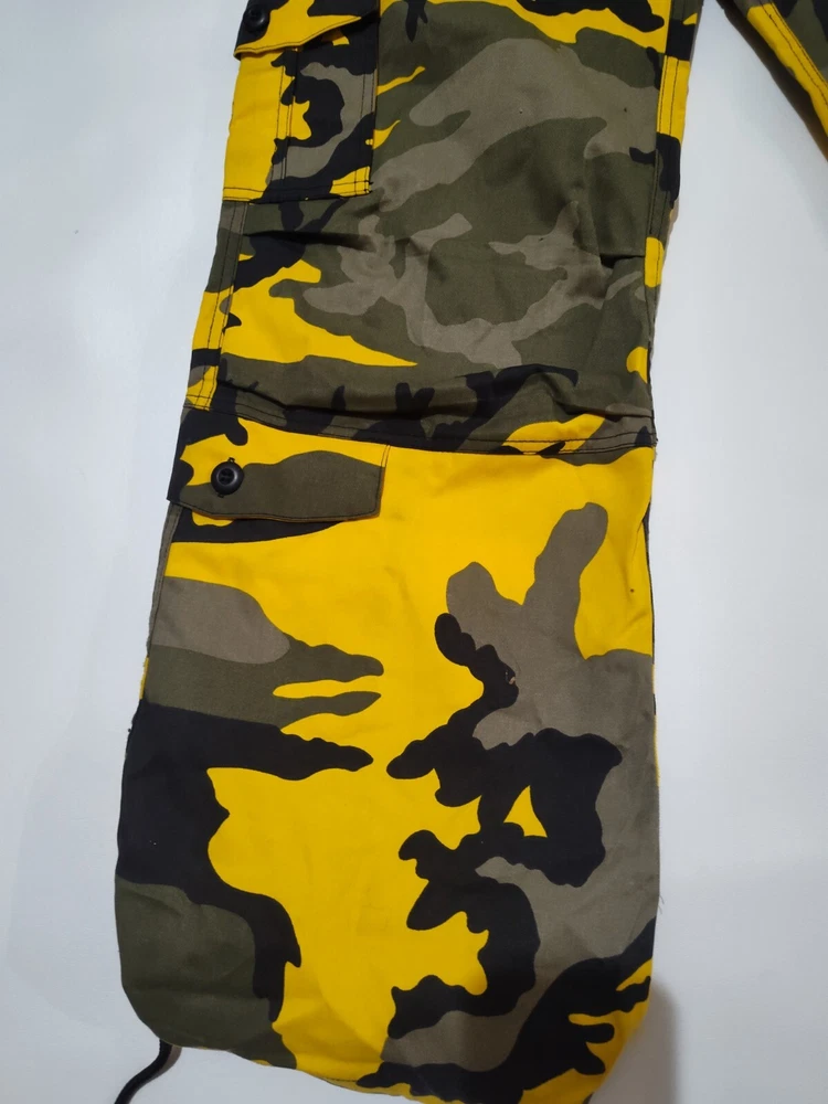 Elevate your streetwear game with these yellow Camo Cargo Pants from Rothco. These pants are perfect for travel, casual wear, and workwear. Made from durable cotton canvas material, these straight legged pants feature a flat front and a low-rise waist with a drawstring closure. With a total of 8 pockets, including 4 cargo pockets and 2 back pockets, these pants provide ample storage space for your essentials. The pants also come in a size small, with a 30-inch inseam and a waist size of 33"-35" drawstring. The camouflage pattern and accents, such as the pockets and zipper closure, make these pants a great addition to any urban or army-themed outfit. They were originally bought from Zumies.