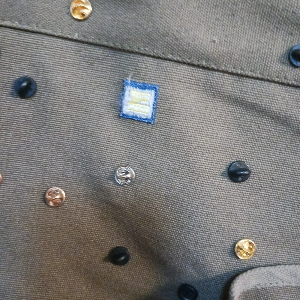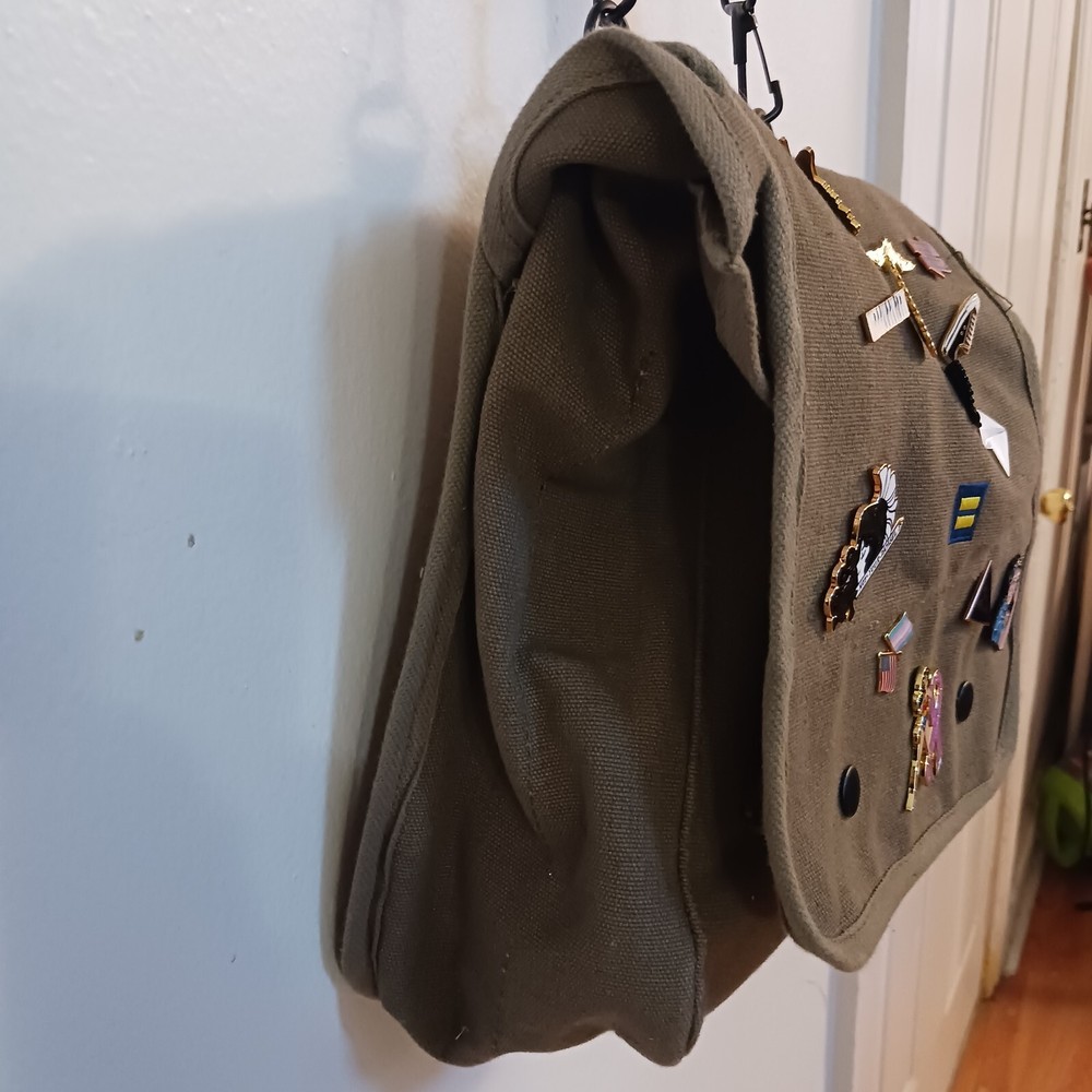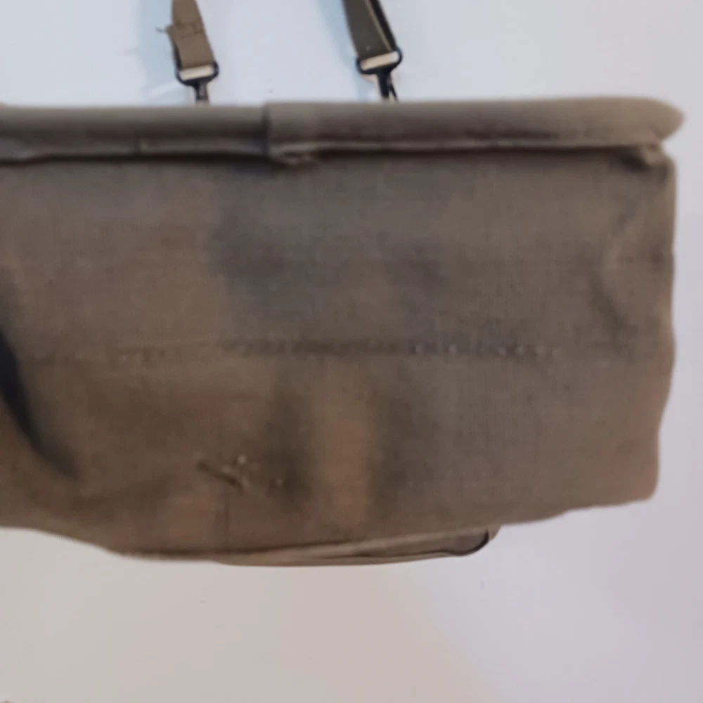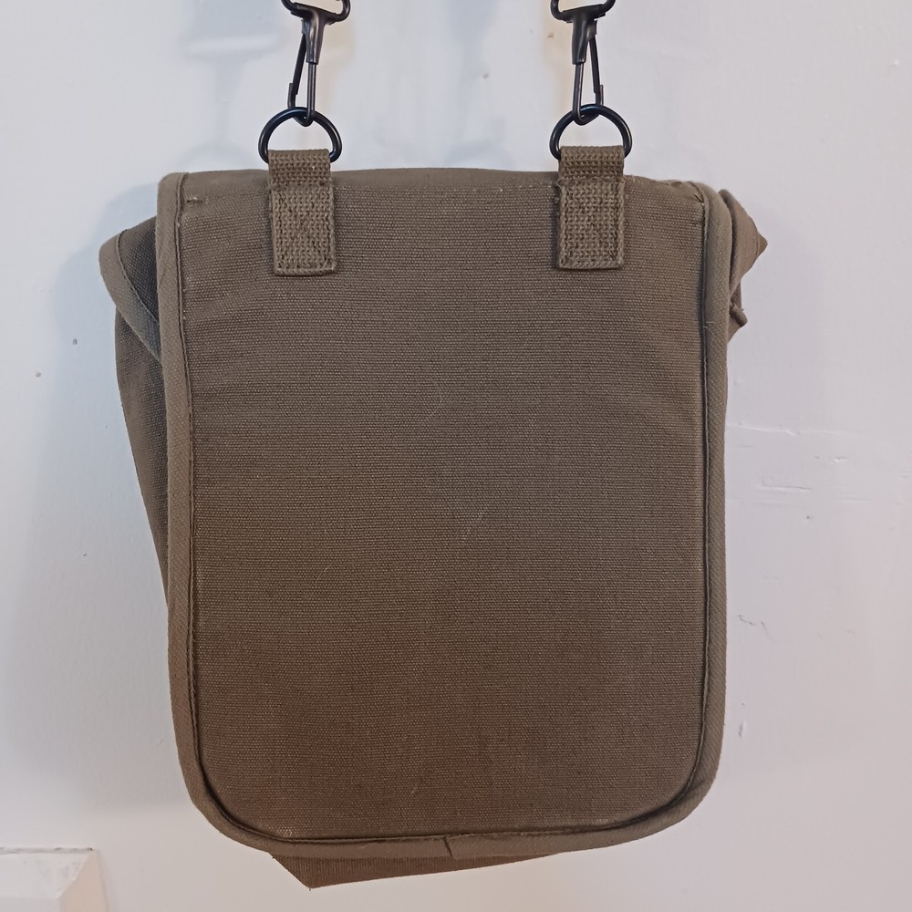 * loose thread on bottom (last pic) Smoke-free petfree Adjustable and removeable strap Two snap closure Outer pockets under flap Clean in and out Interior has 2 sections Dimensions 12" x 8.5" x 4.5" Best color description army green