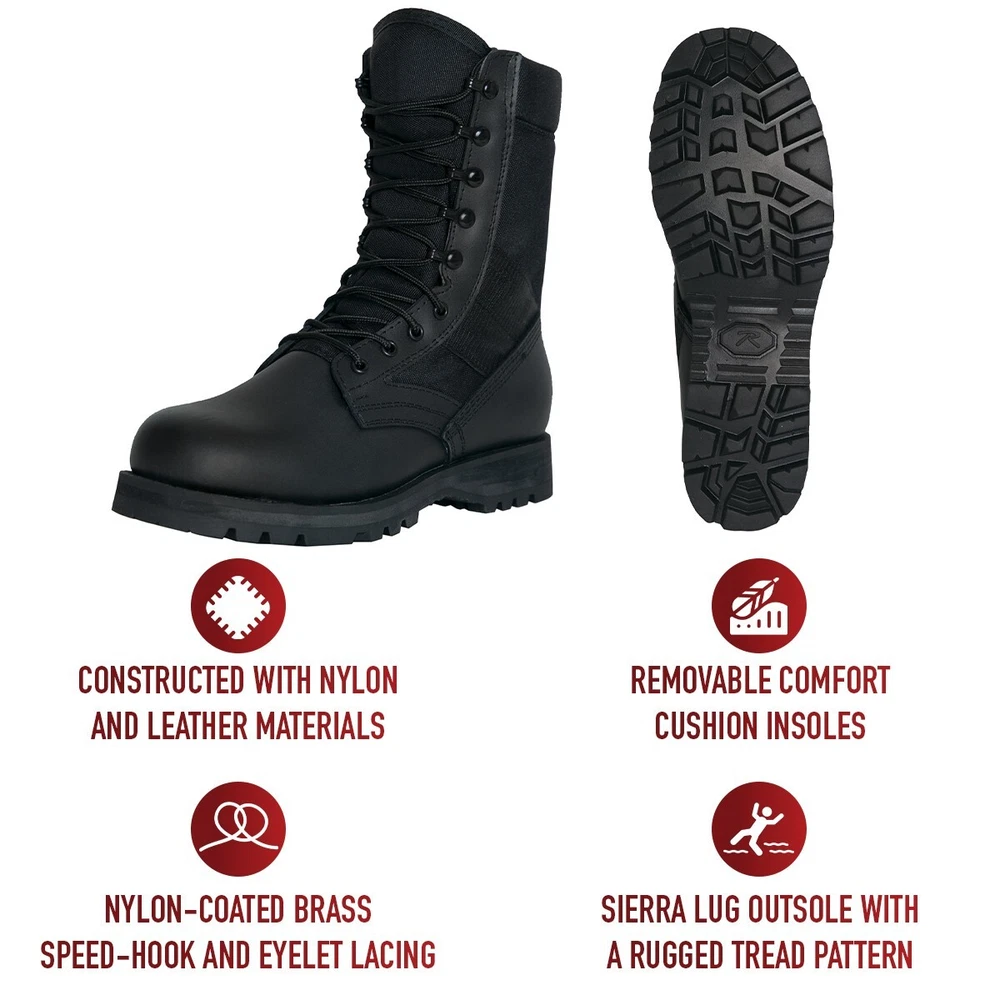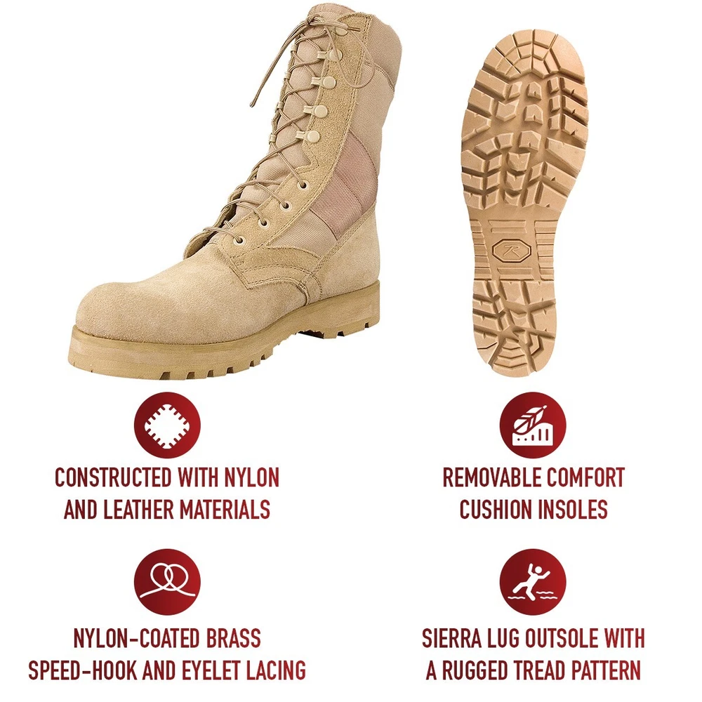 Looking for a pair of combat boots that are up to the challenge? If so, take pride in each step with Rothco’s Sierra Sole Tactical Boots. Designed for hot and dry desert environments, these military combat boots can also tackle any landscape. Whether you are in the military, law enforcement, public safety, or just looking for a sturdy work boot, this tactical combat boot is the ideal choice. They’re great for rucking, mountain climbing, camping, hiking, field work, everyday wear, and more. TRAVERSE ANY TERRAIN: Whether you’re on-duty or out on an outdoor adventure, take pride in each step with our Sierra Sole Tactical Boots. They’re great for rucking, mountain climbing, camping, hiking, field work, everyday wear, and more. BOOTS ON THE GROUND: These tactical outdoor combat boots feature a Sierra lug outsole with a rugged tread pattern for improved grip and traction to prevent you from slipping or falling while you’re on the move. TOUGH UPPER SOLE: The upper section of the military field boot is constructed with nylon and leather materials (Desert Tan is Suede Leather), providing unbeatable strength and durability. COMFORTABLE & PRACTICAL: The combat boot’s midsole heat barrier keeps your feet cool and protected from harsh climates. The removable cushion insole ensures all-day comfort, be it in the desert or other outdoor locations. COMFORTABLE FOOT SUPPORT: This rugged desert combat boot provides high ankle support when securely tied with the nylon-coated brass speed-hook and eyelet lacing system. The padded collar further enhances this support and protection around the ankle. STAYING ON YOUR TOES: Designed with precision and built to withstand the harshest conditions, our collection of footwear combines durability, functionality, and unparalleled performance. Rothco is the go-to brand for tactical and military footwear. Material Specs: AR 670-1 Coyote Brown ( Leather and Nylon), Black (Leather and Nylon Upper), Desert Tan (Nylon, Suede Leather Upper) | Components: Black Action Leather Upper, Padded Collar, Removable Cushion Insole, Midsole Heat Barrier, 4 eyelets - metal UPC Label On Product: No Material: Rubber, Leather, Nylon Brand: ROTHCO Gender / Age: Adult Weather: All Weather Closures And Fasteners: Laces