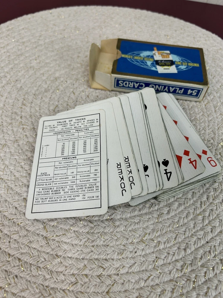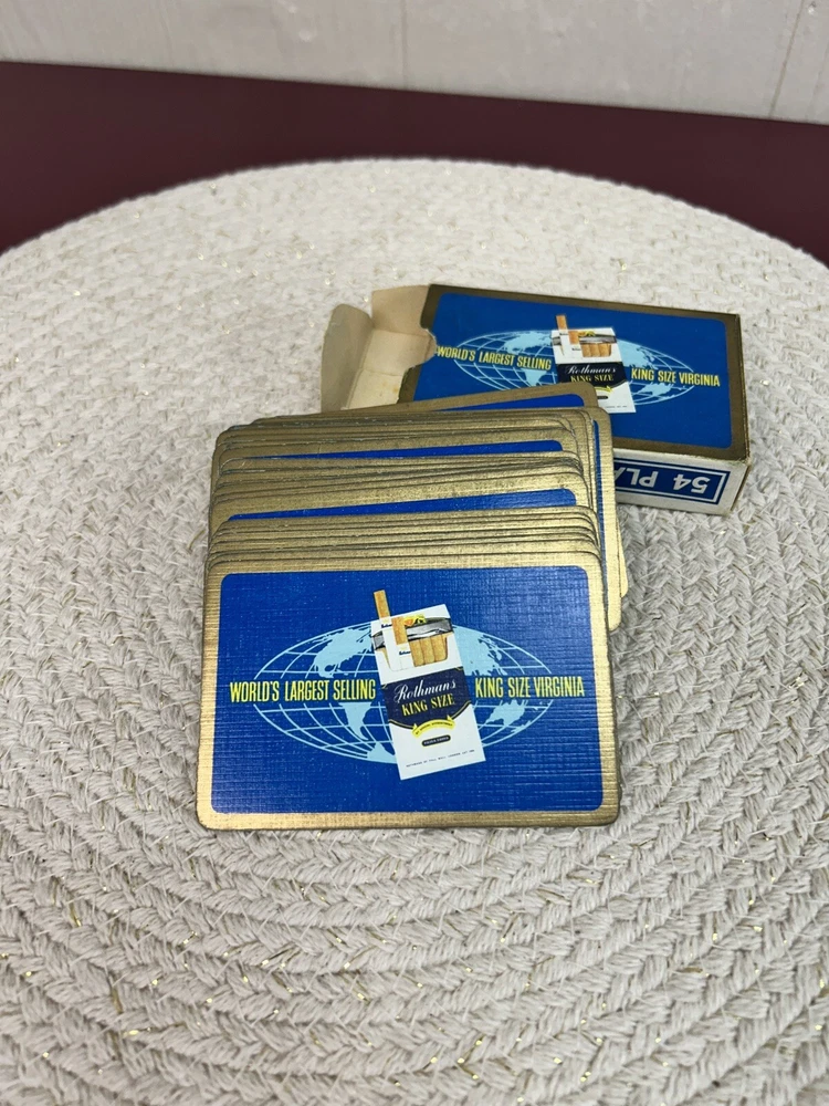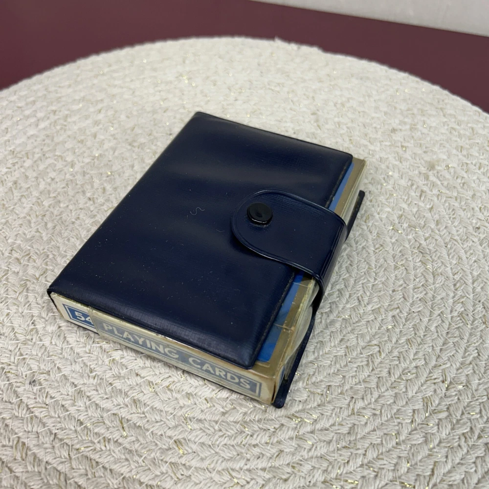 This is a double pack of playing cards that are on linen. They are embossed . The two pack is in a plastic carrying case. It has a snap closure. The boxes of the cards have seen where and obvious usage. The cards on the inside are in good condition . Unknown as to where these are made, but the outside of the box does say “ for eign”.