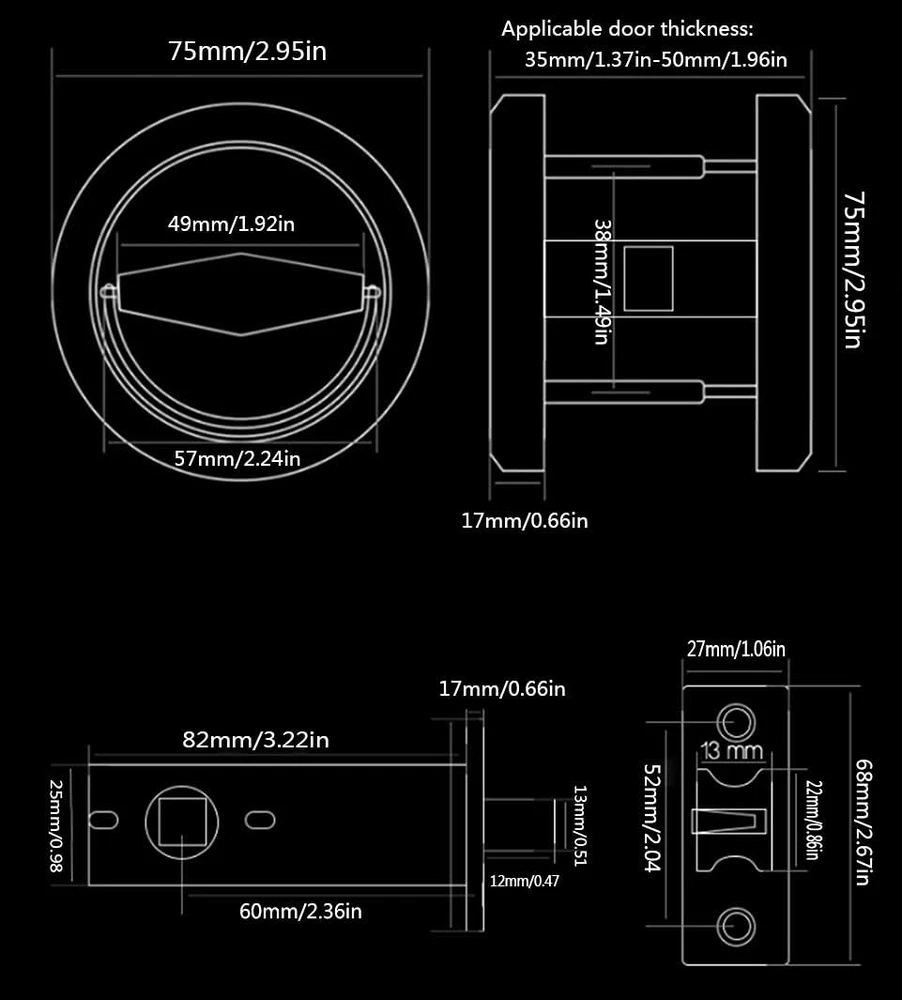 Store New Arrivals Add to Favorite View Feedback Contact round Pocket Door Lock,Passage Door Handle Lock Knobs Lockset-No Keys,Privacy Door Latch Lock,Stainless Steel 304 Storeroom Locks,Bed Room,Kitchen,Bathroom,Laundry Room Doors Privacy Lock Description Item model number 1 Style Modern Handle Type Knob Number of Items 1 Pattern No key Country of Origin China Handle Attachment Mechanism Ring/Cup Batteries Included? No Customer Package Type FFP Unit Count 1.0 Count Room Type Bed Room, Kitchen, Bathroom, Laundry Room Finish Brushed Special Feature Rustproof, Adjustable Material Stainless Steel Item Depth [LE] 5 inches Handle Material Stainless Steel Pattern Name No key Shape Round Finish Type Brushed Metal Type Stainless Steel Specific Uses For Product Door Item Package Quantity 1 Indoor/Outdoor Usage Indoor Batteries Required? No Item Weight 14 ounces Size Medium Lock Type Deadbolt Lock Special Features Rustproof, Adjustable Exterior Finish Stainless Steel Part Number 1 Color Silver Hand Orientation Ambidextrous Center To Center Spacing 60 Millimeters Included Components Lock And Key Product Dimensions 7.4"L x 7"W Number Of Pieces 1 Privacy Door Locks are made of 304 stainless steel material. The surface is processed by brushed finish. It is fireproof and rustproof, more durable for using. Handle set has a door handle on both sides of the door. This deadbolt can be reversed for doors that both open left to right as well as right to left.The rotatable pull handle can be hidden in the center part of the door pull. The round door cup ring is beautiful and generous, with smooth edges. The diameter of the sliding door handle is 2.9 in (74 mm). The length between the screw install holes are 1.5 in (38mm).Easy installation, fits door 35 mm-50 mm thickness, Suits 55mm diameter holes, ( If your door is thin, you can cut connection bar to be shorter to install). Uses - Perfect for Bed/Storeroom/Privacy doors.Installation - Depending on your door, cutting may be required tensure our Cup Handle and Mortise Deadbolt fit your door perfectly. Suitable as corridor door locks, hidden door handles, sliding door lock, barn door handle, keyless door lock and so on. Small size also fit as cabinet lock or wardrobe door handle hardware. International products have separate terms, are sold from abroad and may differ from local products, including fit, age ratings, and language of product, labeling or instructions. ABOUT US We offer the best prices around on high quality products. Our E-store includes media such as books, movies, music and games while offering electronics, toys, sporting apparel, clothing, tools, general home, garden items and more. SHIPPING We are always working hard to ensure your package arrives as soon as possible. Please understand that some factors like weather, high postal traffic, and the performance of shipping companies are outside of our control. We offer free shipping to the lower 48 states and ship within 2 business days of payment, usually sooner. We do not accept P.O. Boxes. Please provide a physical address. For shipping outside of the continental USA, we only use eBay's Global Shipping Program.The item is shipped to KY and then sent to the rest of the world. International customers are responsible for all duties and taxes. Continue to check out in order to calculate costs for shipping the item to your country. Messages regarding eBay's Global Shipping Program MUST be directed at eBay EXCLUSIVELY. RETURNS We offer a 30-Day Return Policy on items which you are not completely satisfied with. You have the option for a full-refund or an exchange of the item. No returns are available on items shipped outside of the USA. PAYMENT We accept PayPal. CONTACT US This page content is yet to come Please ad us to your favorite seller and visit again later Thank You CUSTOMER SATISFACTION We try our very best to make sure every customer is completely satisfied. If there's a problem, message us! We're happy to help. WE ACCEPT Copyright © 2021 AutoDS. | All Rights Reserved