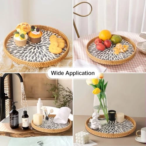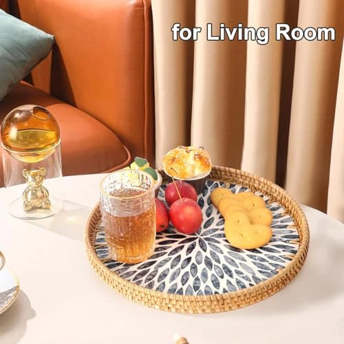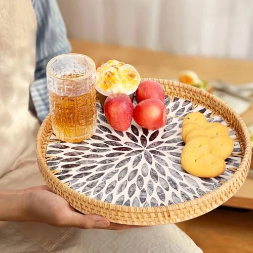 Return Policy Fast Delivery Trusted seller Round Rattan Tray with Mother of Pearl Inlay, Rattan Serving Tray for Coffee, Bread, Fruits, Decorative Wicker Tray for Table Decor, Home Decor, Kitchen Island Decor (Dark Blue Leaf, 11.8") Product Description ★Size and Style: 11.8" Diameter, Dark blue leaves pattern. ★Handwoven Natural Rattan Tray: This rattan tray is hand-woven from rattan, with strong wood core. The mother of pearl inlay on the surface with a glossy lacquer, only need wipe this tray with a damp cloth to clean it ★Easy to Pick and Non-slip: Rubber on the bottom of the tray is designed to prevent slipping, it a durable practical decorative tray for cup, dishes, coffee, tea ★Wide Application: This wicker serving tray be used for storaging fruit, bread, food, coffee, tea, vanity, perfume, jewelry, coins, keys ★Good Decor: A good decorative tray for coffee table, ottoman, bathroom, bed, home, living room, hotel, restaurant, office Shipping Returns Payment Shipping Shipping is FREE to all addresses other than APO/PO boxes in the lower 48 states. All our stock ships from US-based warehouses. Shipped via USPS or UPS (depending on location and package weight) Unless stated otherwise, all orders will ship within 24-72 hours of your payment being processed. Check our feedback to see the great reviews of FAST shipping we offer. Returns Seller does not accept returns Payment We currently accept payment via eBay managed payments only. Once payment is cleared, we will dispatch your shipment within 1-3 business days. Please refer to the "Shipping" tab for more information regarding shipping speed to your destination.