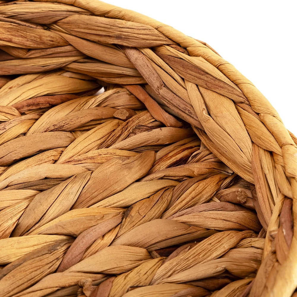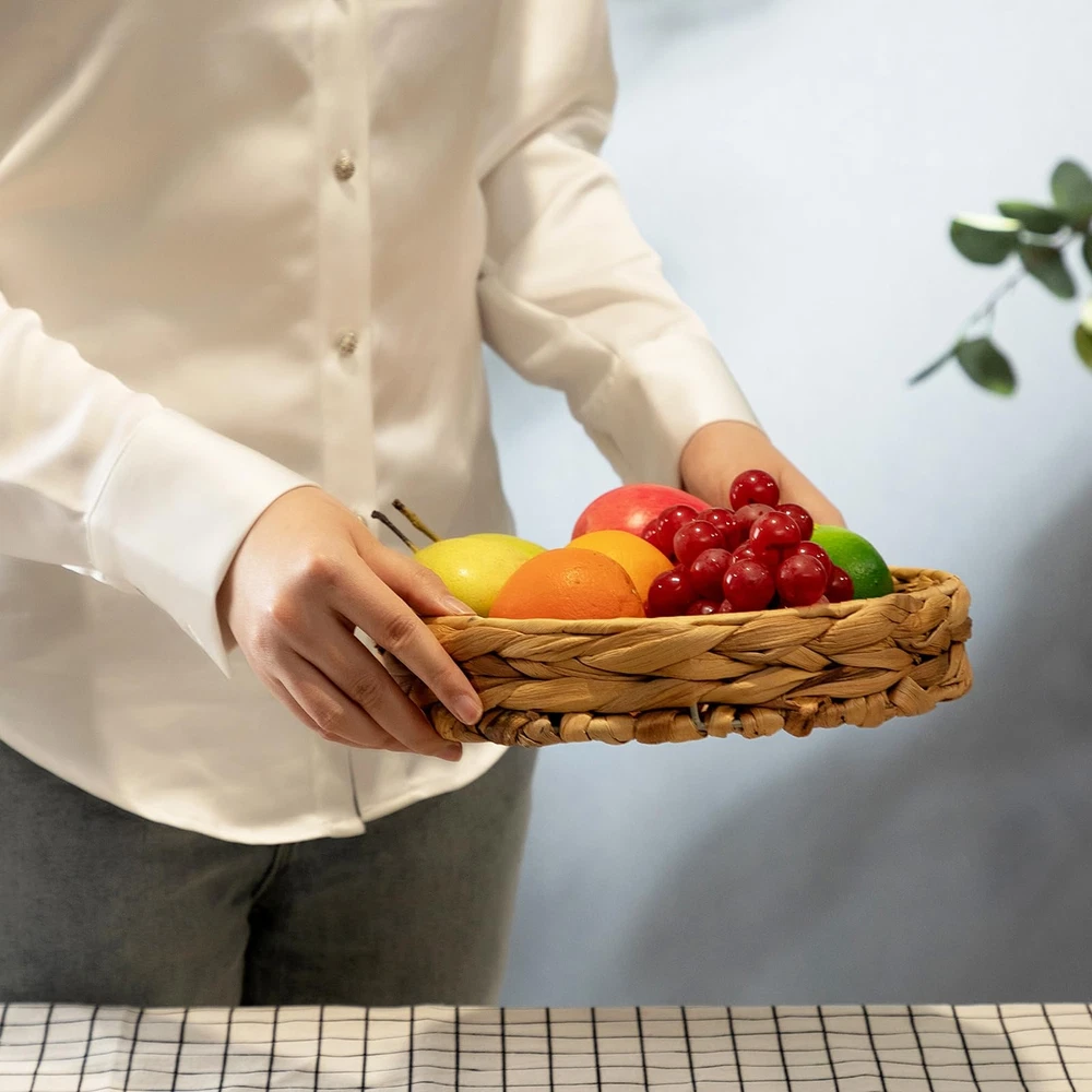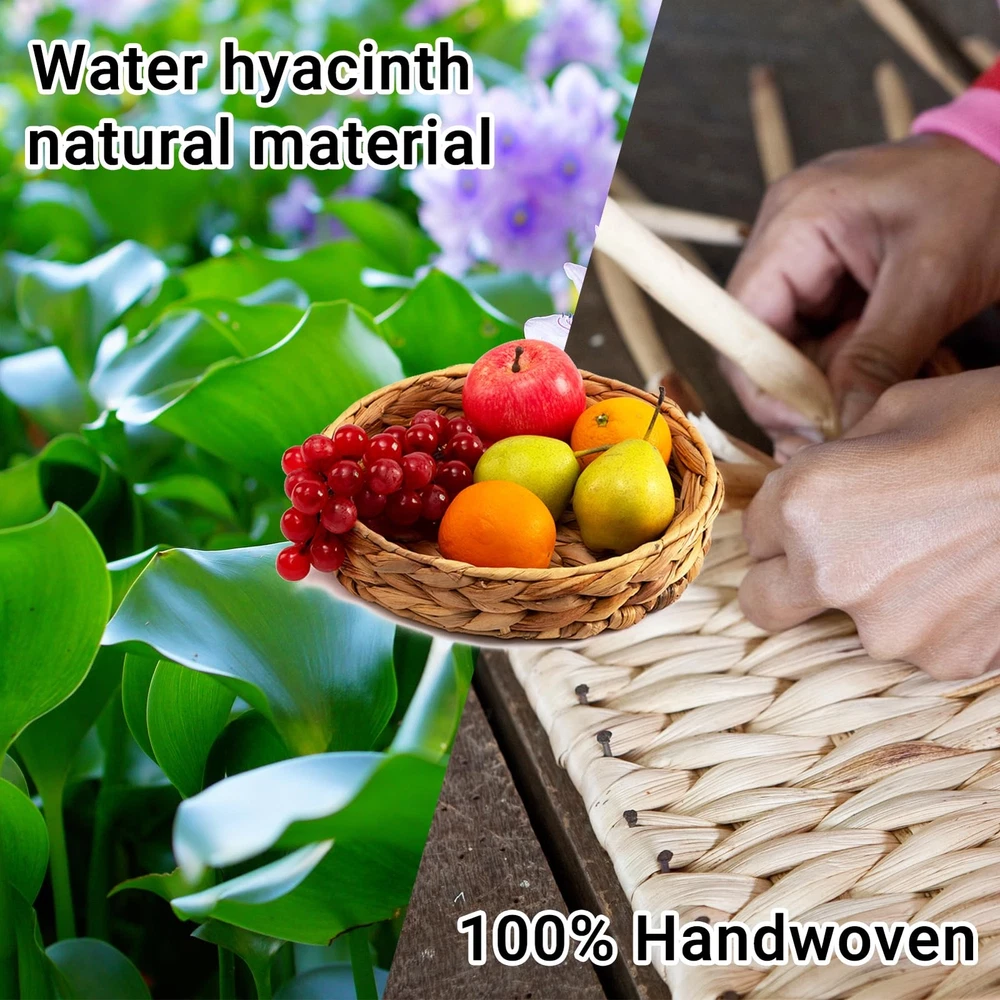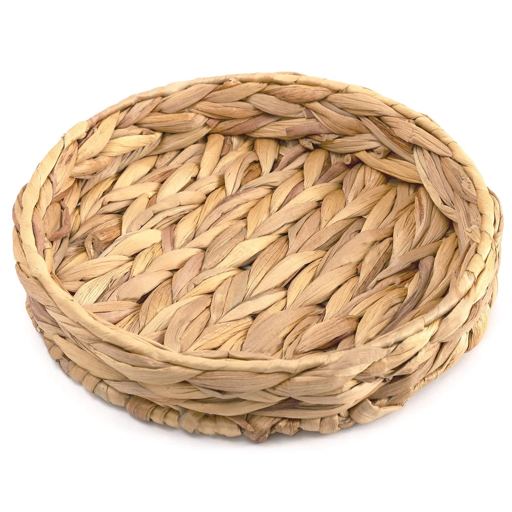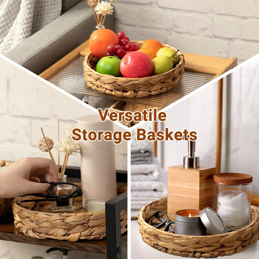 Our round wicker storage basket measures 9.8"L x 9.8"W x 2"H. Decorative water hyacinth tray for organizing. Size may vary within 1/4inch due to handwoven design DURABLE NATURAL BASKETS for ORGANIZING. Carefully handcrafted by skilled craftmen from 100% clean water hyacinth material and a steel frame for strength ADORABLE HIGH QUALITY TRAY. With natural colors mixed with hand-woven textures, our pantry baskets can be a versatile décor in your home. Both functional and decorative, can be used for a long time VERSATILE STORAGE BASKETS. The rustic wicker basket is ideal for holding hand towels, condiments, toiletries, makeups, fruits, snacks and clutters. Great for kitchens, pantries, bathrooms, living rooms, etc. Our woven trays can be stacked for easy storage when not in use. Please place in a dry and ventilated place. Periodically sun-dry to avoid mold and mildew. Easy clean with a dry towel. If you have any questions, please contact us and we will give you a satisfactory reply