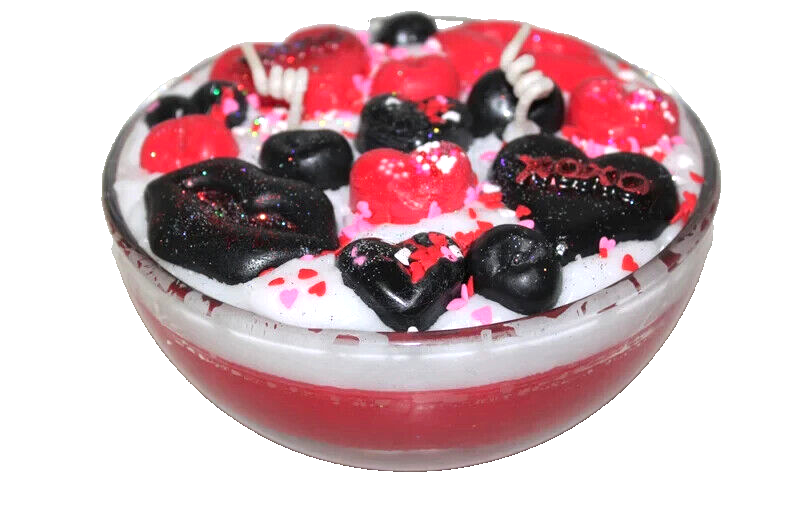 **** SHIPPING IS OFTEN CALCULATED HIGH WHEN PURCHASING MORE THAN 1 ITEM SO FEEL FREE TO MESSAGE ME FOR A SHIPPING QUOTE **** When combining purchases please click on "request total from seller" at checkout and wait for me to send you a invoice with combined shipping. If you are using your phone this option may not be available and if so just message me and I can make you a listing with everything combined and the correct amount on shipping. Thank You ;) This is my handmade highly scented Valentine's bowl candle. The bowl is 6" x 3". On top of the candle I put pieces of very real looking wax candy chocolates, lips, hearts, cherries, sprinkles and glitter. It is highly scented in ROYAL CHERRIES JUBILEE. This exquisite cherry aroma begins with top notes of wild cherries, fresh berries, and sweet peaches. Next, you will find notes of spicy cinnamon, clove, and orange zest! Finally, notes of geranium, violet, and vanilla anchor this festive fragrance. International Buyers : Please contact me for shipping quote. Caution: Failure to follow instructions could result in fire hazard injury, or smoke damage. Keep wax free of matches, wick trimmings, or other flammable materials. Keep wick centered & trimmed to 1/4" to prevent smoking & soot build up on container or other items. Burn only on stable heat resistant surface for not more than 4 hours at a time. Keep out of drafts. Discontinue use when only 1/2" wax remains on bottom. Do not move candle while burning or if wax is hot. Keep out of reach of children & pets. Never leave a burning candle unattended. Shipping I strive to ship within 48 hours of payment received not including weekends and holidays. I ship USPS Priority or Parcel Post and for the heavier orders I can ship Fed-Ex. I do offer USPS Flat Rate shipping as well. Insurance is the buyers responsibility. I am always happy to combine auctions to save you money on shipping fees. Please email with any shipping questions or quotes if needed. Thanks for stopping by! Please do come back again soon~ *** Please note I do not accept returns for used merchandise. Must be returned in same condition as received. *** RETURNS ARE ONLY ACCEPTED IF ITEM HAS BEEN MISREPRESENTED