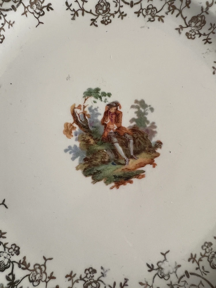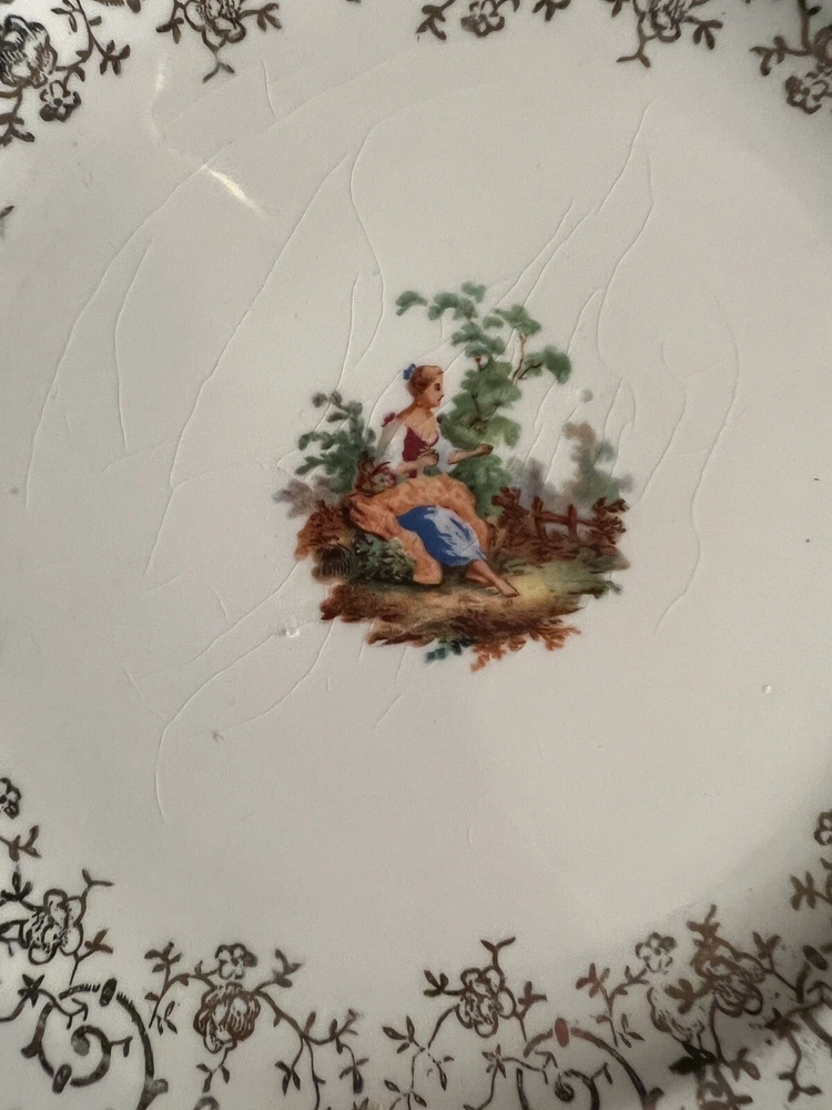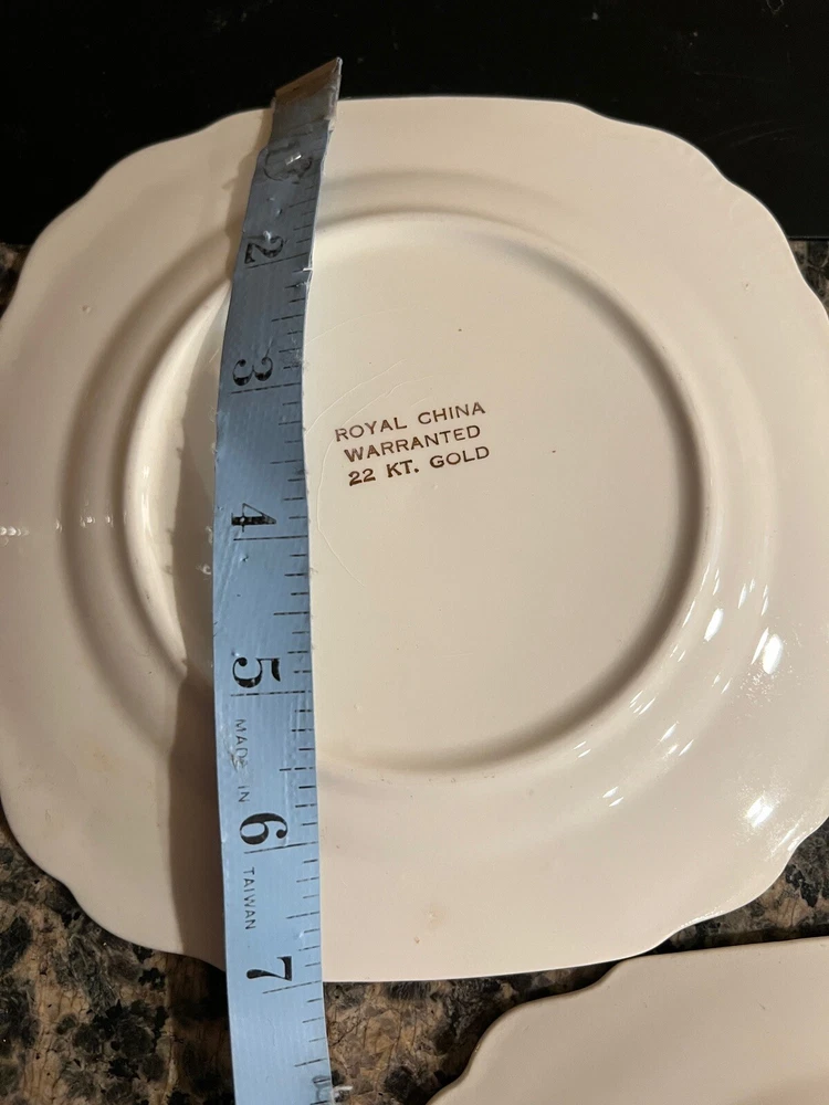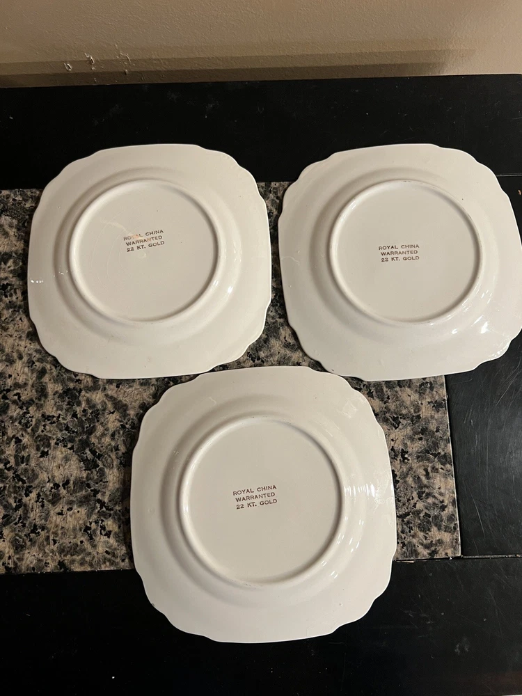 Vintage Royal China Warranted 22kt Gold Square Snack Cheese Salad Dessert Plate Square Scalloped Edges. Scene in the middle. Gold lace ornament and pretty pattern around the rim Some crazing. See pics. The mark on the back clearly reads "Royal China," which was the name of a prolific company located in Sebring, Ohio. Royal was founded in 1934 during the aftermath of the Great Depression.