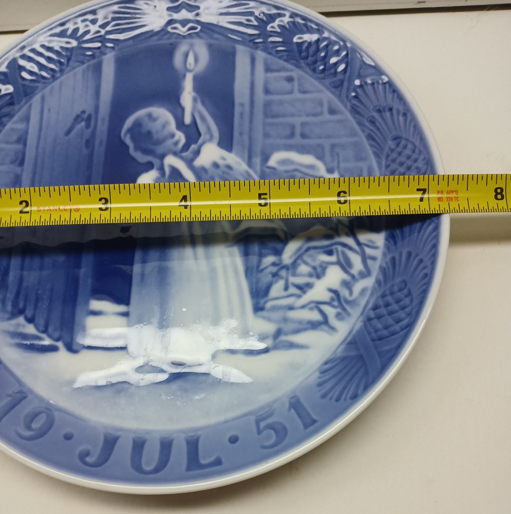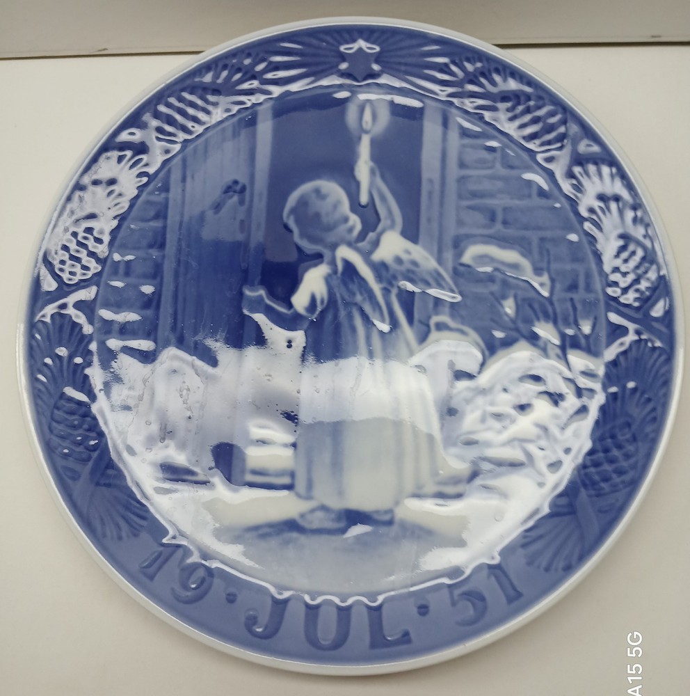 The Royal Copenhagen 1951 Christmas Plate titled "Christmas Angel" is an antique collector plate from Denmark. Made of blue porcelain, this round plate has a diameter of 7.25 inches and features a decorative Christmas theme with an angel. Produced in the 1950s, this vintage plate is part of a series of Christmas plates by Royal Copenhagen, known for their high-quality collectible items. Perfect for holiday decorations or for collectors of decorative plates, this piece showcases the craftsmanship and style of Danish porcelain art.