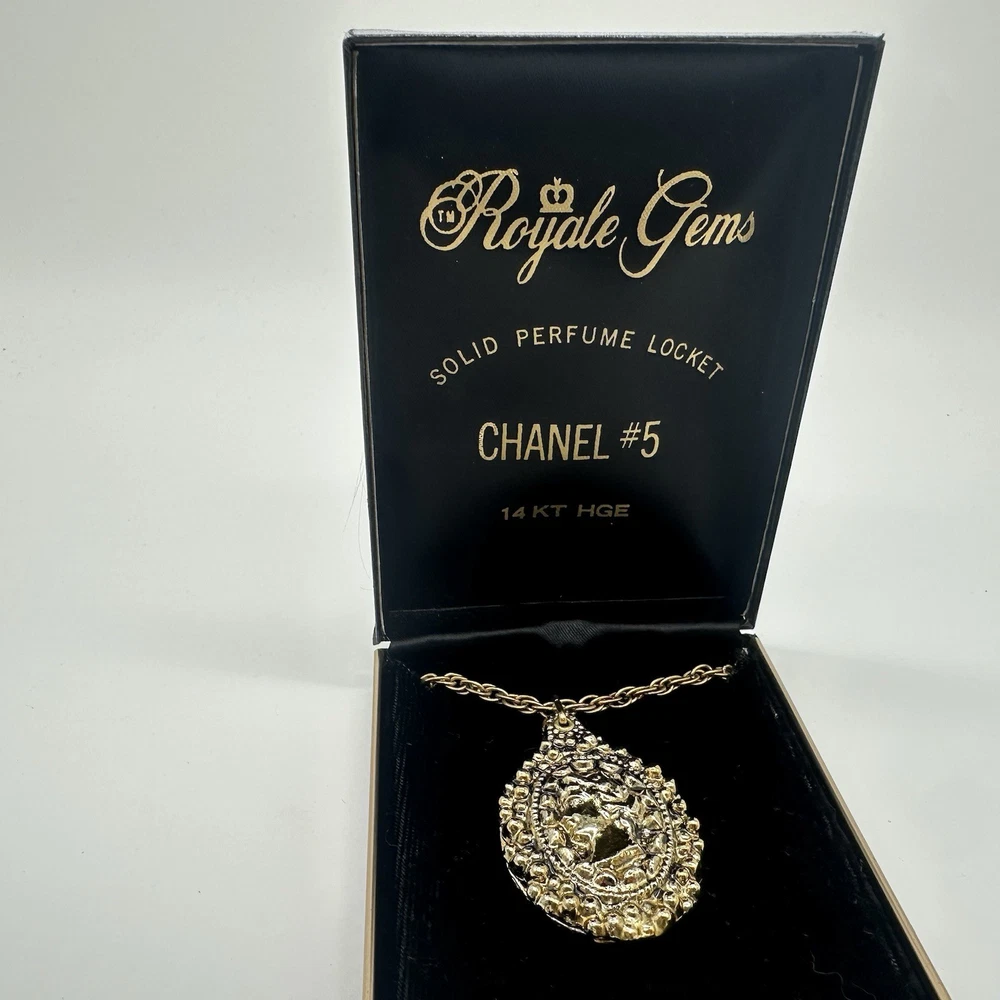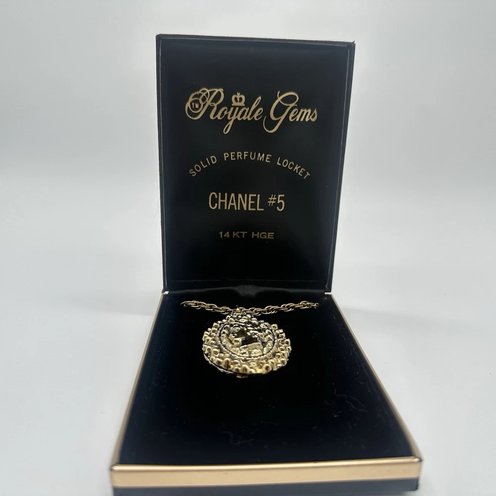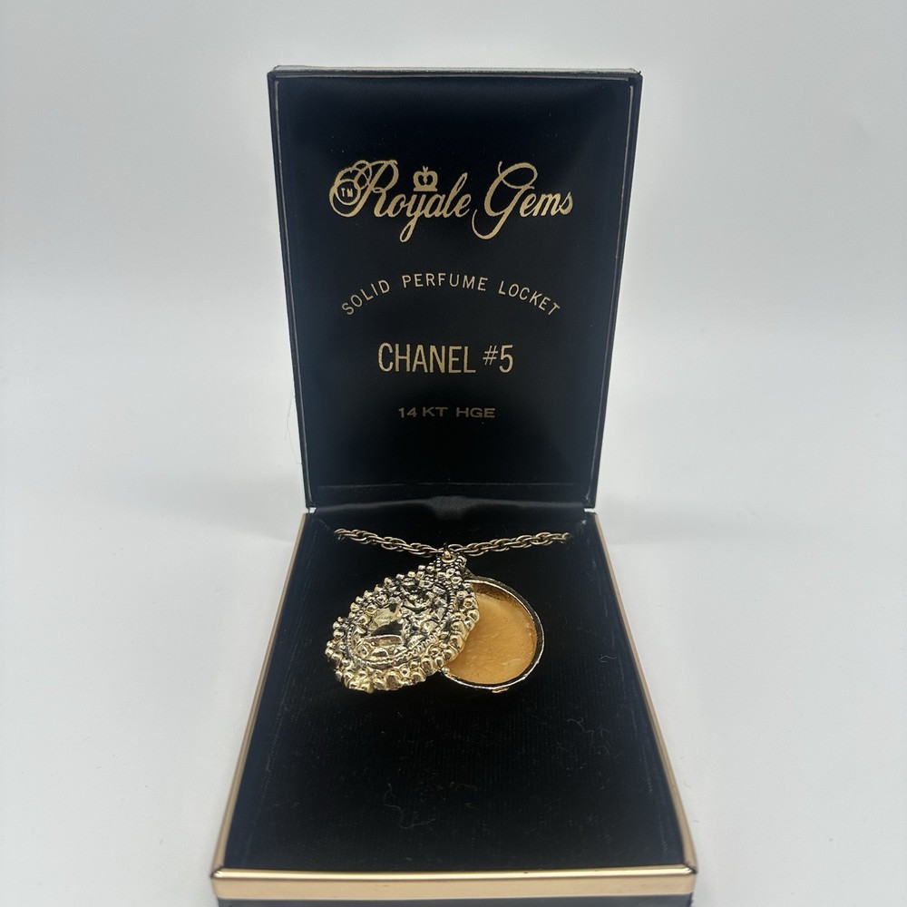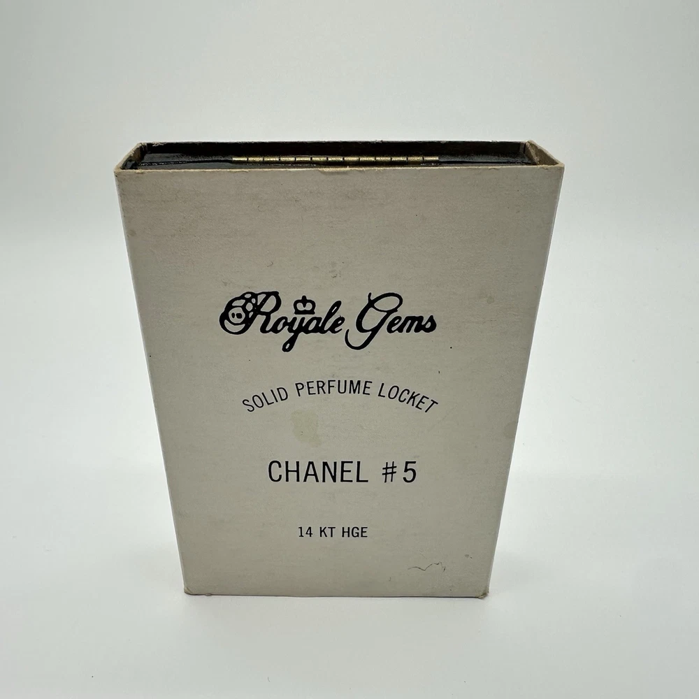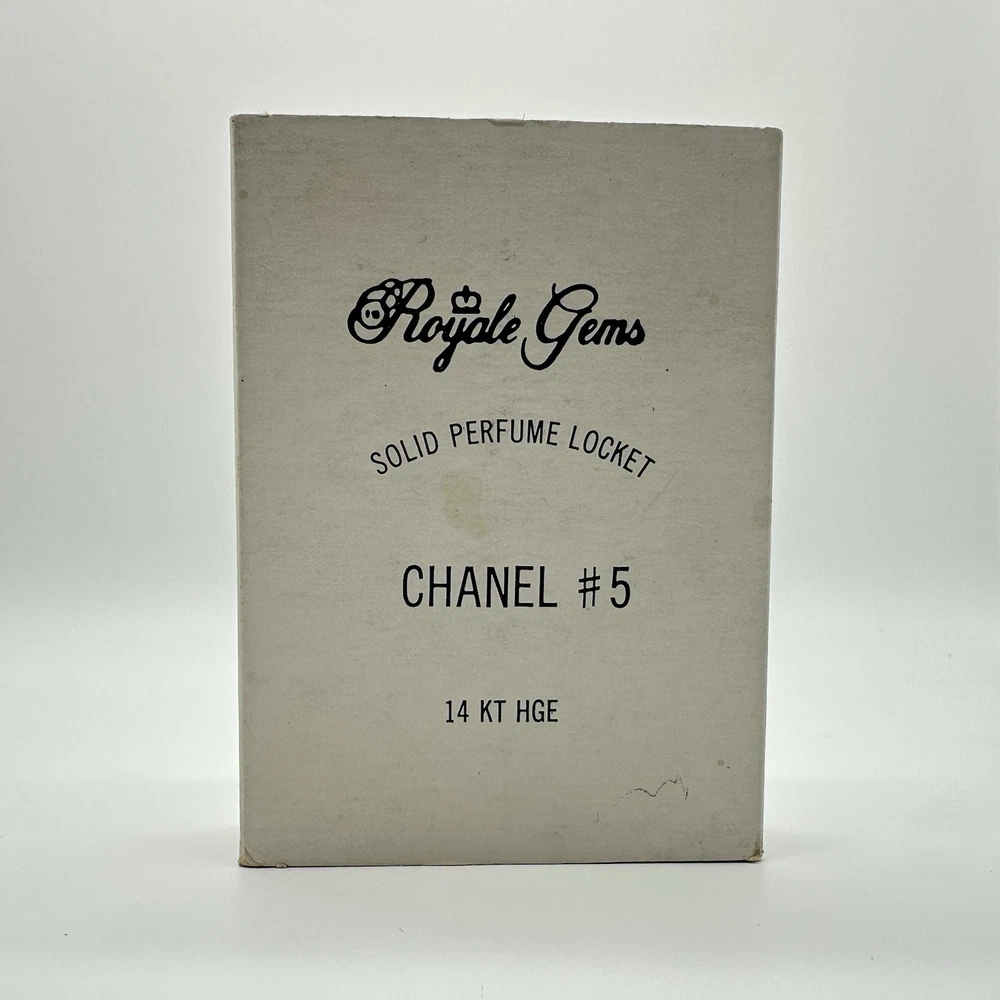 Royal Gems Solid Perfume Locket – Chanel No. 5 – 14 KT HGE – Original Box – Unused Perfume This beautiful vintage Royal Gems solid perfume locket features Chanel No. 5 perfume inside and is crafted with 14 KT HGE (Heavy Gold Electroplate) . Locket contains unused solid perfume Stamped 14 KT HGE (a 14 karat gold electroplate over base metal) Chain measures 24 inches long Locket measures 2 inches Comes in the original presentation box A stunning collectible piece that blends timeless style with iconic fragrance. Perfect for vintage perfume lovers or jewelry collectors.
