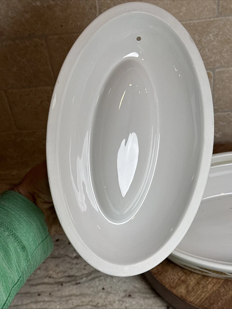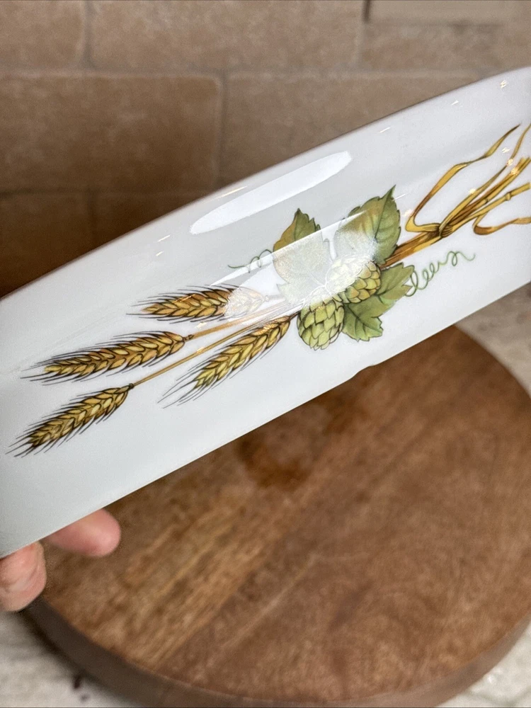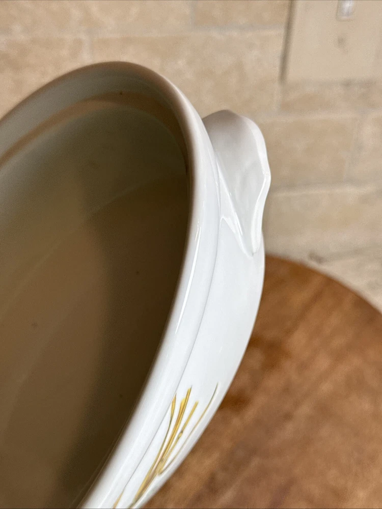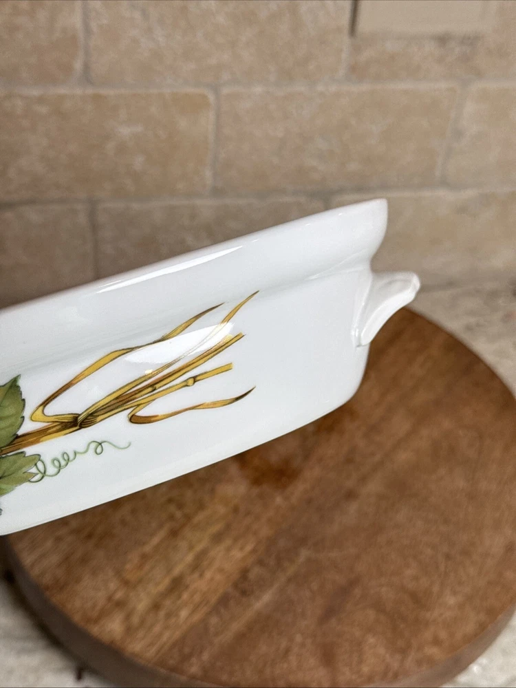 This is a gorgeous covered vegetable dish. There is a little smudging in the foot, that's about it - see photos. The sides of the dish have berries and shocks of wheat. The lid is covered with beautiful renderings of fruit. Bountiful harvest. • Length: 9 3/8 in • Height: 2 1/8 in • Special Characteristics: GLD HDLS • Porcelain • Crafted in England