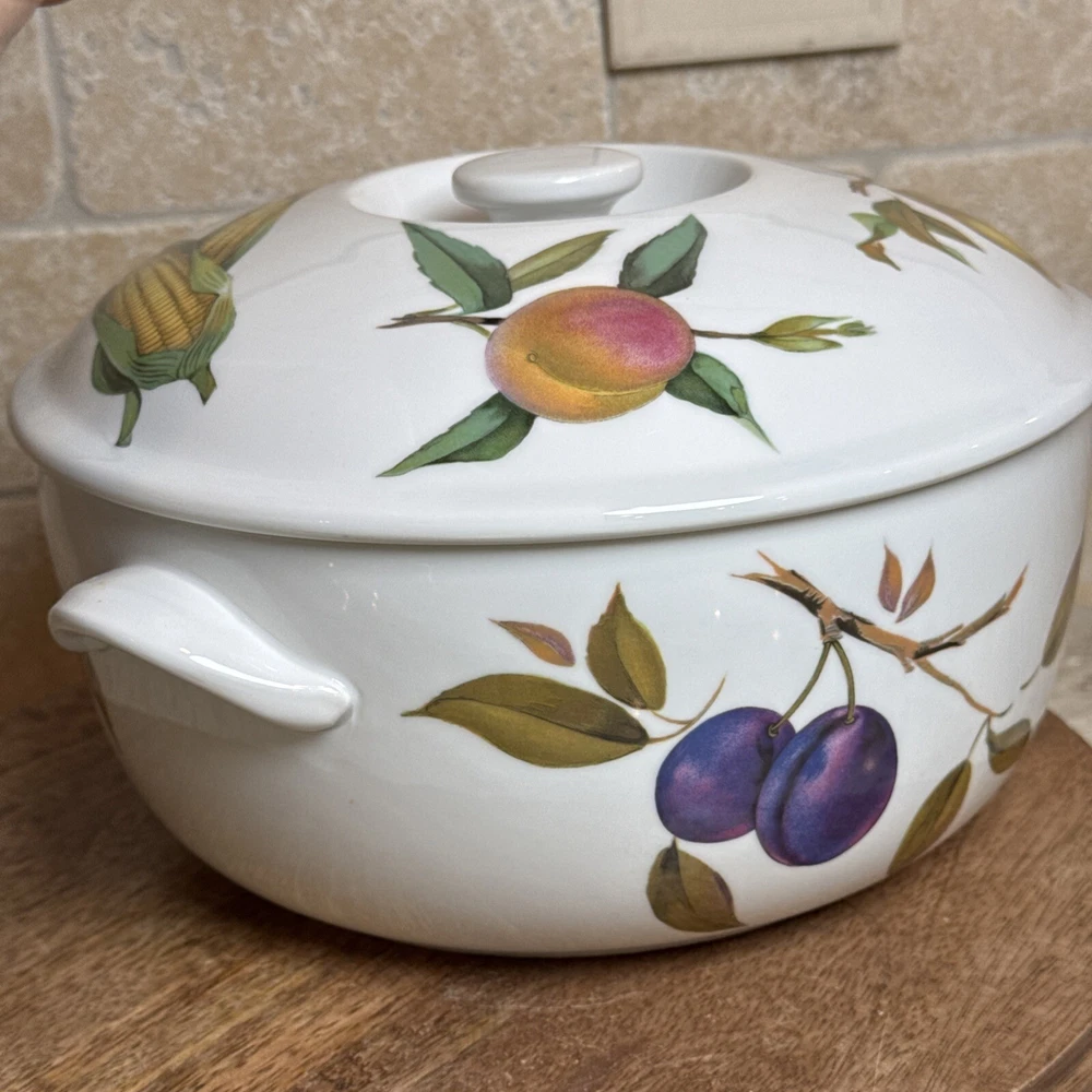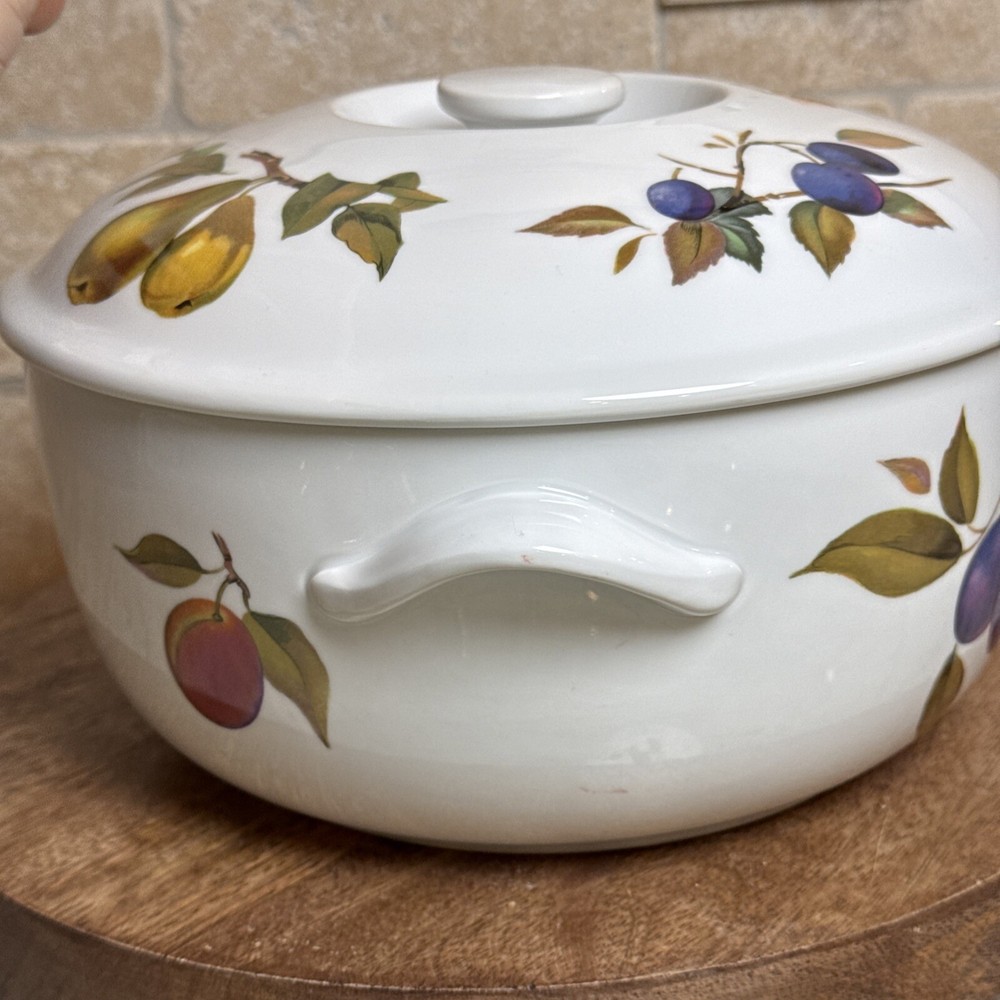 We have 4 total and all are in mint condition! A beautifully colored Royal Worcester Covered Casserole Dish decorated with sprigs of various fruits and ears of corn. The dish features gold colored handles with the lid highlighted in gold trim around the edge circumference and a gold knob. It is Made in England and hallmarked on the bottom. The Evesham pattern was first introduced in 1961 and is no longer being made. Capacity 2 1/2 Qt. to top. It measures approx. 10" Handle to Handle x 8 1/4" Diameter x 4" H. Overall height with the lid measures approx. 6"