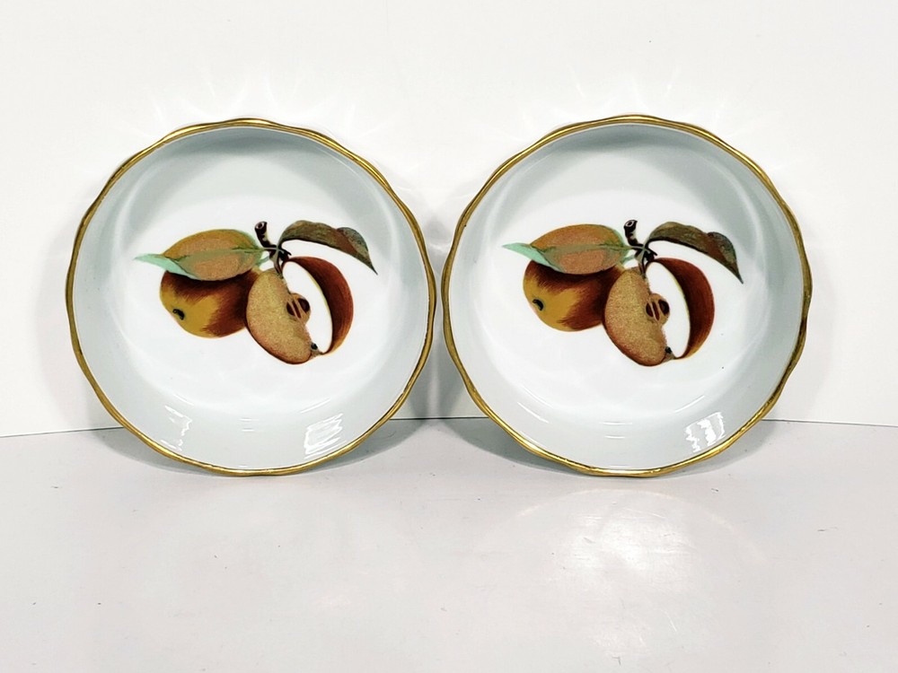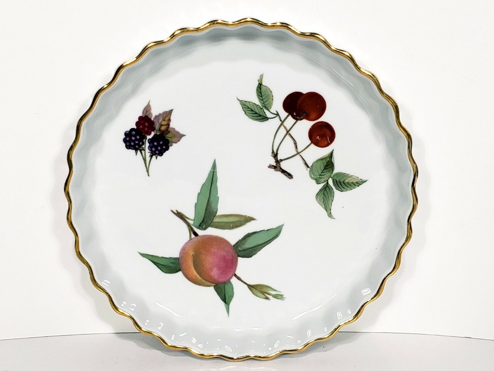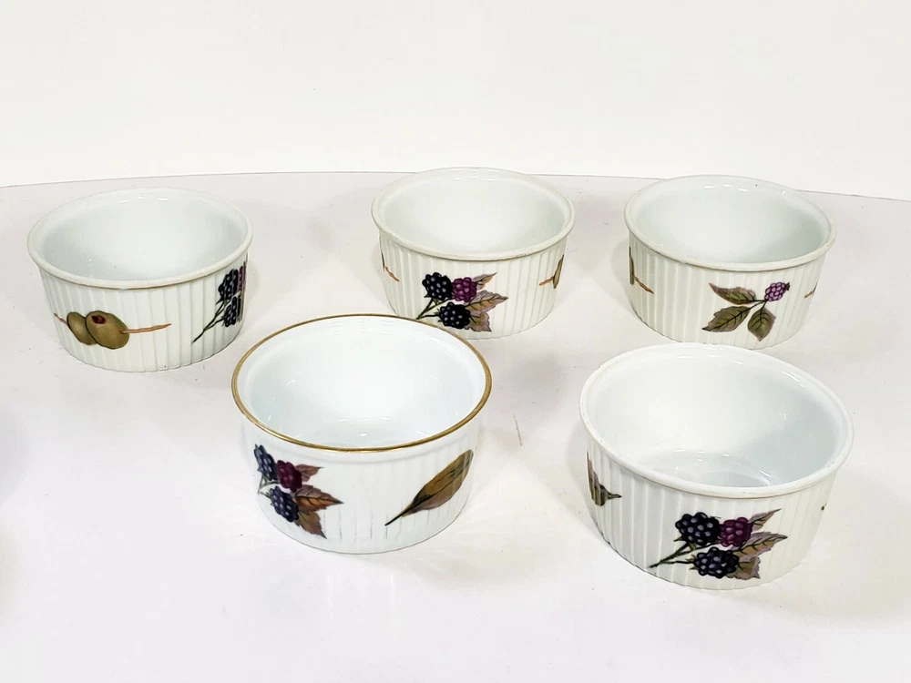 Royal Worcester Evesham Tarte Dish Ramikins Custard Cups Lot Of 8. All included 7 1/2" porcelain tarte dish Two 4" x 1 1/2" porcelain custard / souffle/ Ramikins Five 3"x 1 3/4" porcelain Ramikins All pcs are in excellent condition no chips or cracks